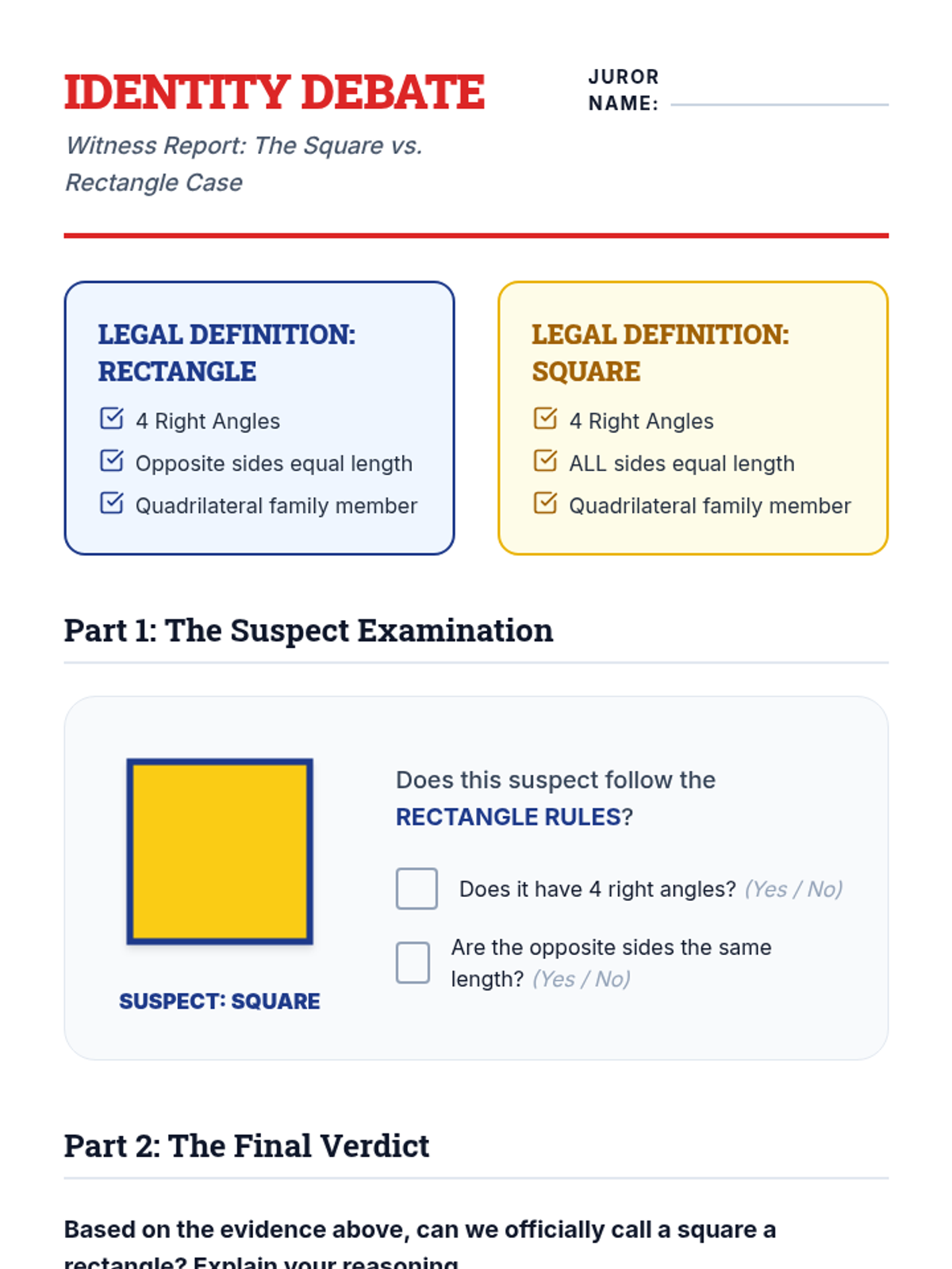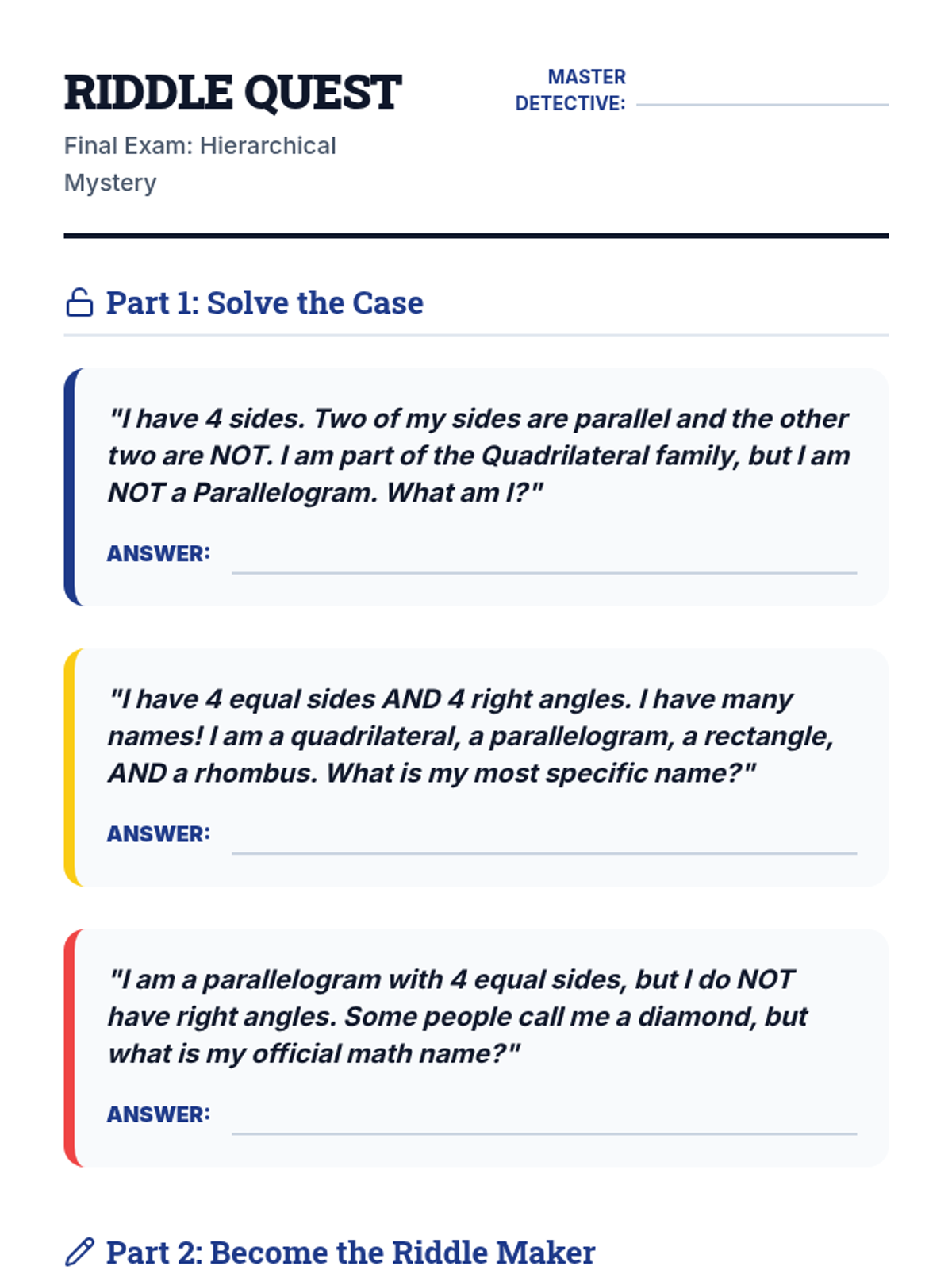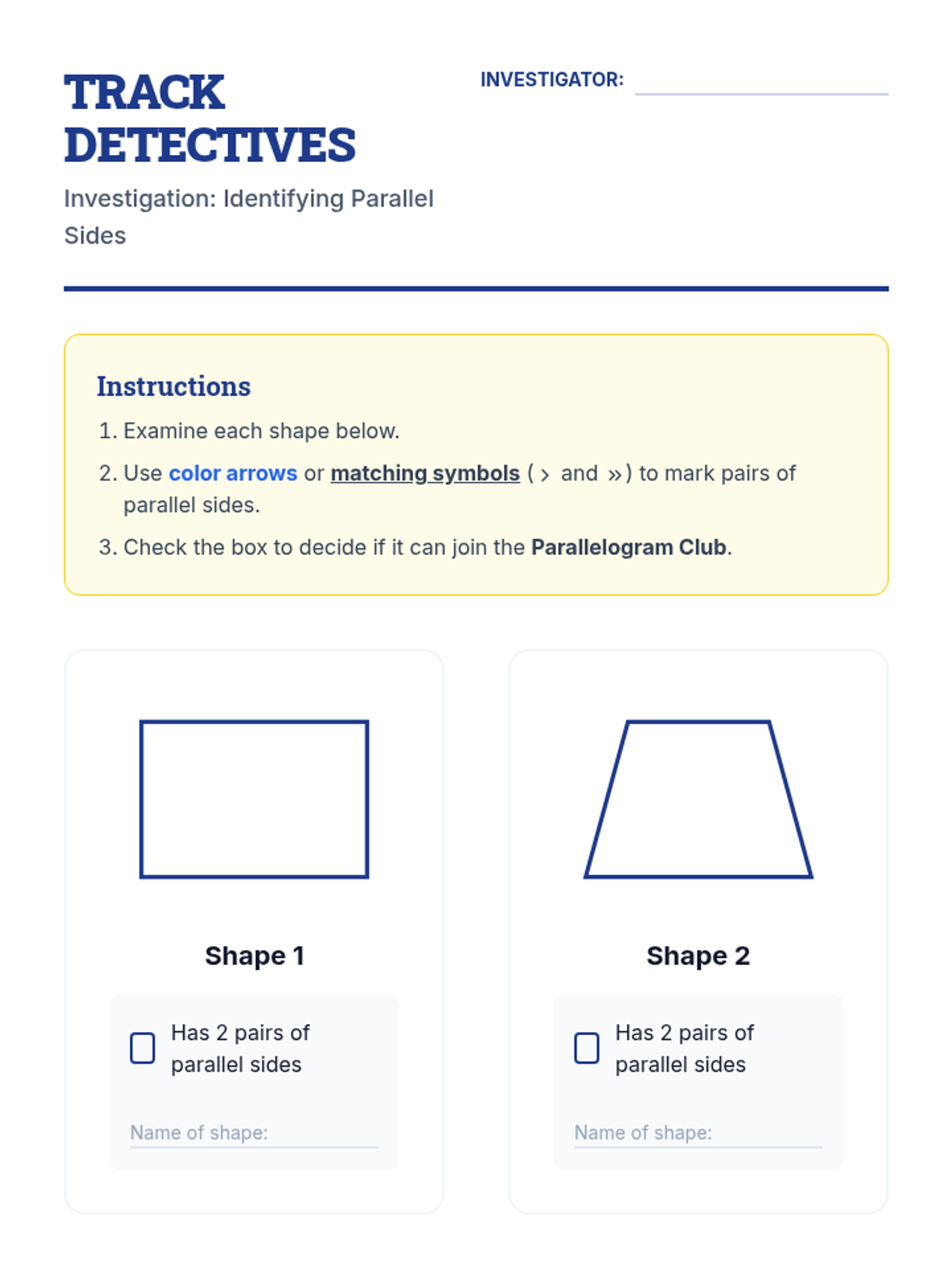 This geometry sequence guides 3rd-grade students through the hierarchical classification of quadrilaterals. Using a 'Shape Detective' theme, students investigate properties like side lengths, parallel lines, and right angles to understand how a single shape can belong to multiple categories simultaneously.