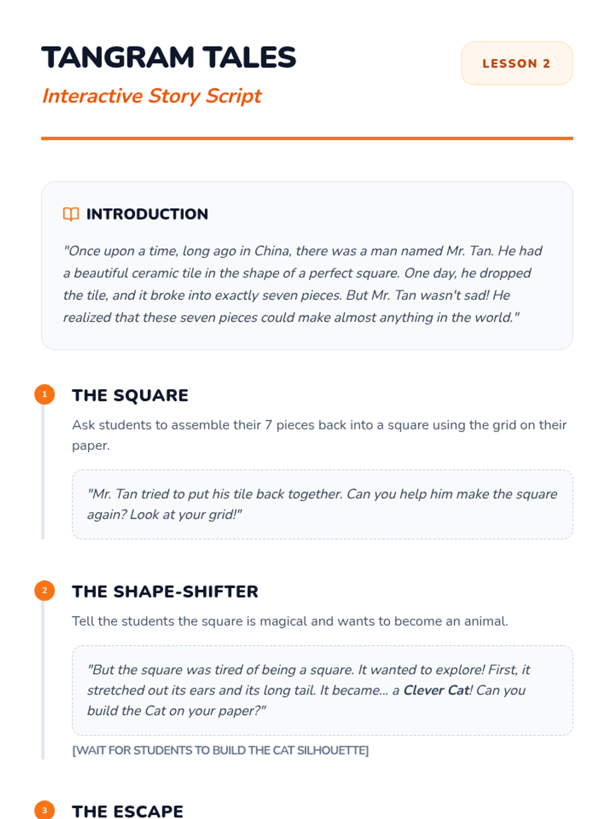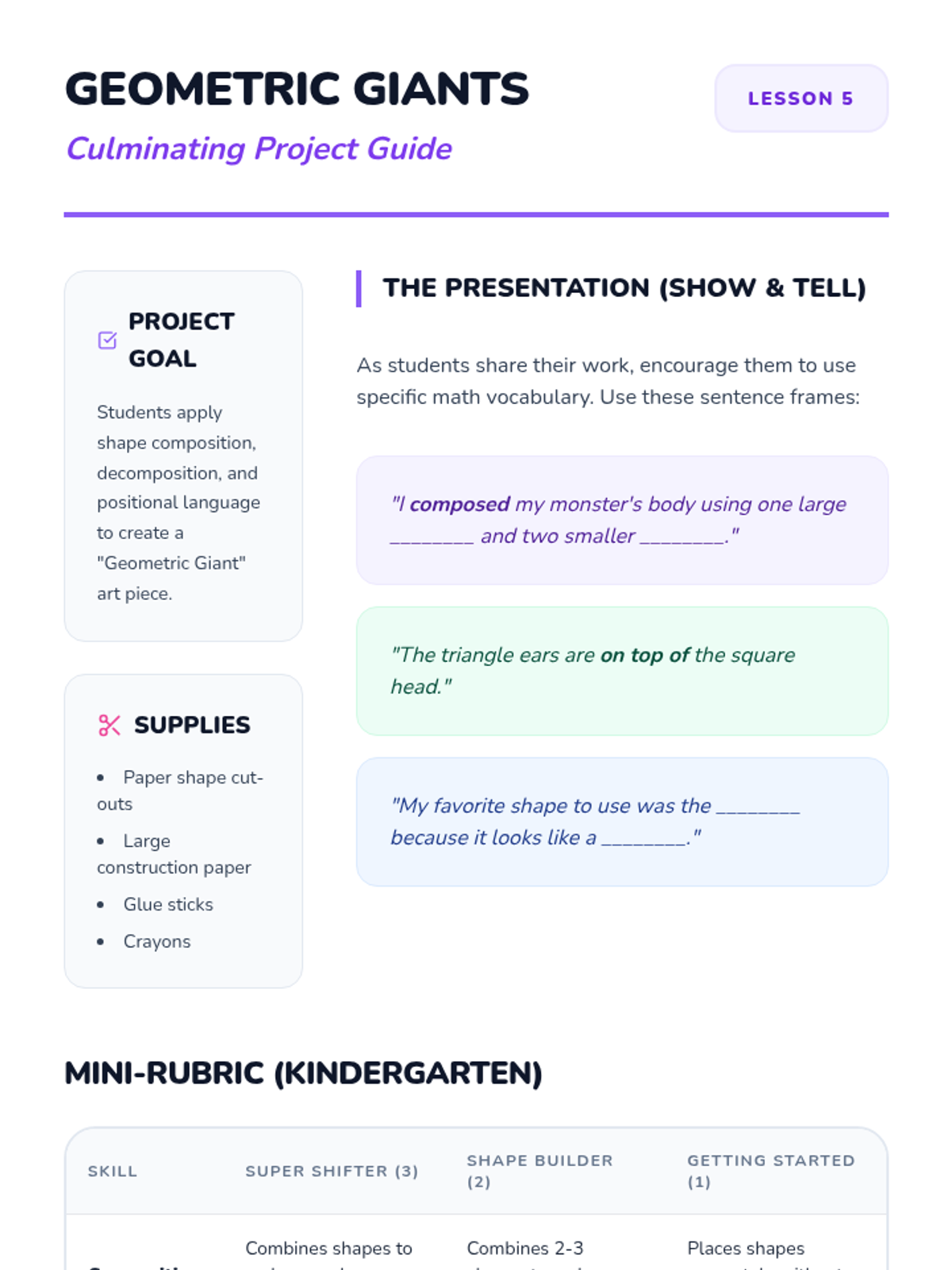 A Kindergarten geometry sequence focused on spatial reasoning and shape composition. Students learn to combine smaller shapes into larger figures, solve tangram puzzles, use positional language, and decompose composite shapes through hands-on play and creative art projects.