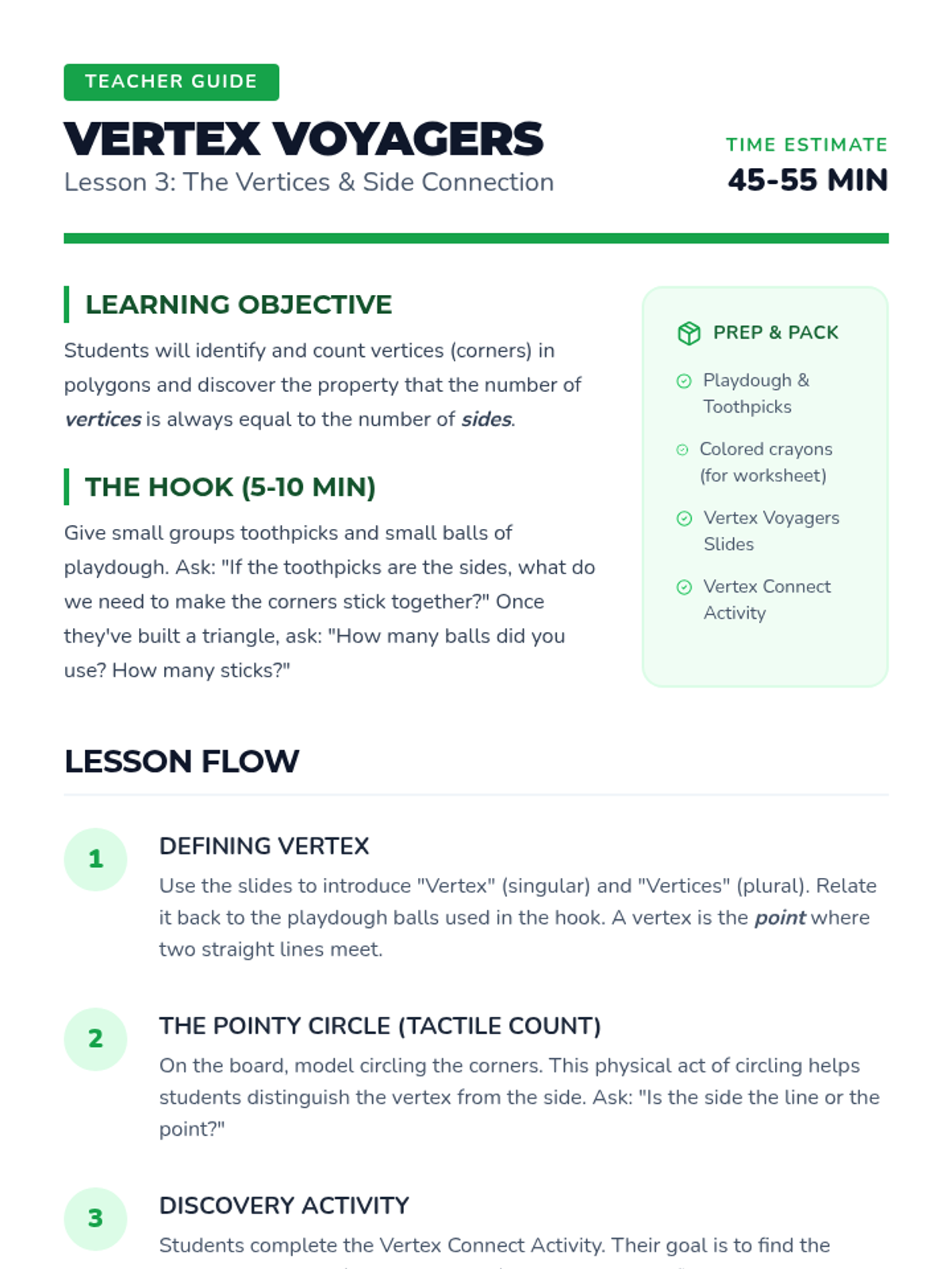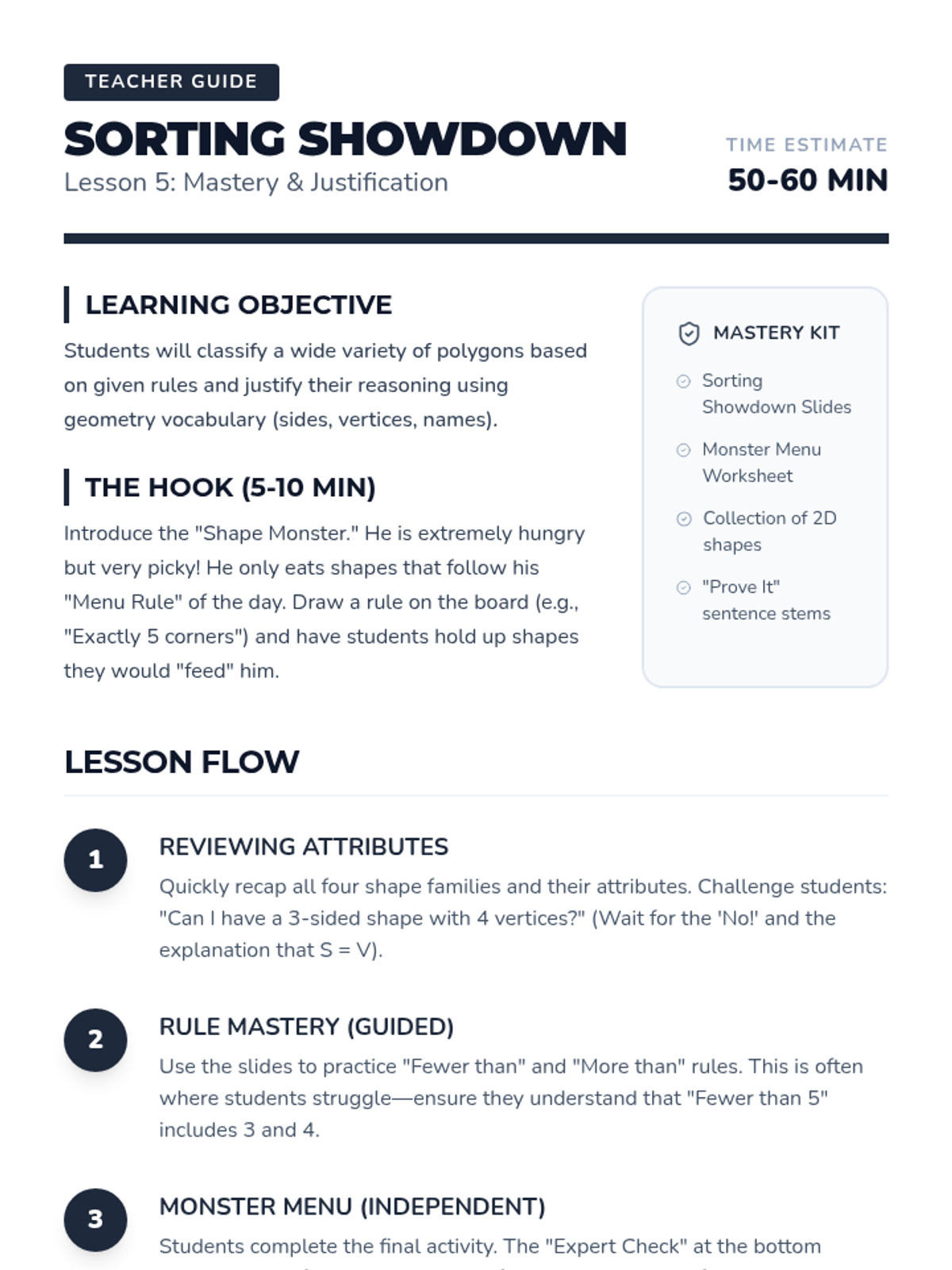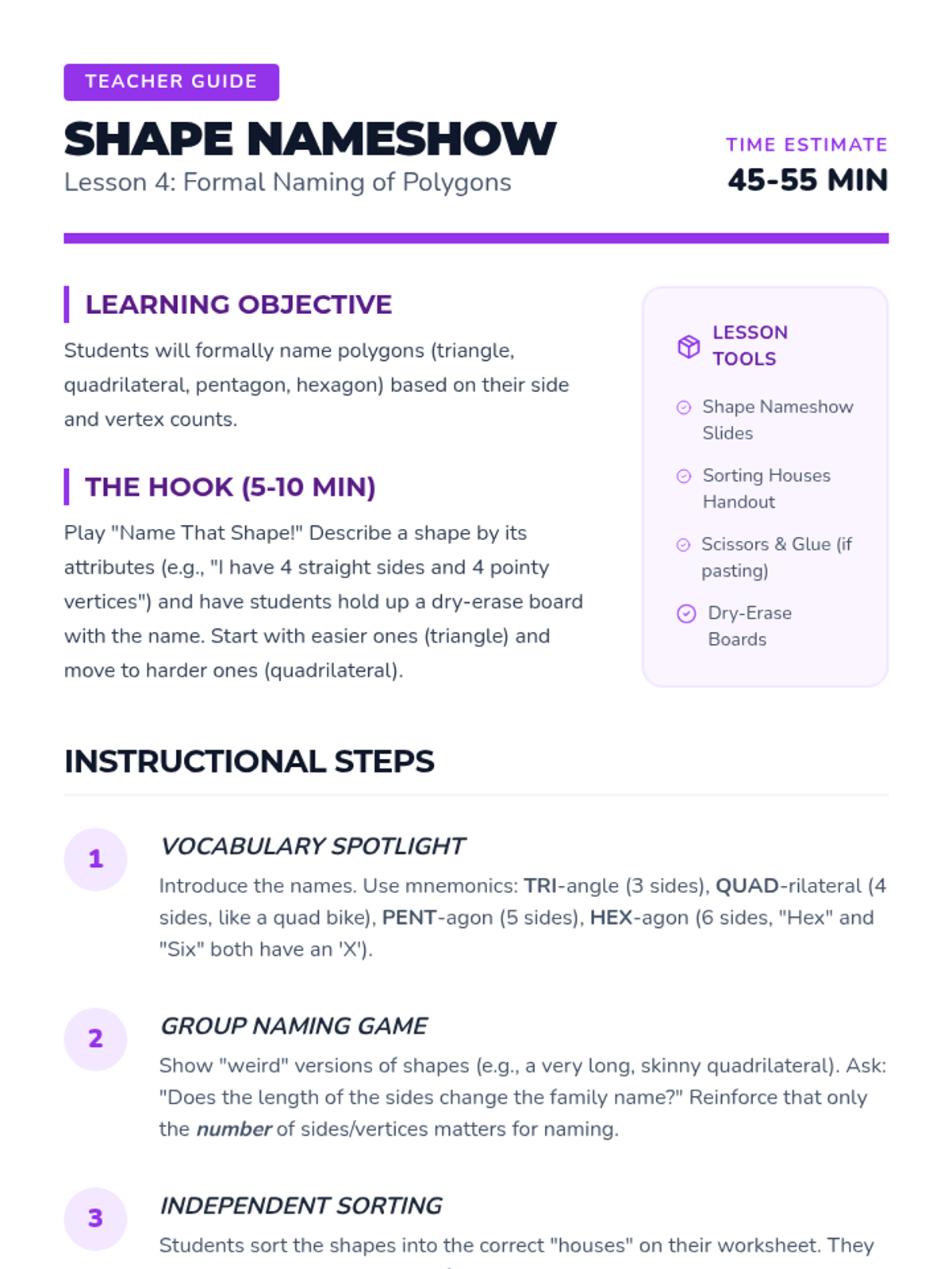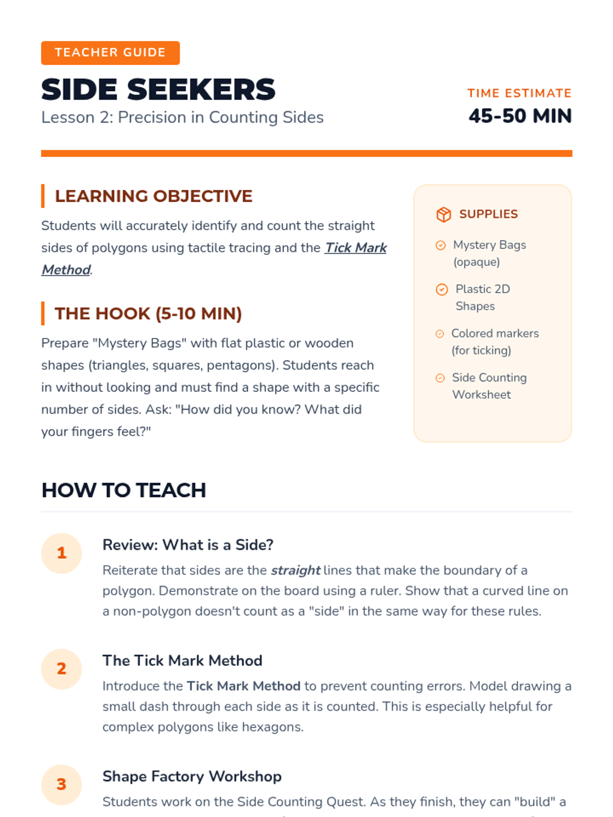 This geometry sequence for 2nd Grade introduces students to 2D figures by focusing on their attributes: sides and vertices. Students progress from distinguishing polygons from non-polygons to naming and sorting shapes like triangles, quadrilaterals, pentagons, and hexagons based on attribute counts.