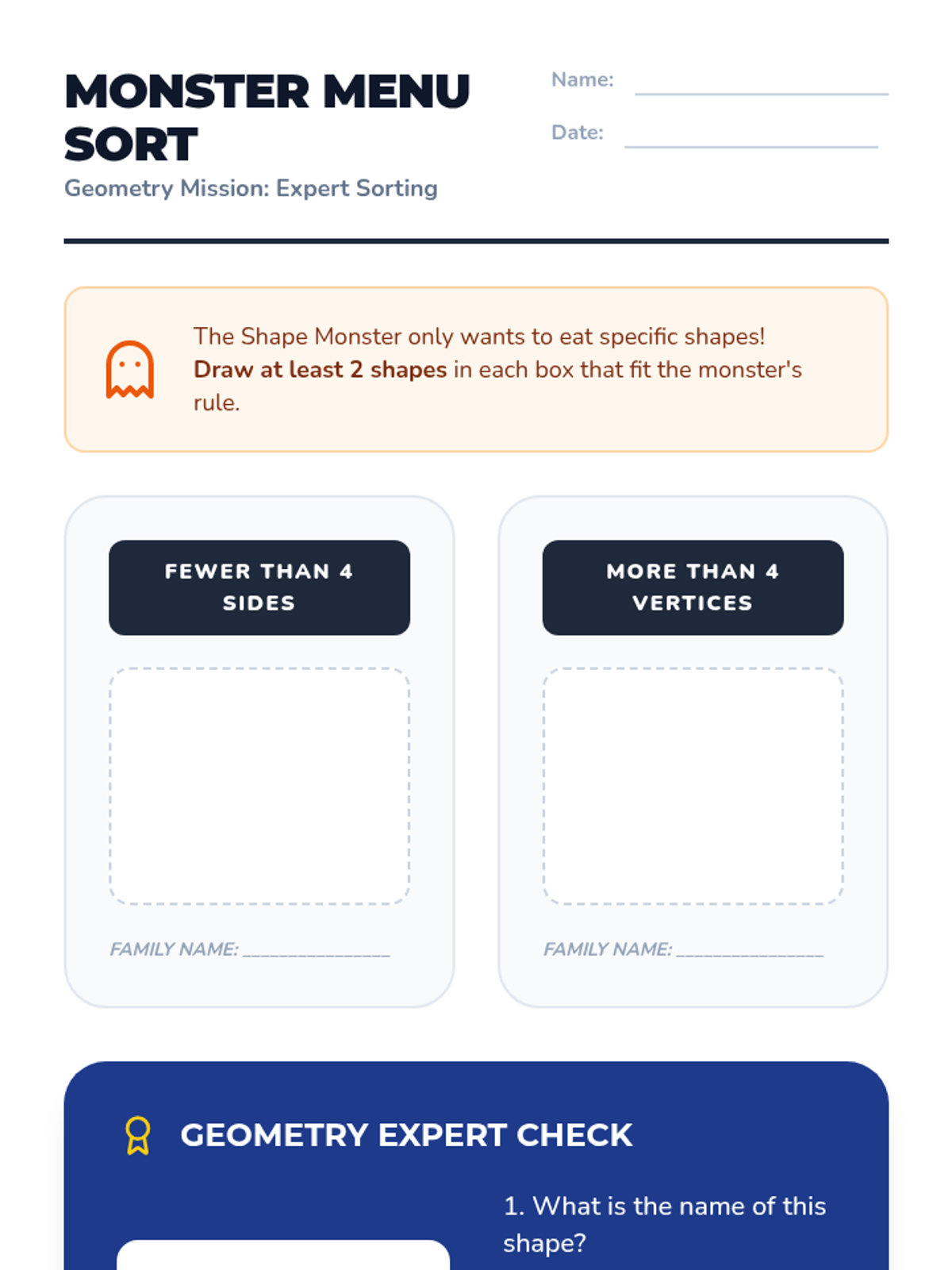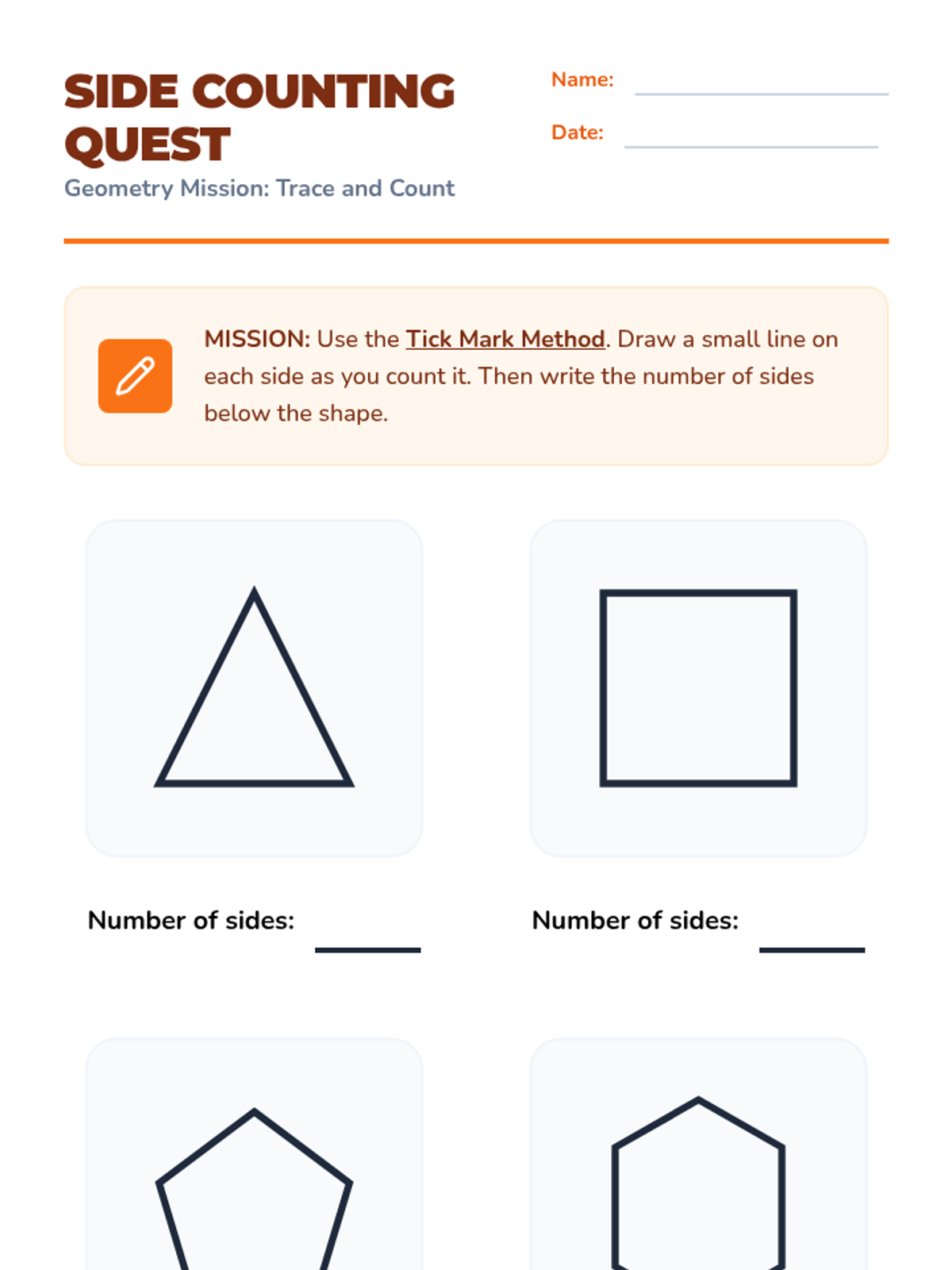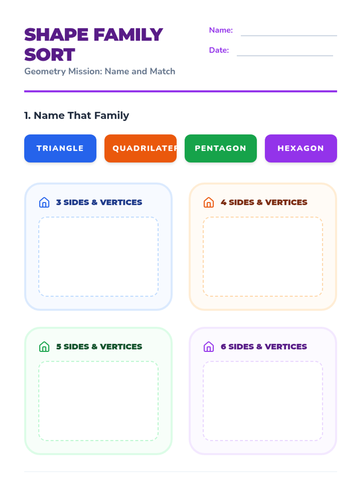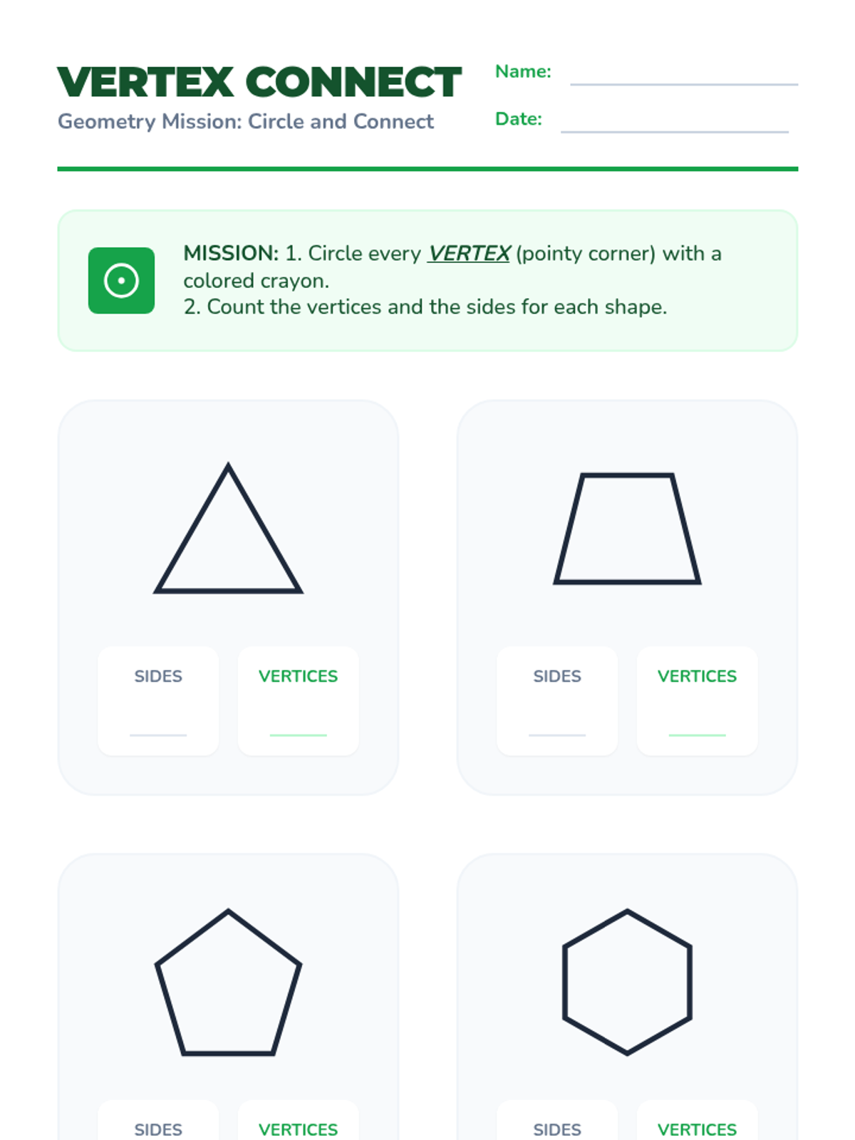 This geometry sequence for 2nd Grade introduces students to 2D figures by focusing on their attributes: sides and vertices. Students progress from distinguishing polygons from non-polygons to naming and sorting shapes like triangles, quadrilaterals, pentagons, and hexagons based on attribute counts.