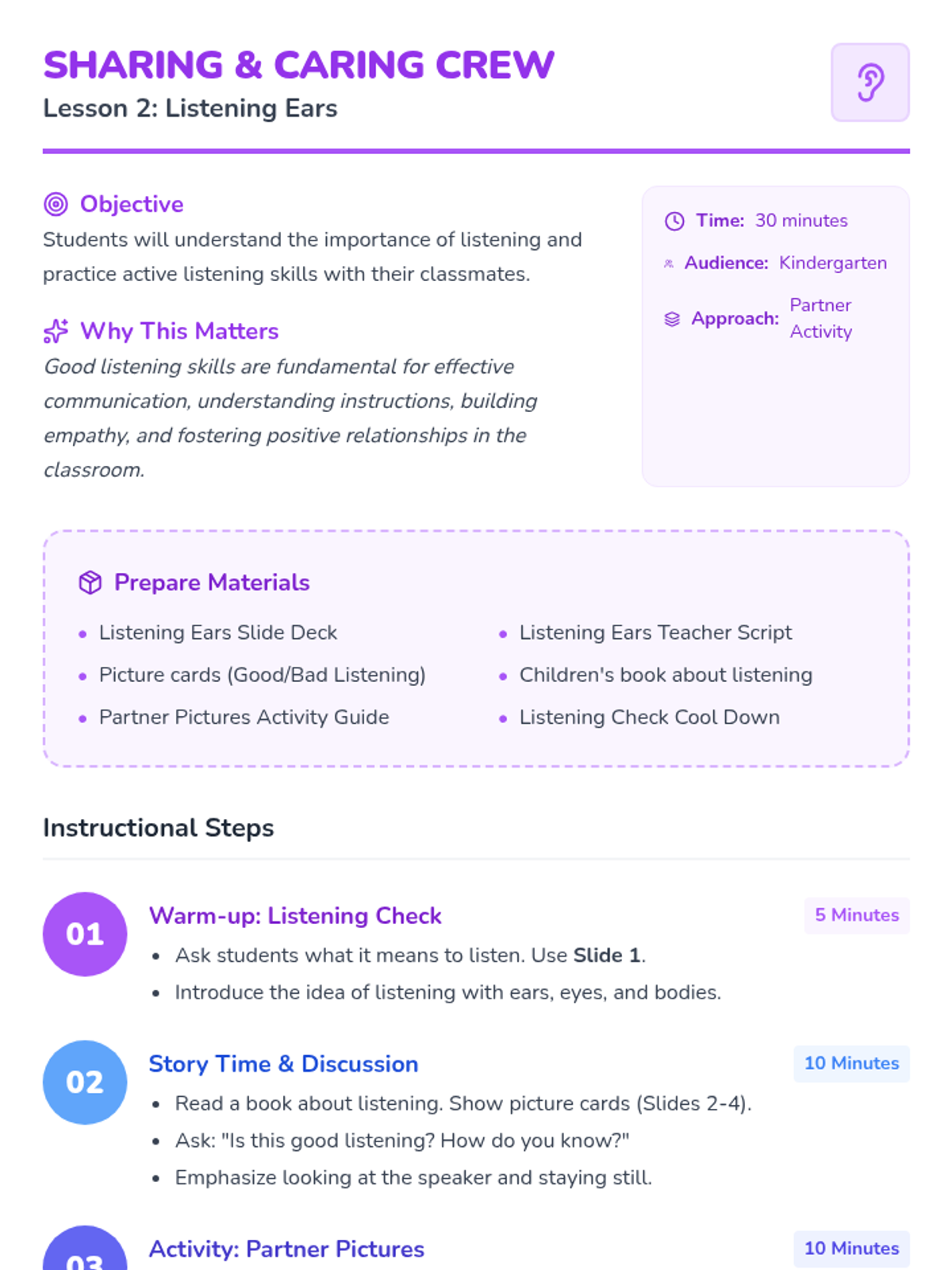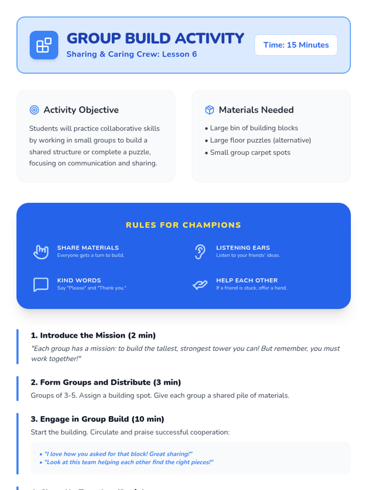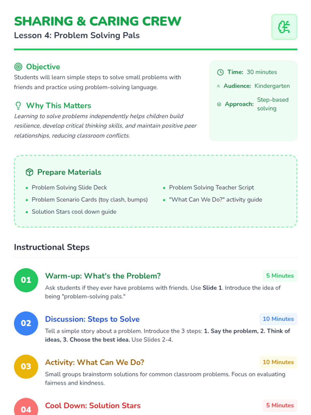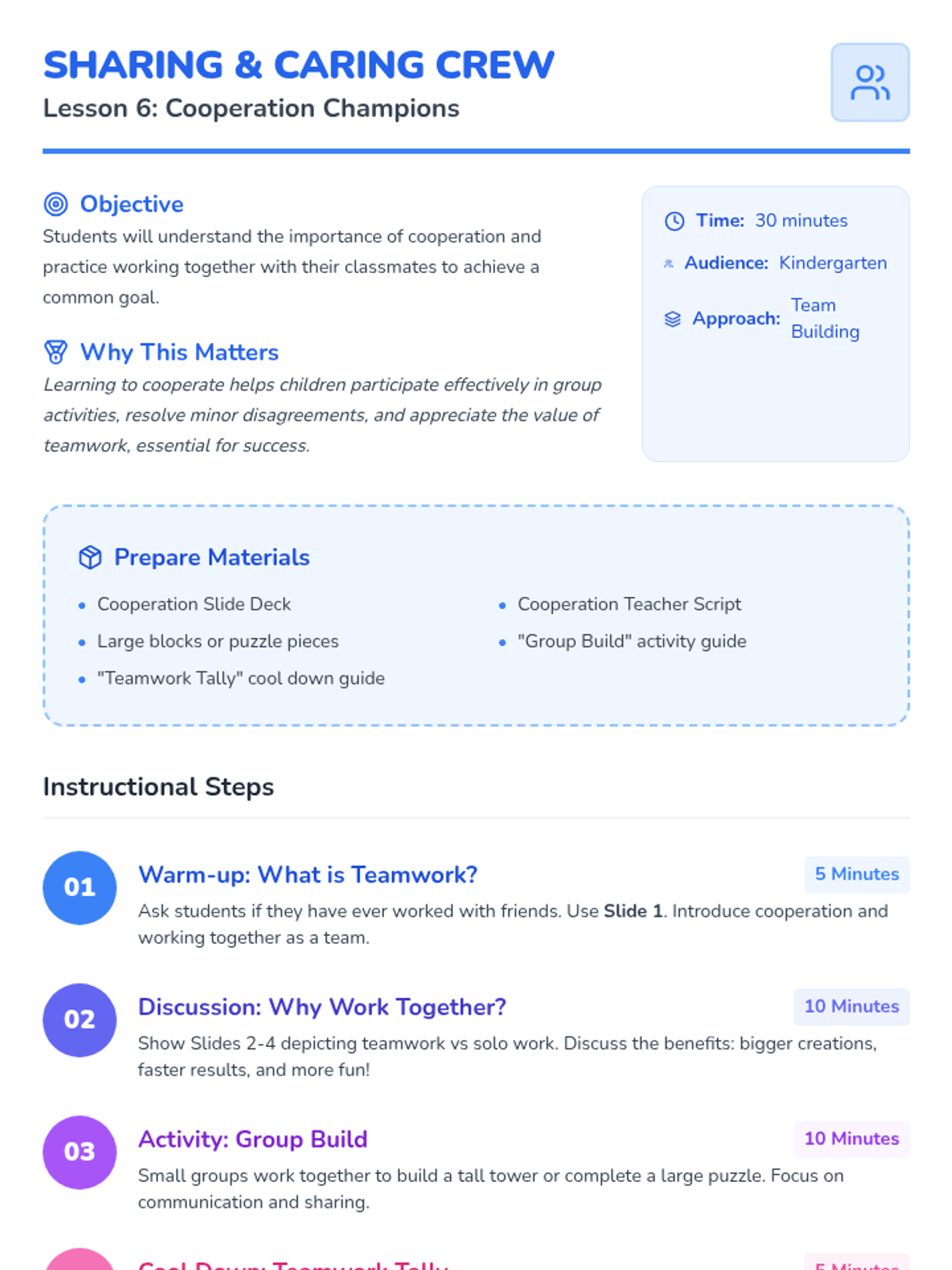 A six-part social skills sequence for kindergarteners, focusing on essential classroom behaviors like sharing, active listening, using kind words, problem-solving, empathy, and cooperation.