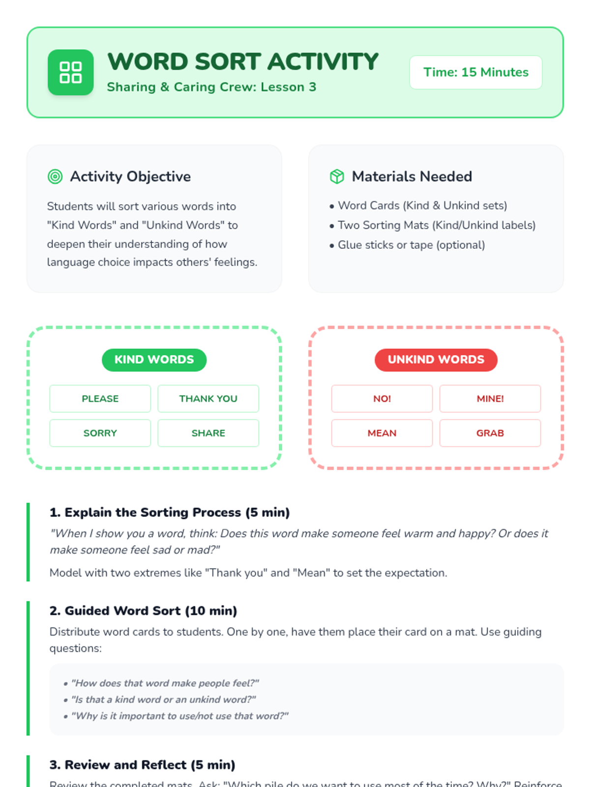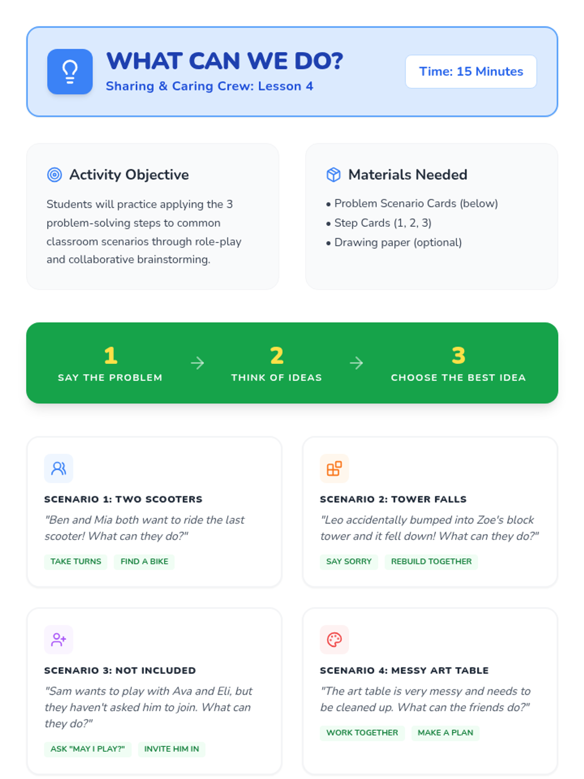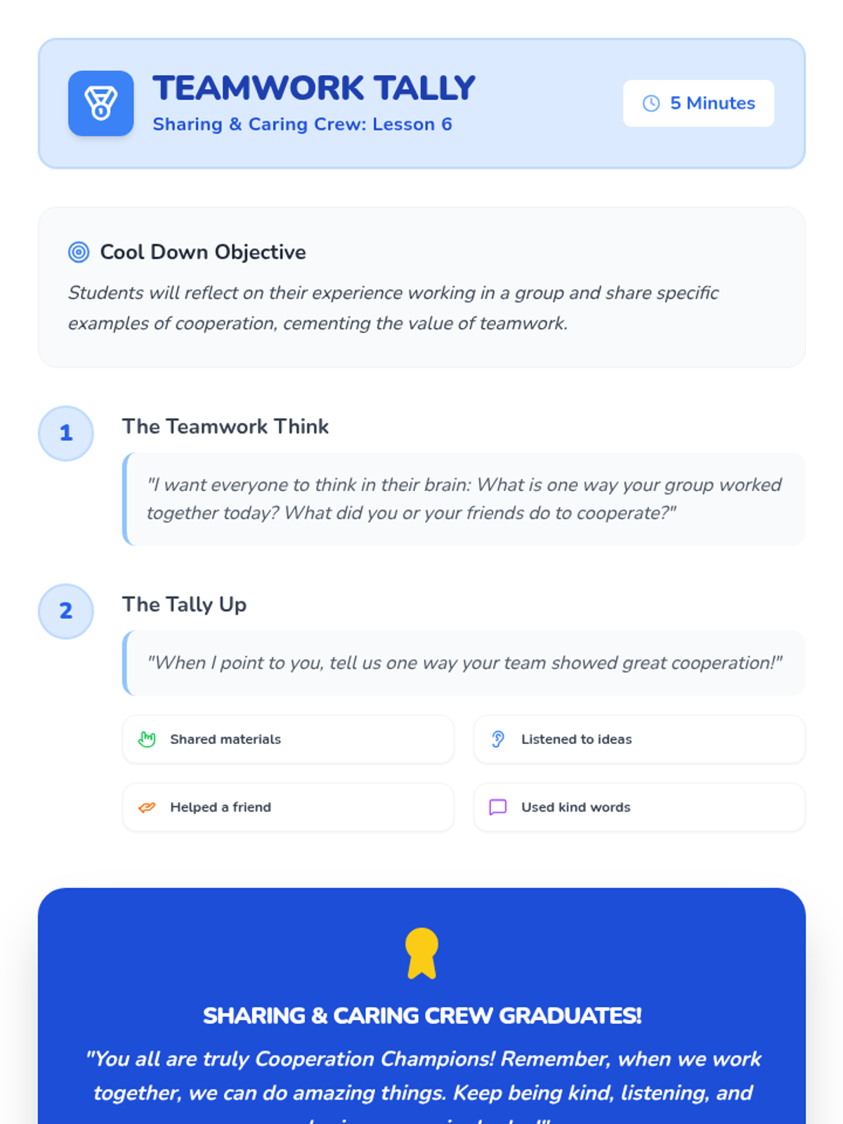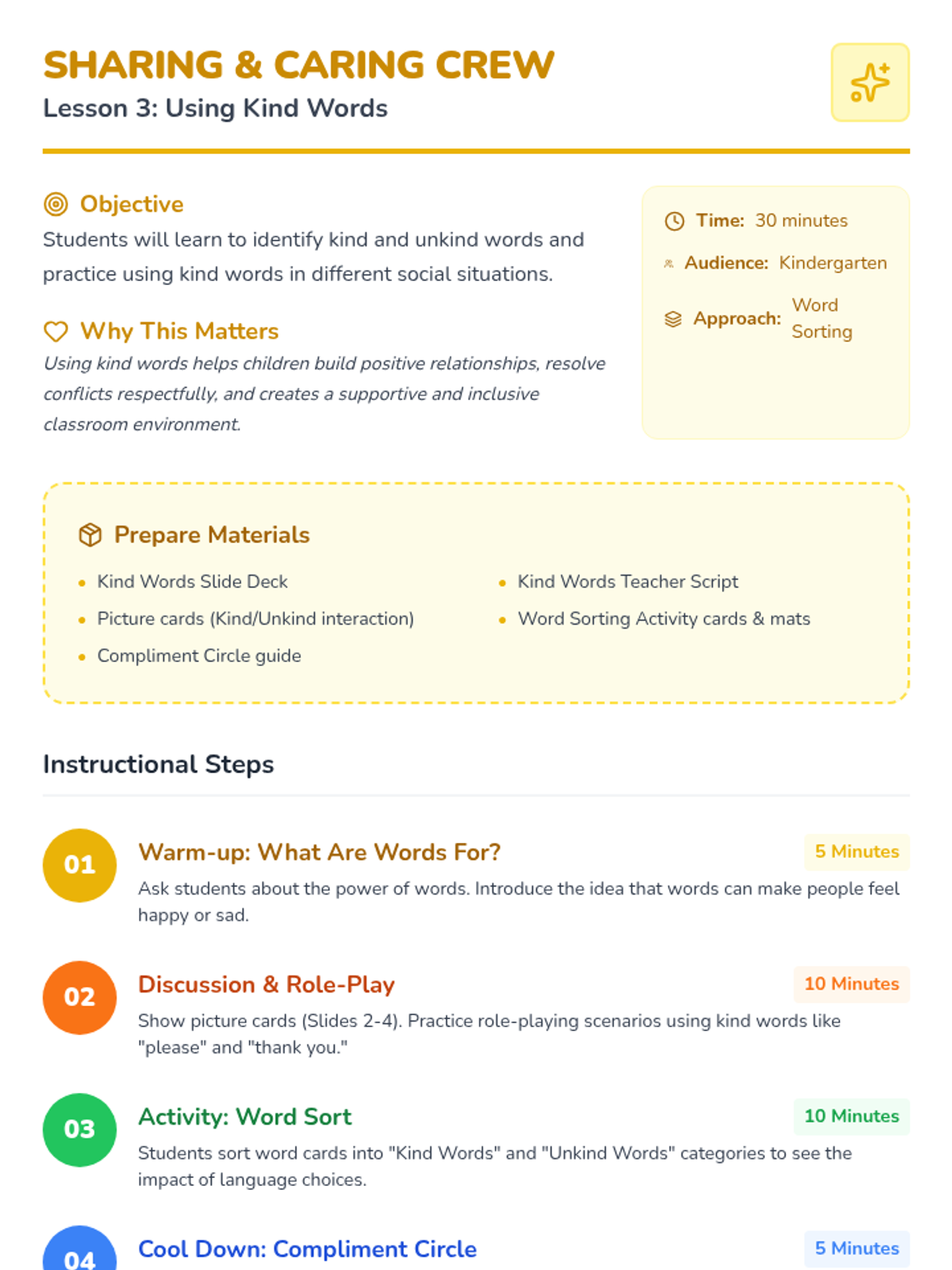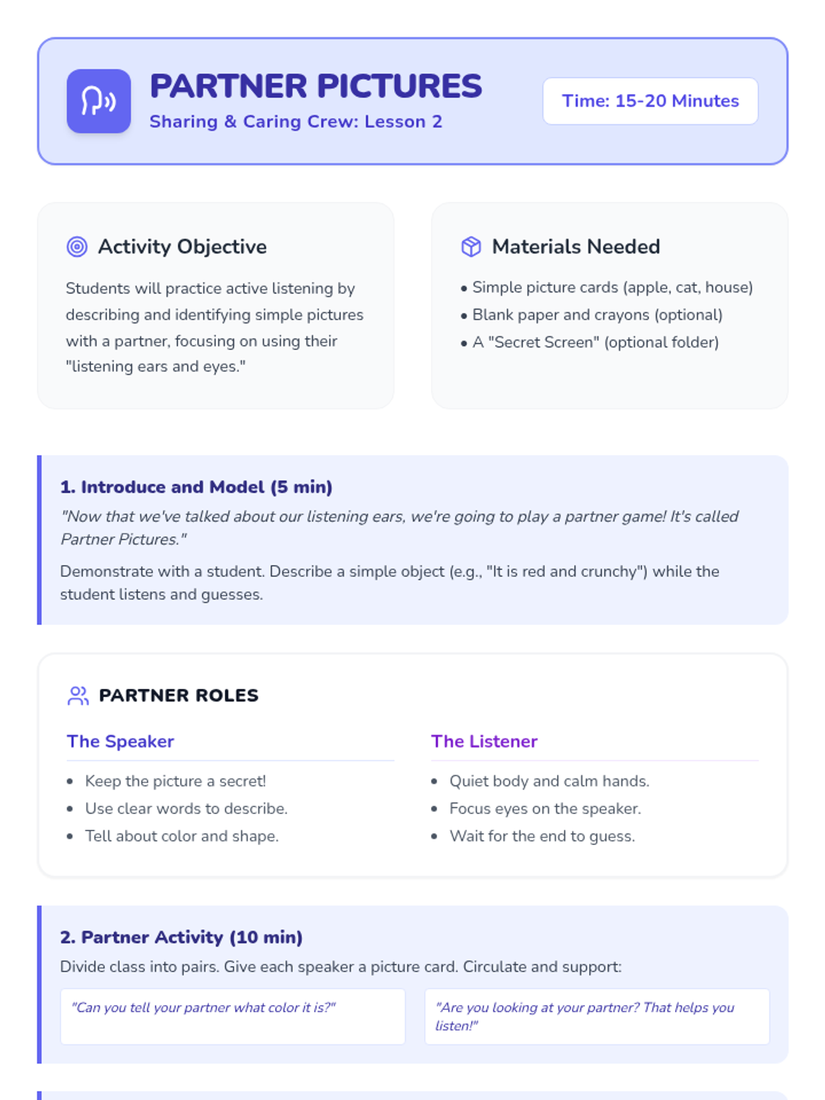A six-part social skills sequence for kindergarteners, focusing on essential classroom behaviors like sharing, active listening, using kind words, problem-solving, empathy, and cooperation.
