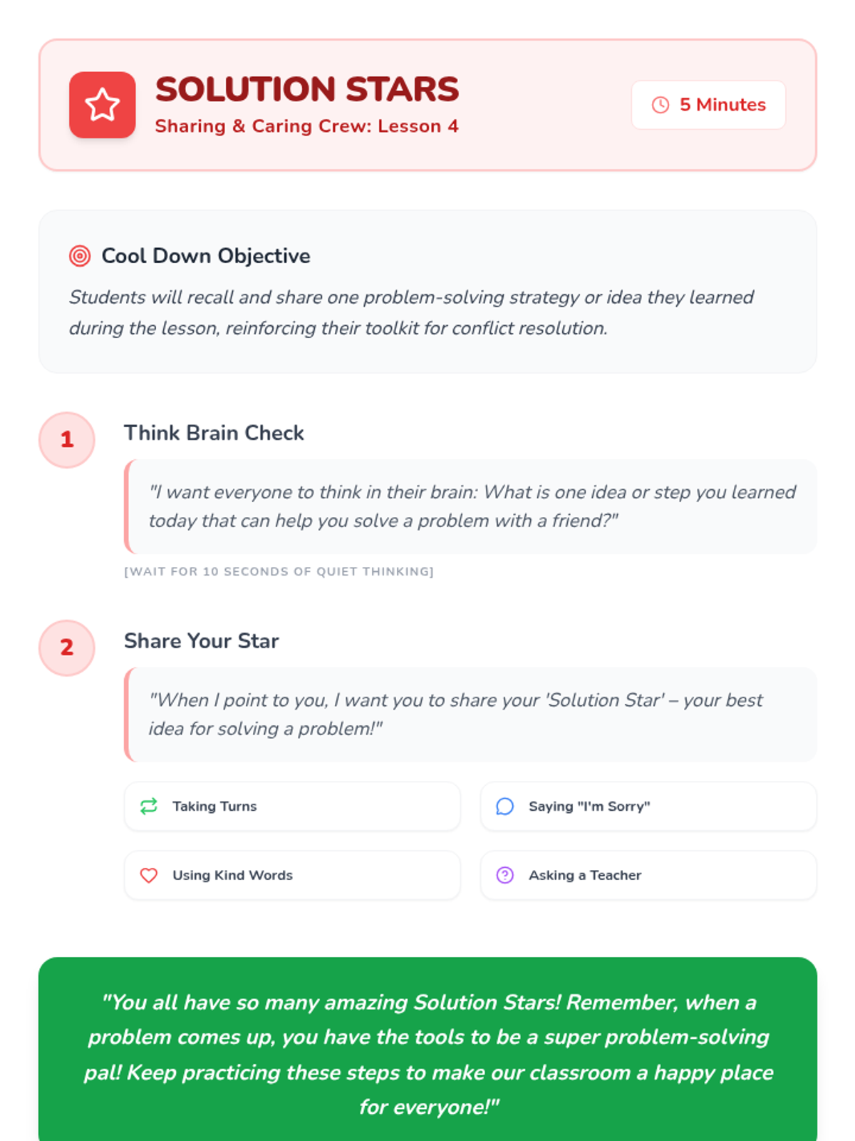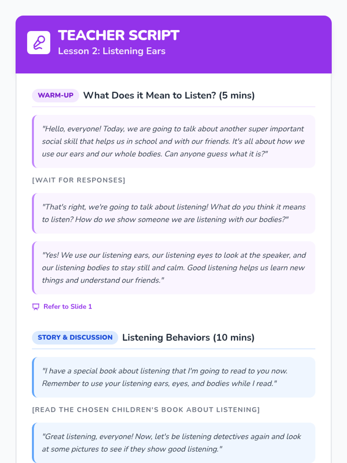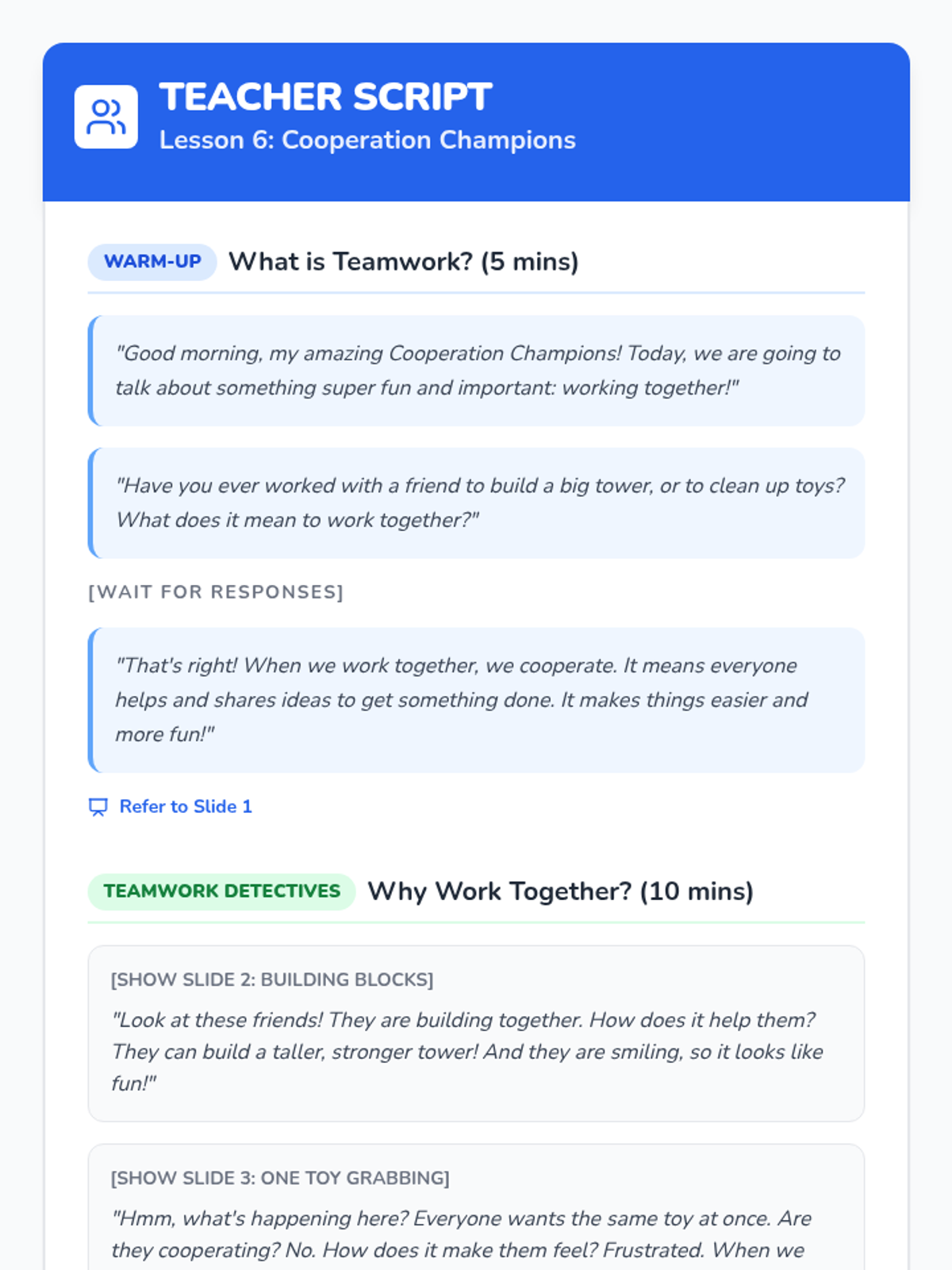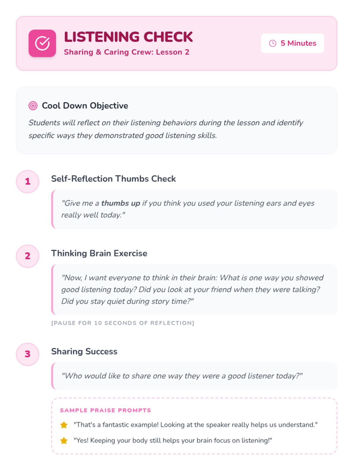 A six-part social skills sequence for kindergarteners, focusing on essential classroom behaviors like sharing, active listening, using kind words, problem-solving, empathy, and cooperation.