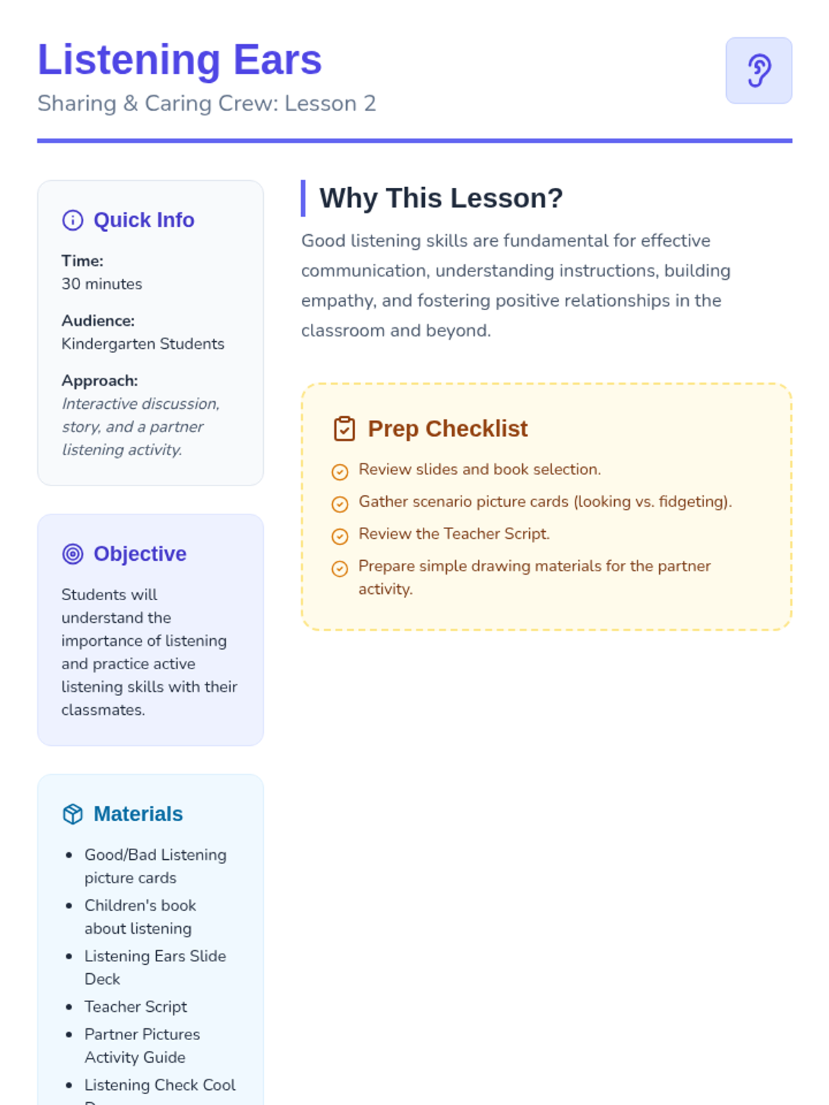 A six-part social-emotional learning series for kindergarteners focused on essential skills like sharing, listening, kind words, problem-solving, empathy, and cooperation. Each session is designed for 30 minutes of interactive play and discussion to build a positive classroom community.