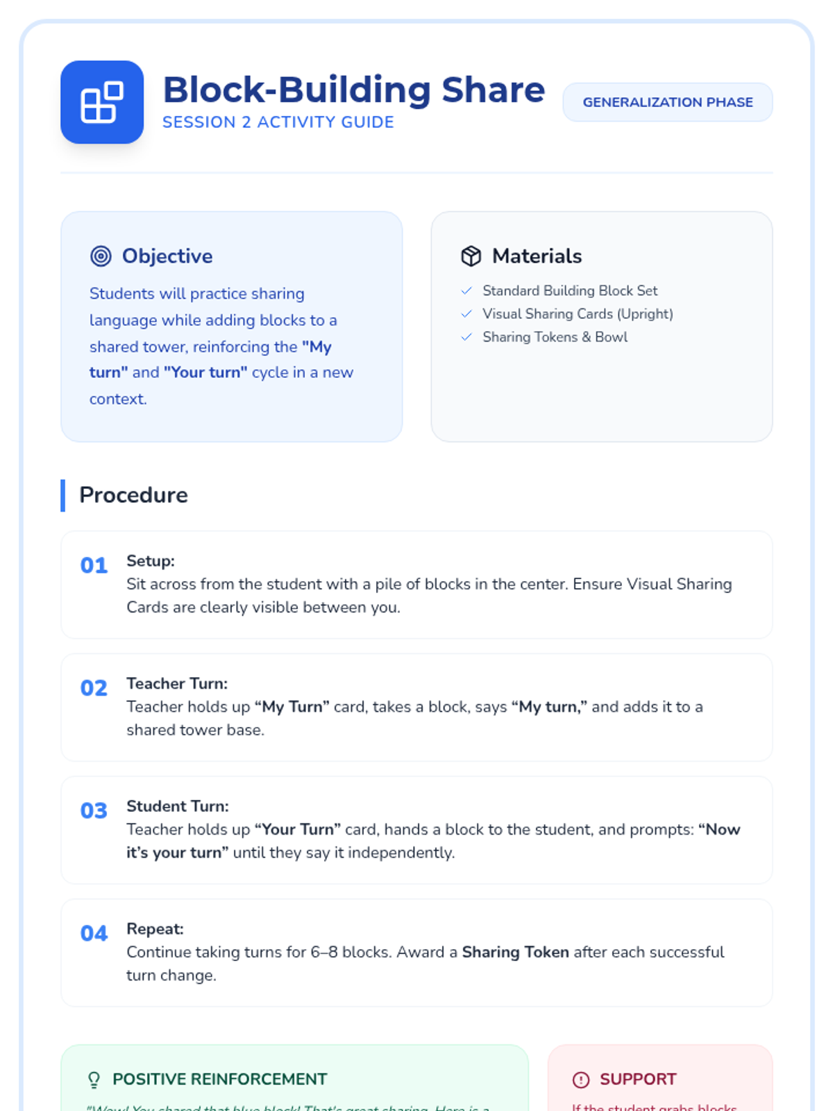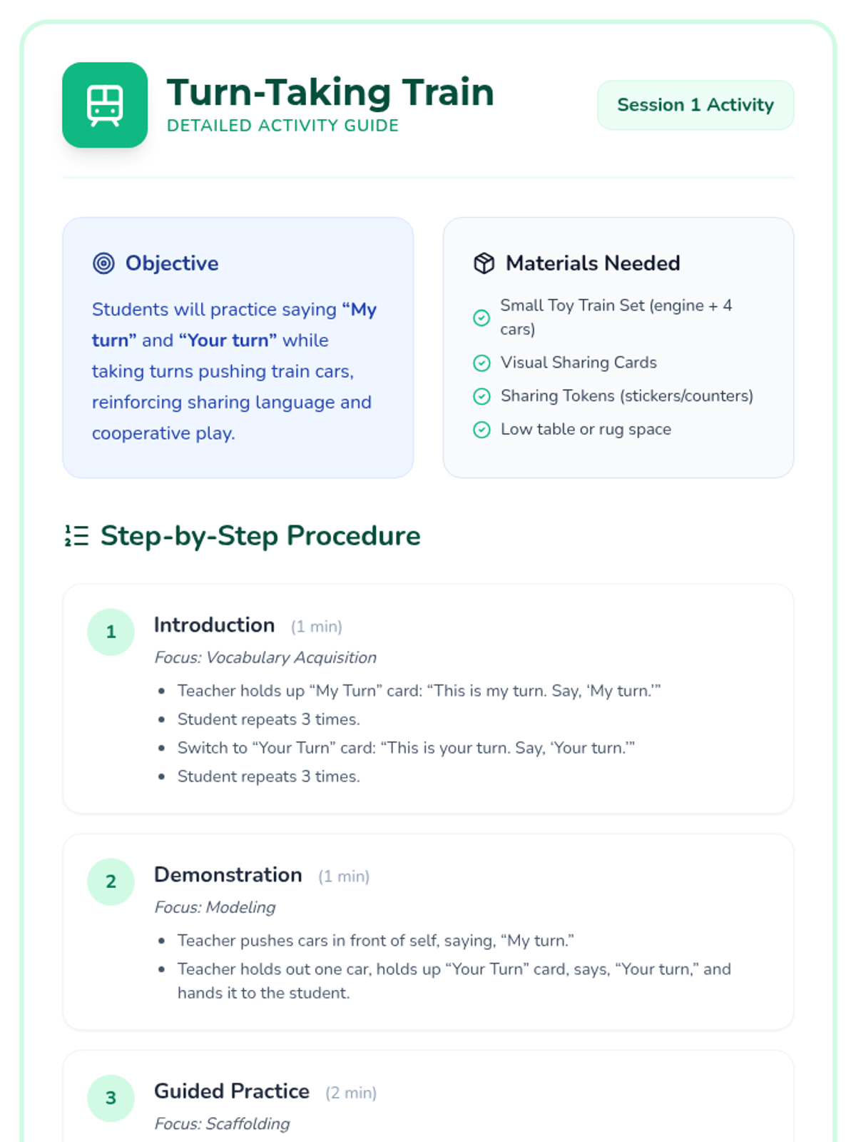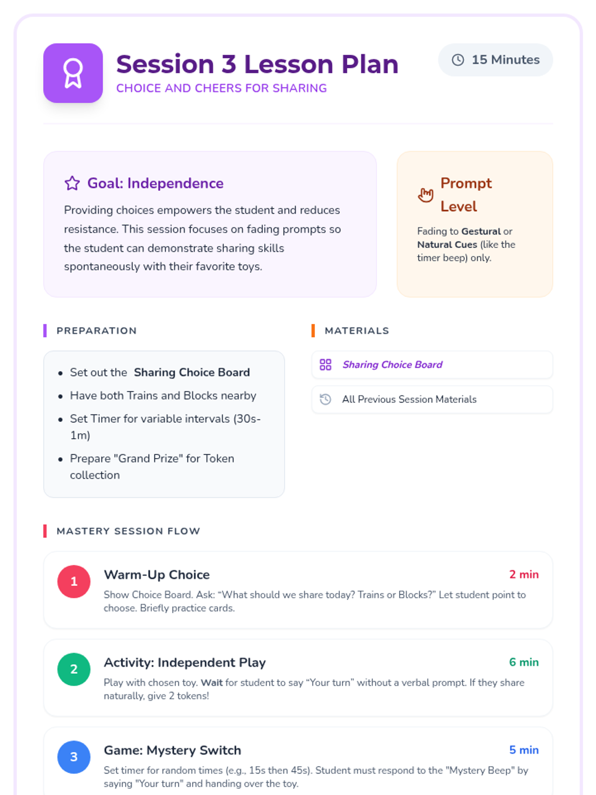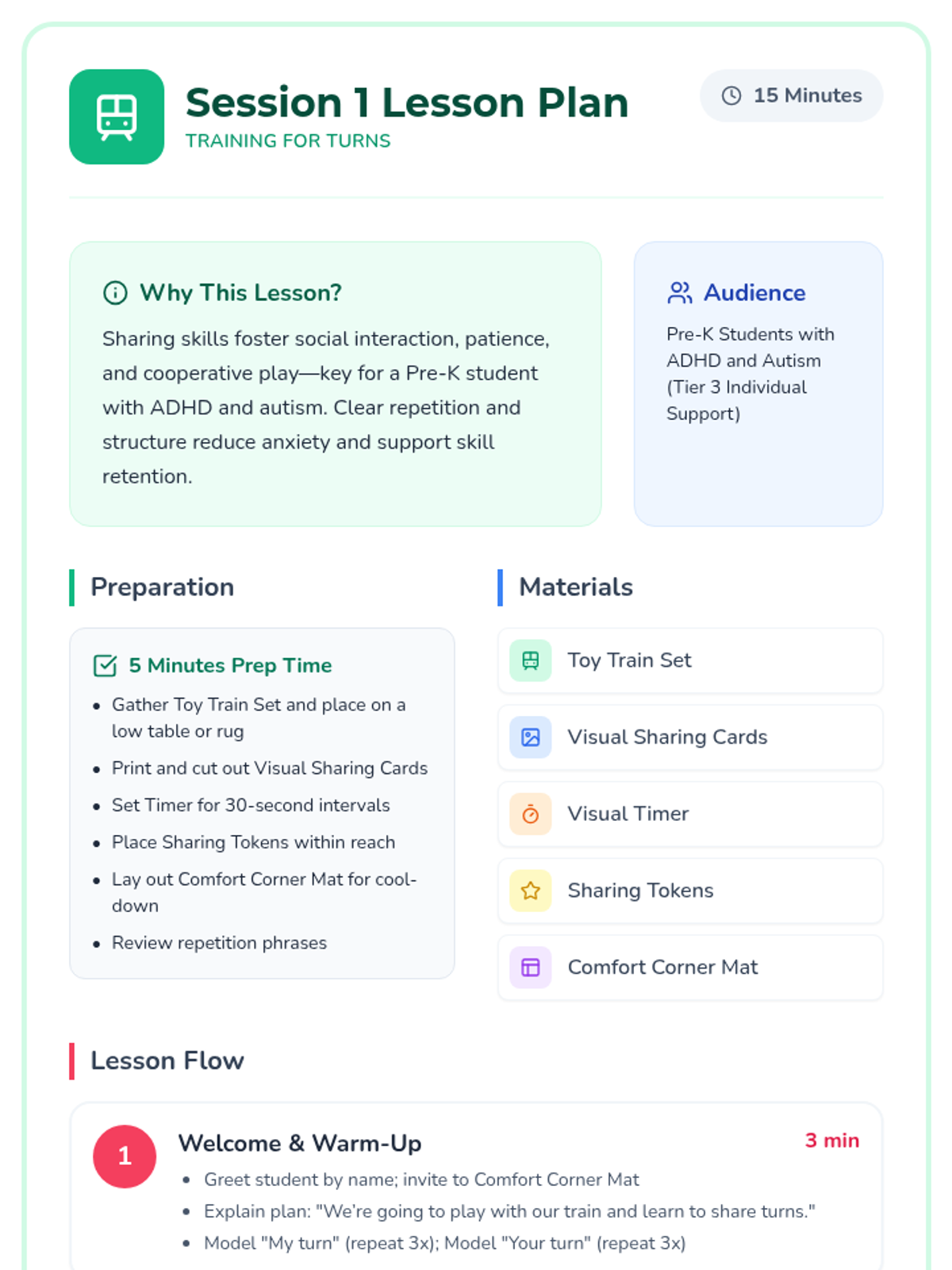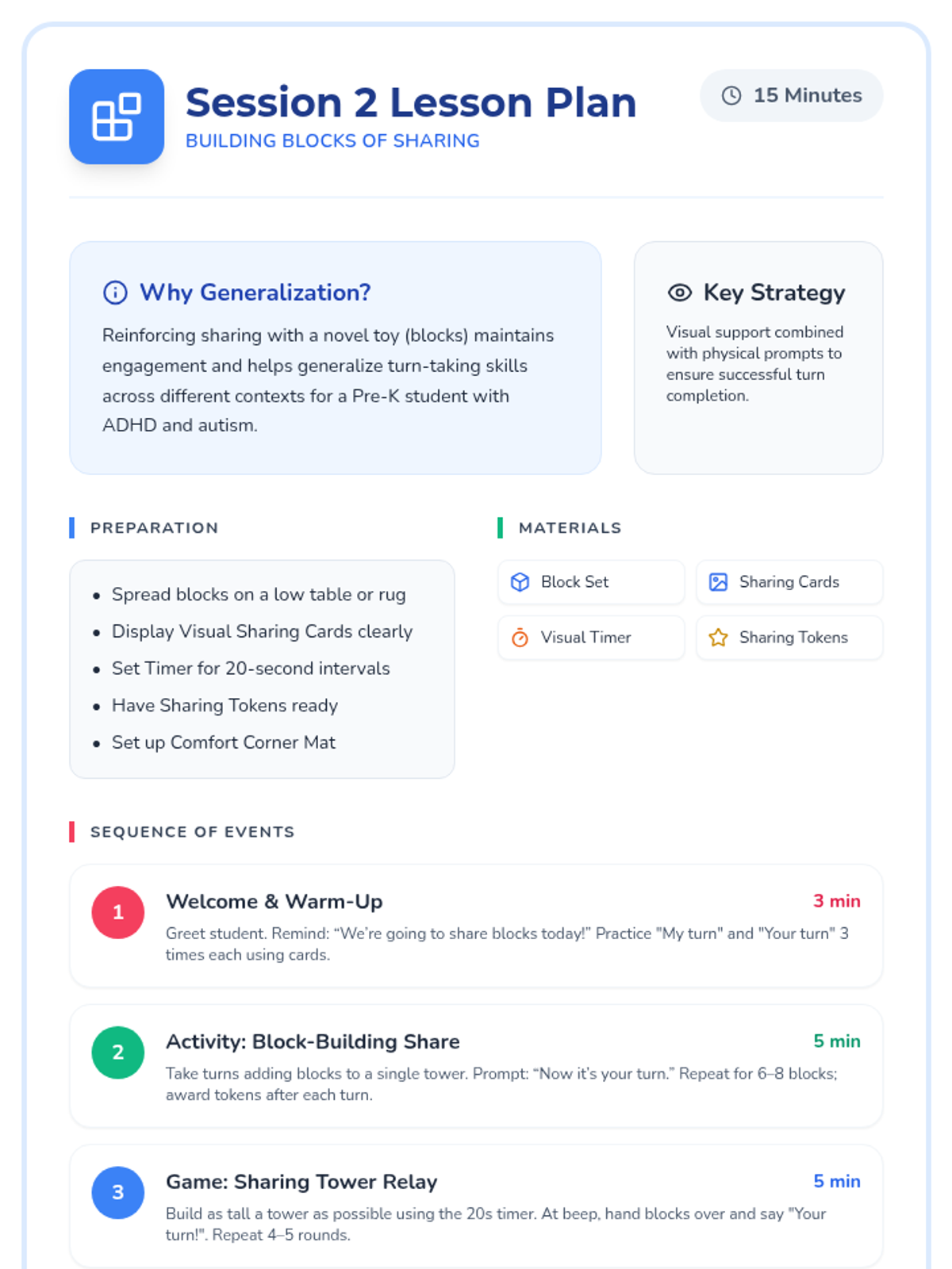 A 3-session mini-lesson sequence designed for pre-K students with ADHD and autism to develop sharing skills, turn-taking language, and cooperative play through structured, repetitive activities.