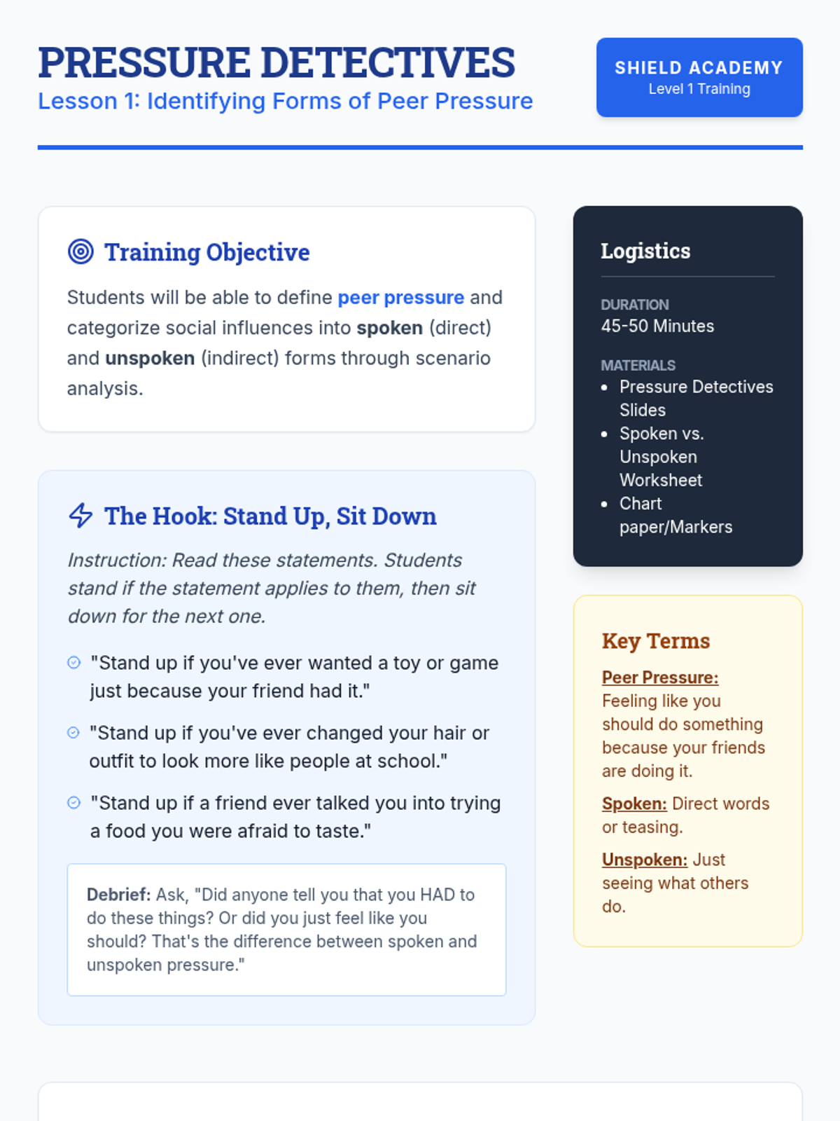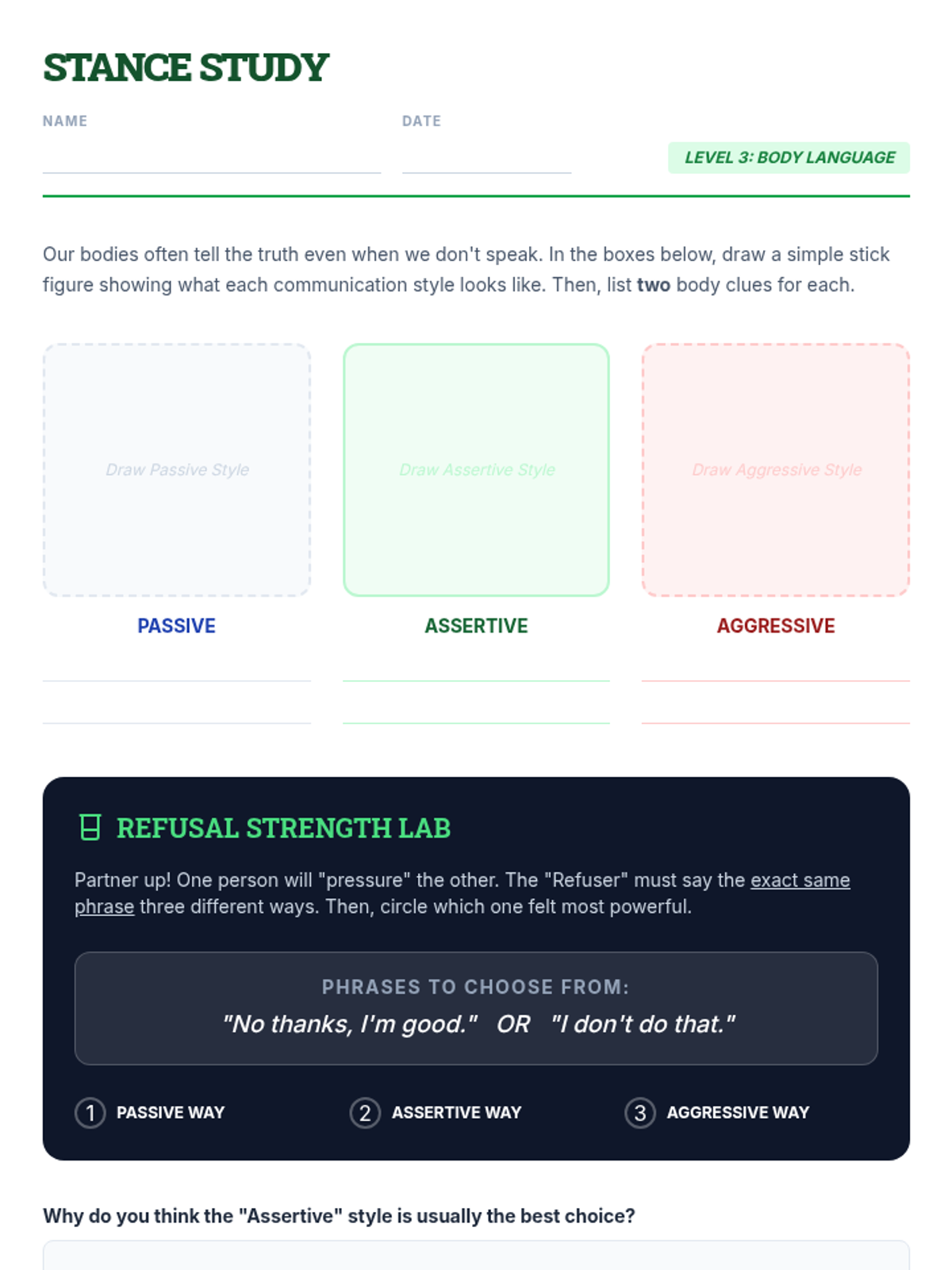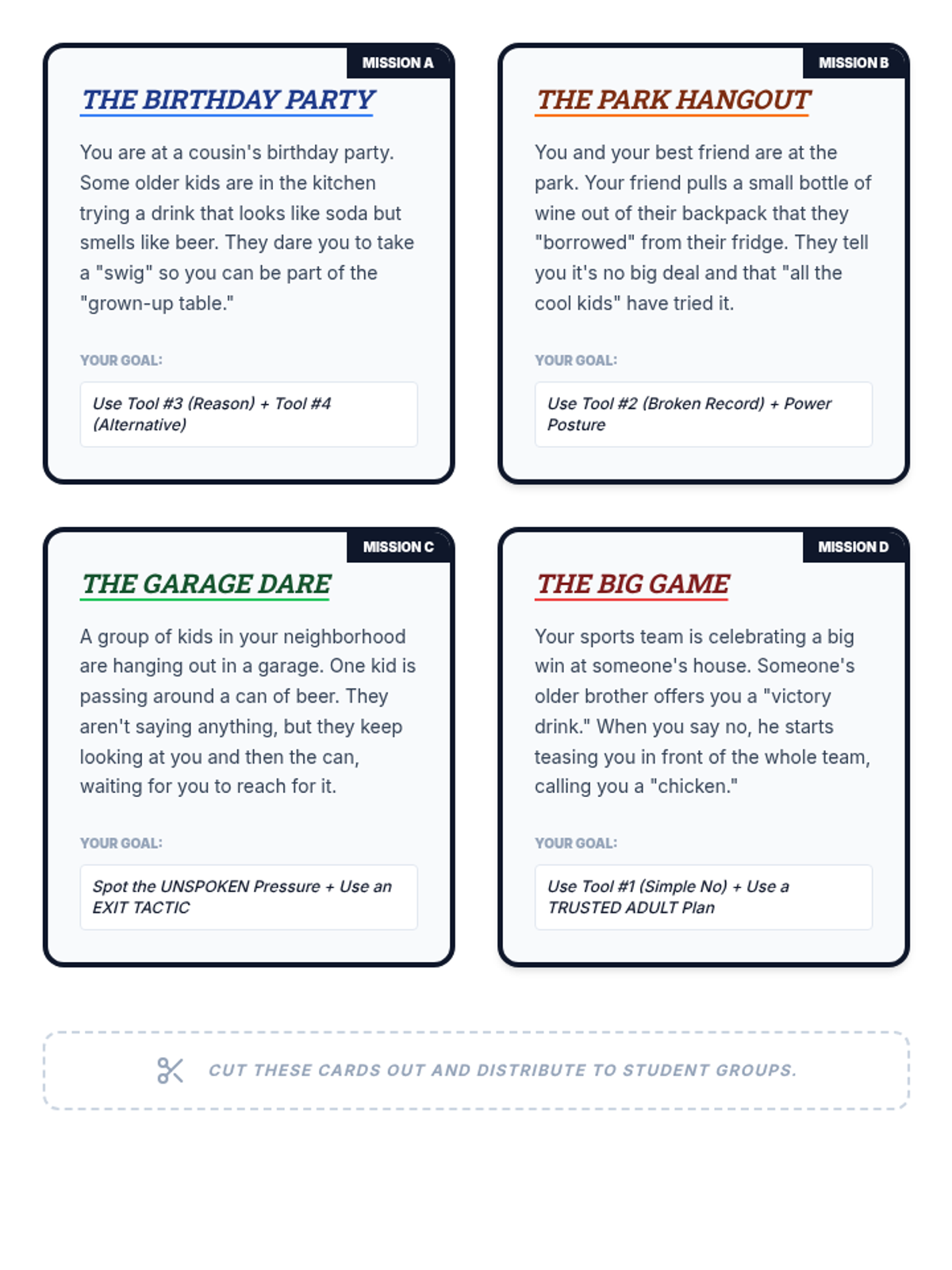 A comprehensive 5-lesson sequence for 4th graders focused on identifying peer pressure and developing practical verbal and non-verbal refusal strategies related to alcohol awareness. Students build a 'social shield' of skills to navigate uncomfortable situations with confidence.