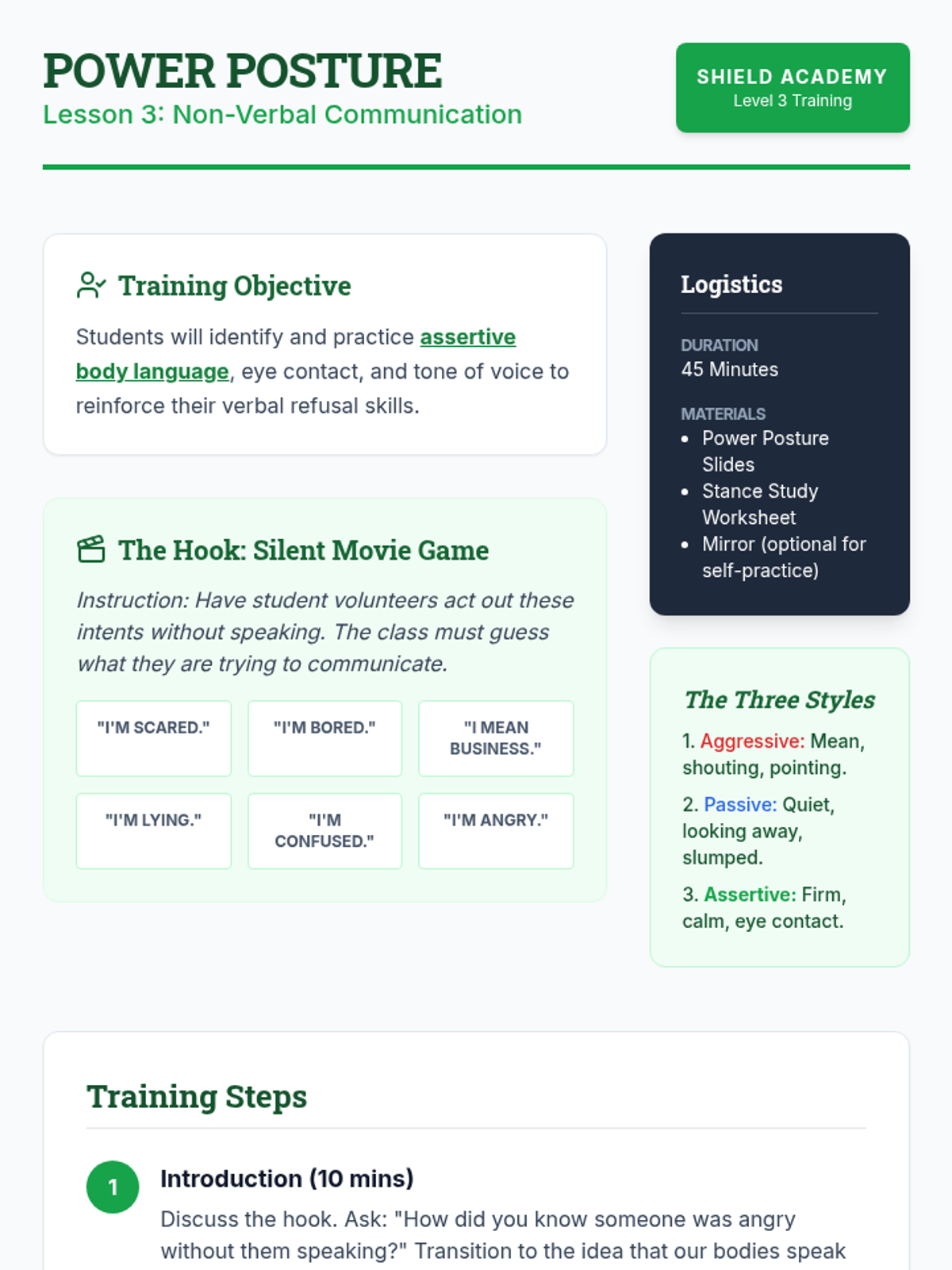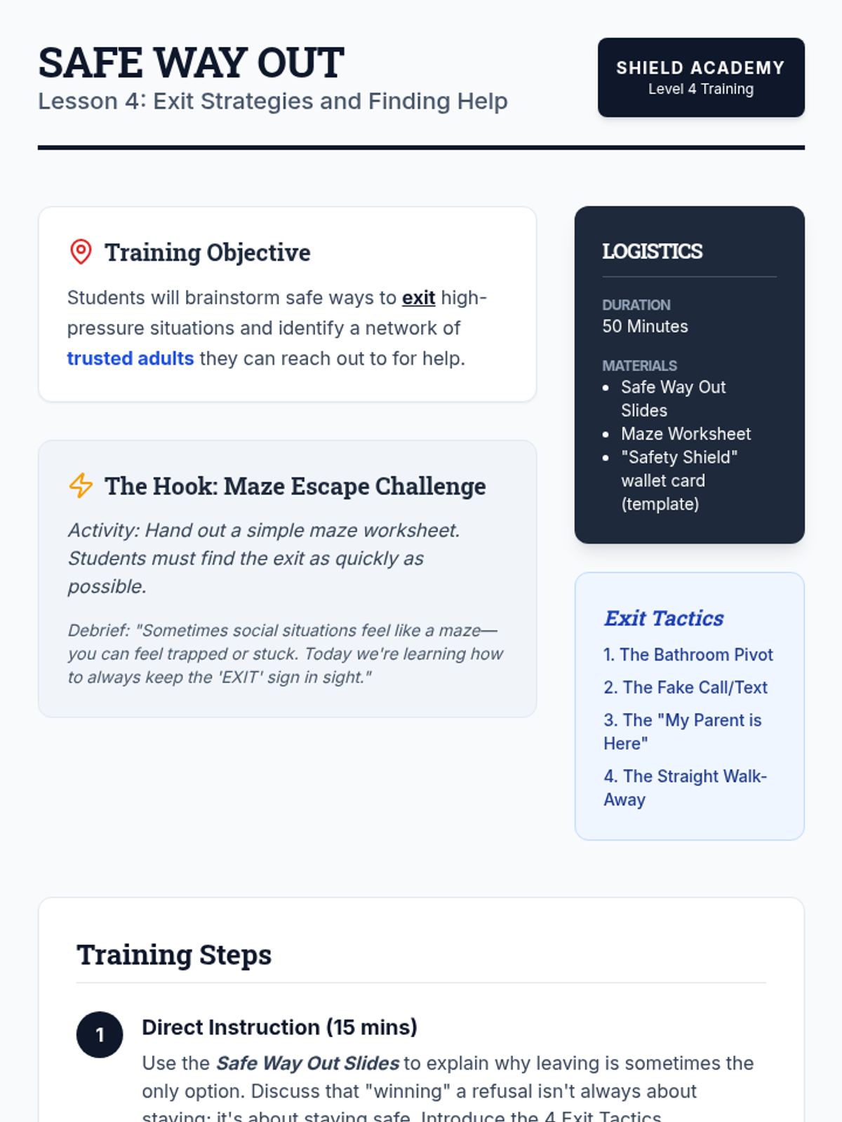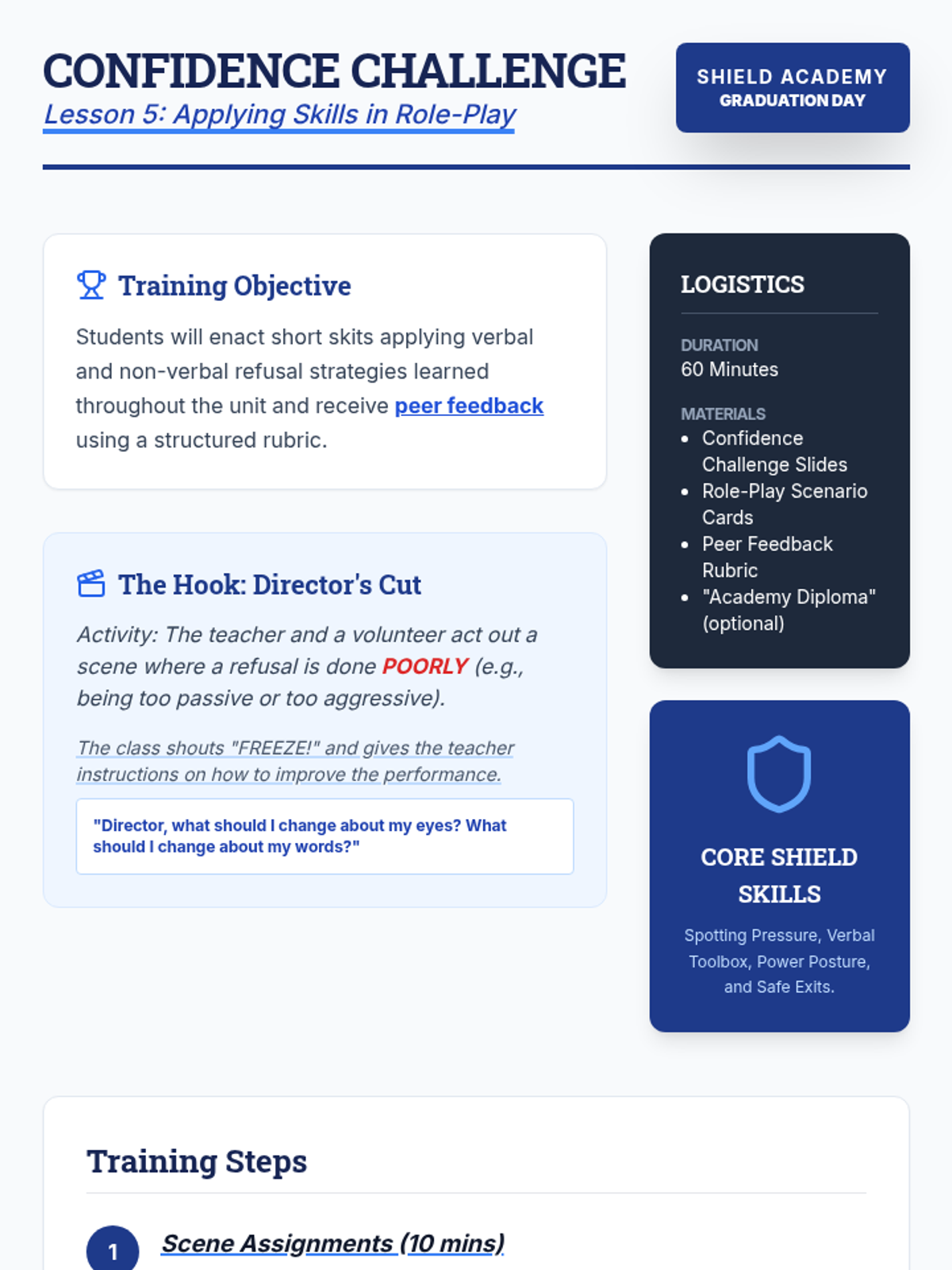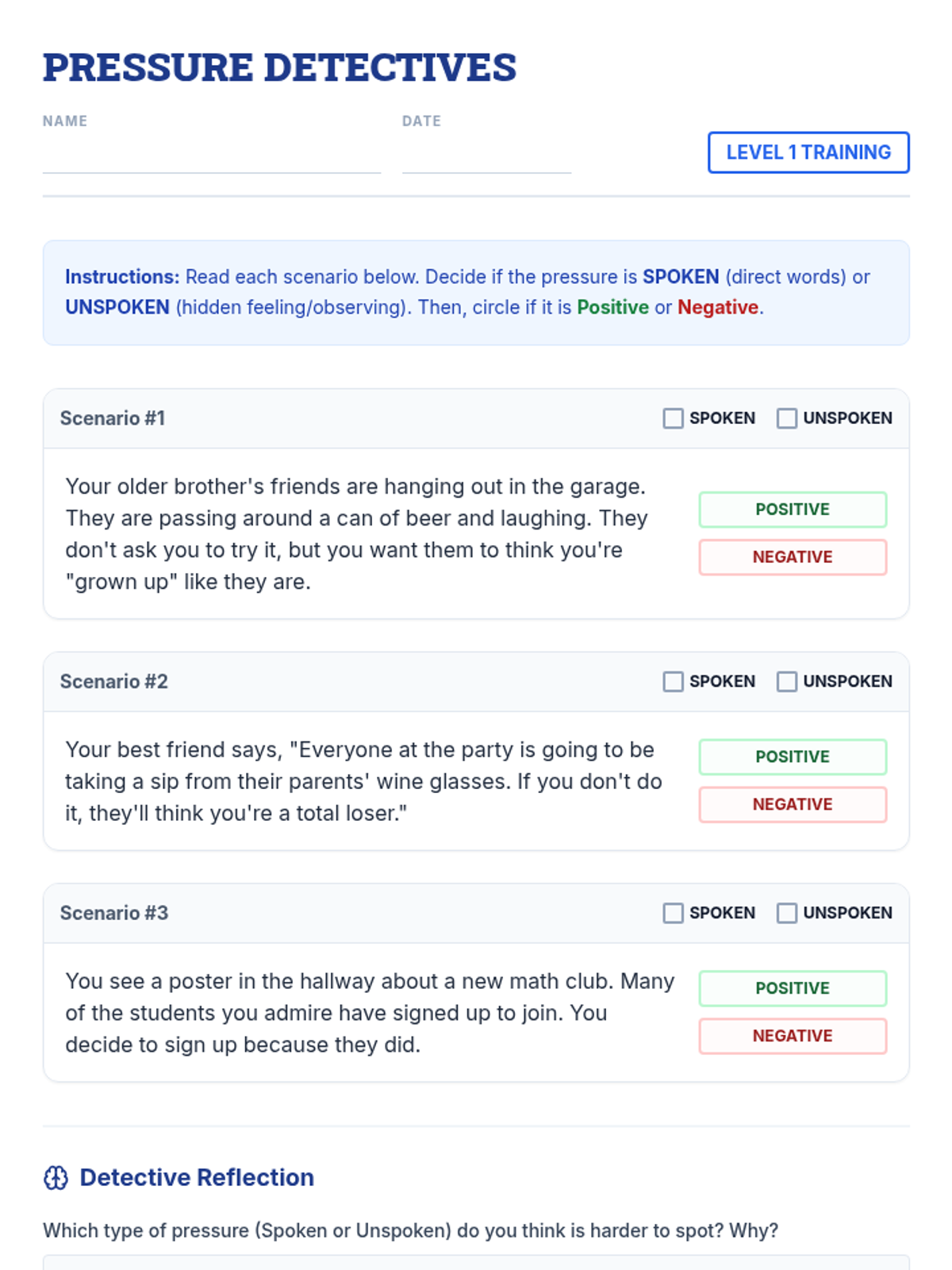 A comprehensive 5-lesson sequence for 4th graders focused on identifying peer pressure and developing practical verbal and non-verbal refusal strategies related to alcohol awareness. Students build a 'social shield' of skills to navigate uncomfortable situations with confidence.