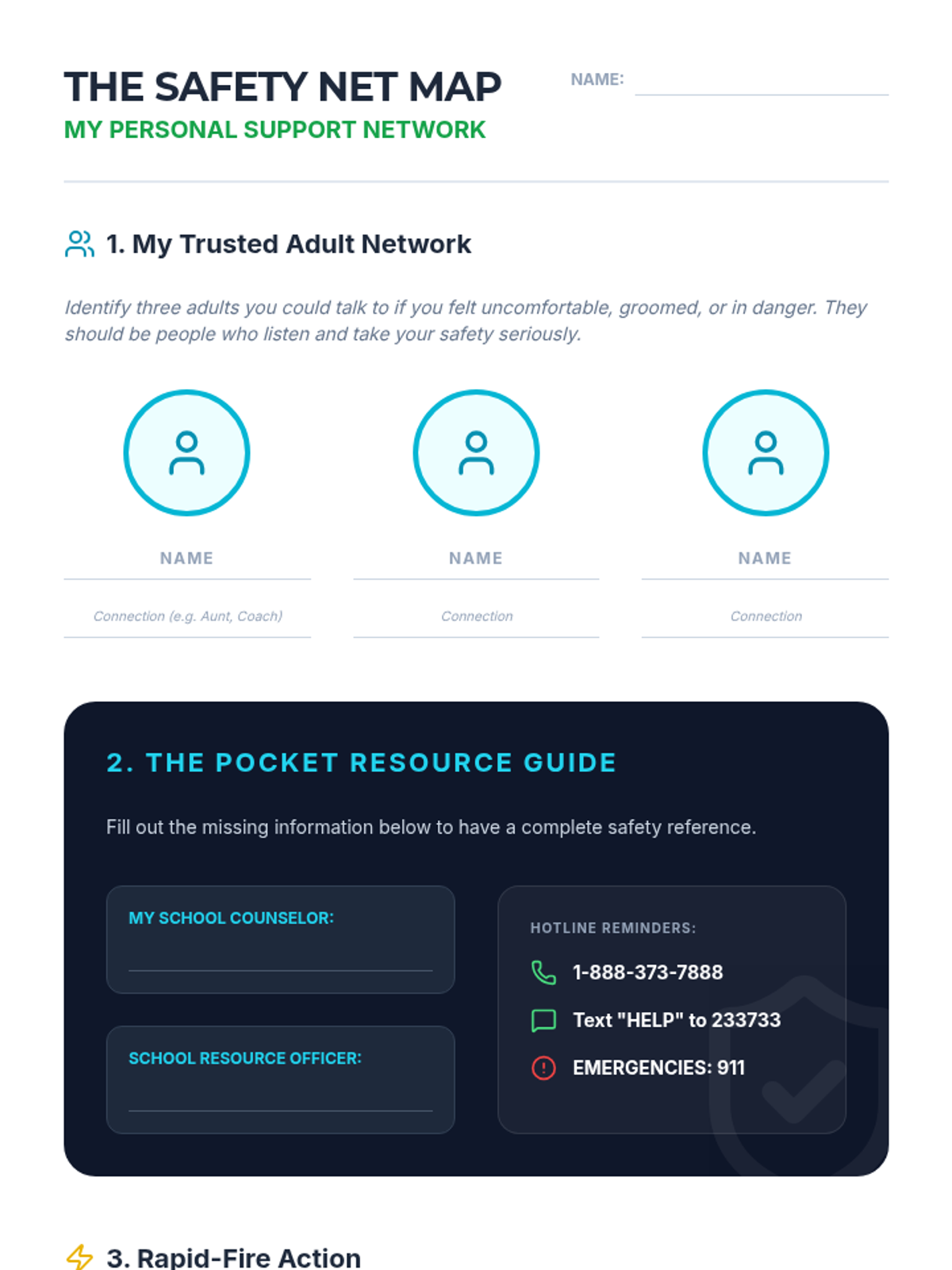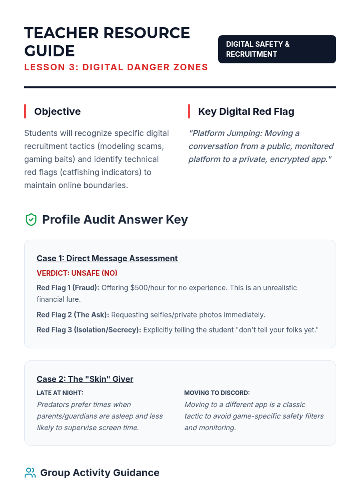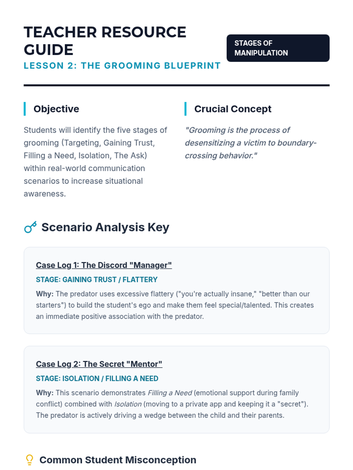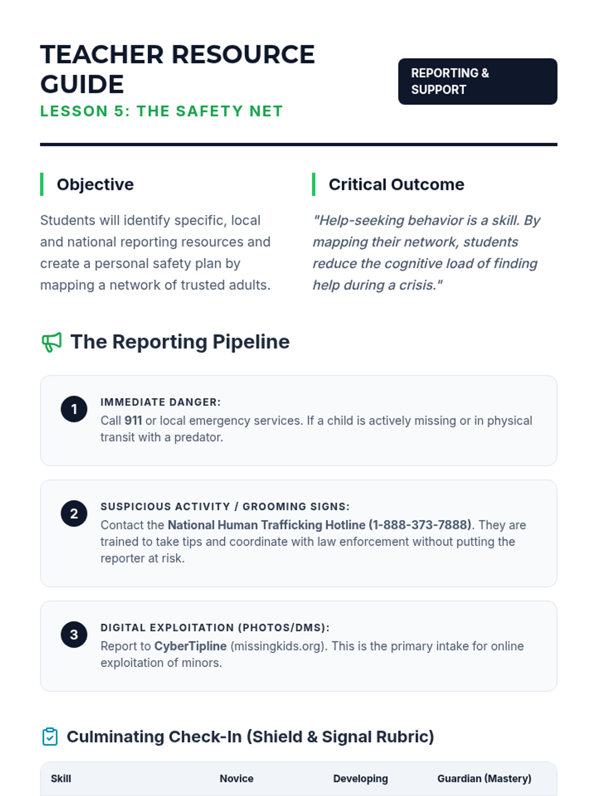 This sequence equips 7th-grade students with the critical thinking skills to recognize and prevent exploitation. It covers the reality of trafficking, the psychological process of grooming, digital recruitment tactics, personal boundaries, and reporting protocols.