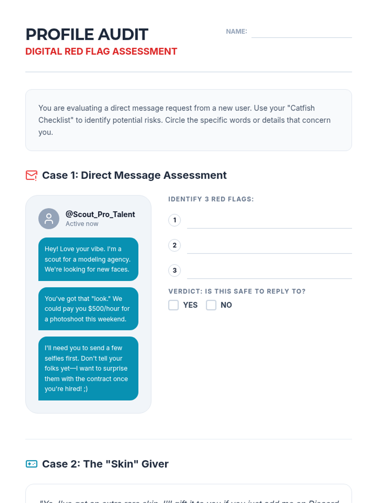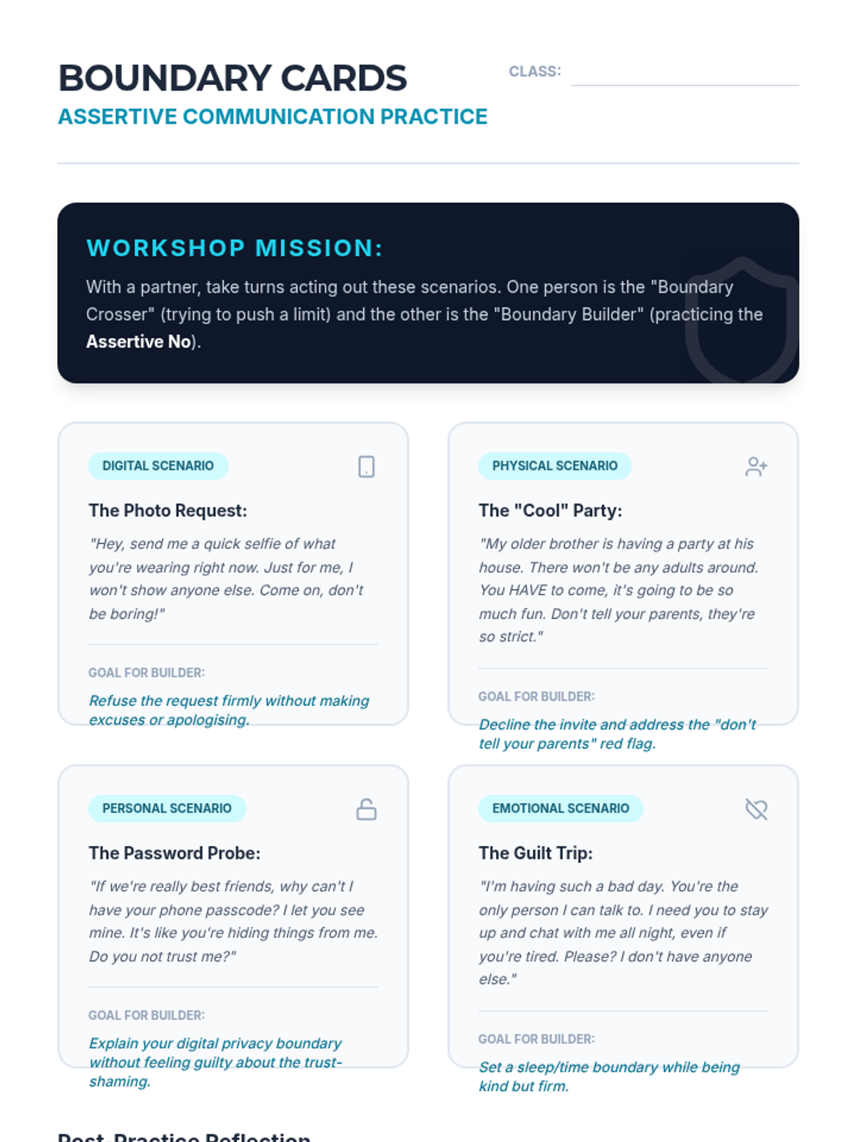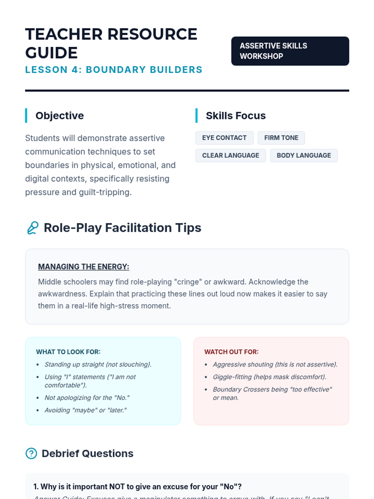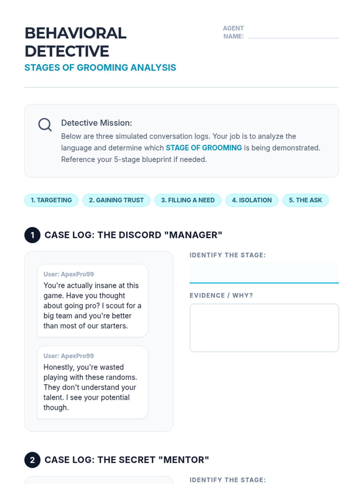 This sequence equips 7th-grade students with the critical thinking skills to recognize and prevent exploitation. It covers the reality of trafficking, the psychological process of grooming, digital recruitment tactics, personal boundaries, and reporting protocols.