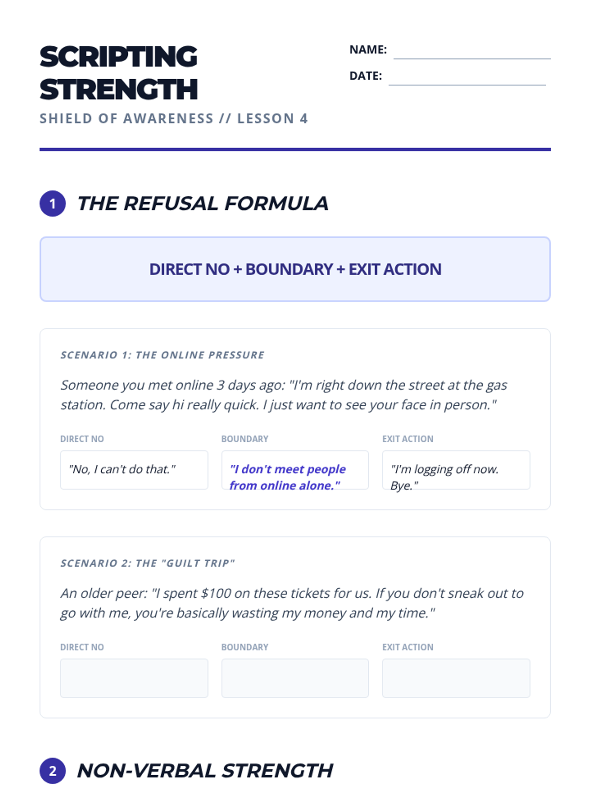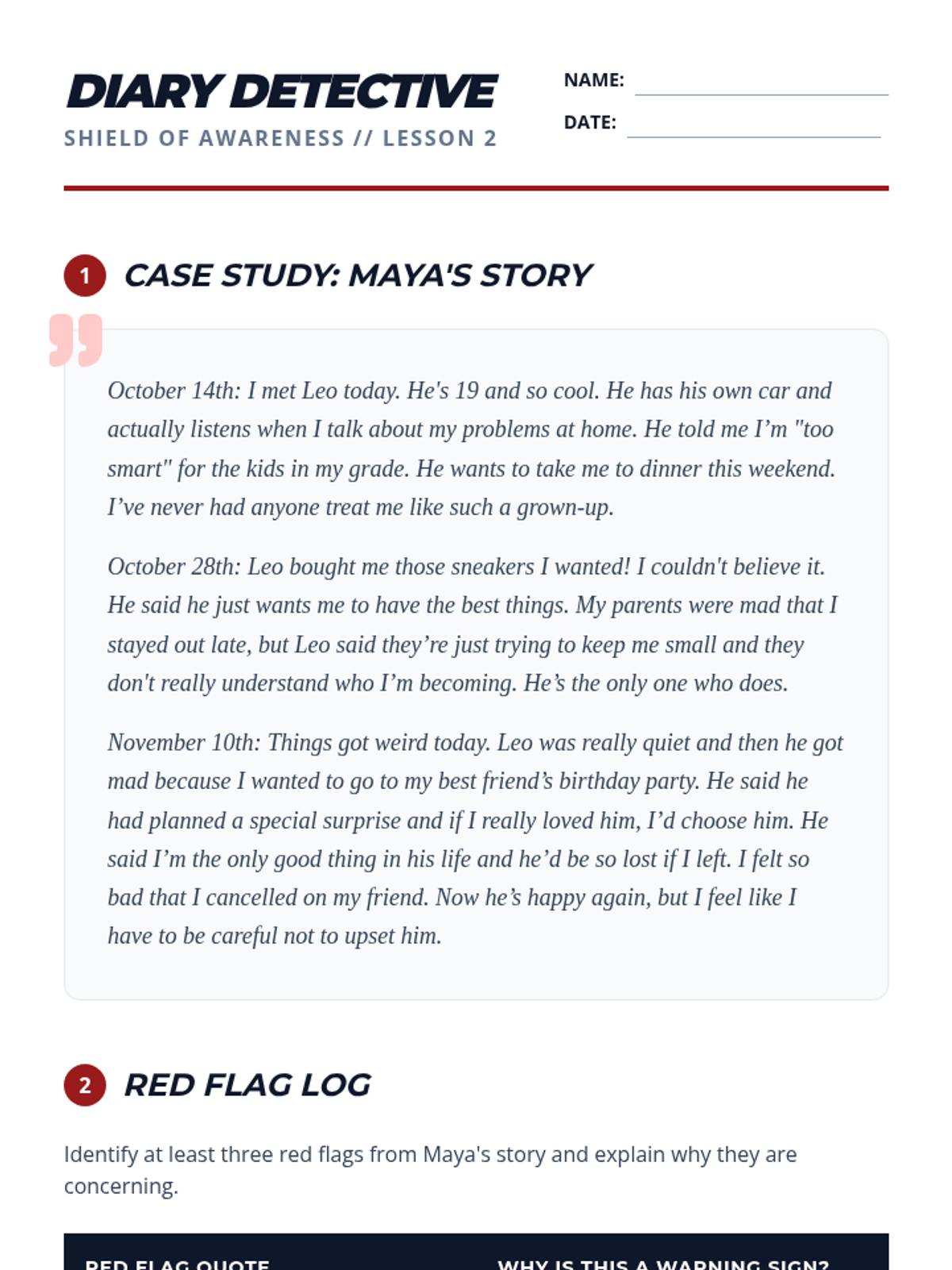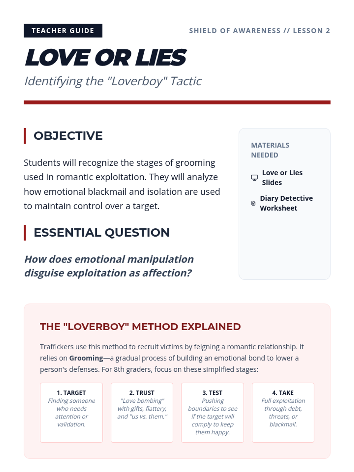 This sequence addresses the interpersonal dynamics of trafficking, focusing on healthy boundaries and the specific 'Romeo' or 'Boyfriend' coercion tactics often used against teens. Students will engage in workshops to practice assertiveness and recognize the difference between affection and control.