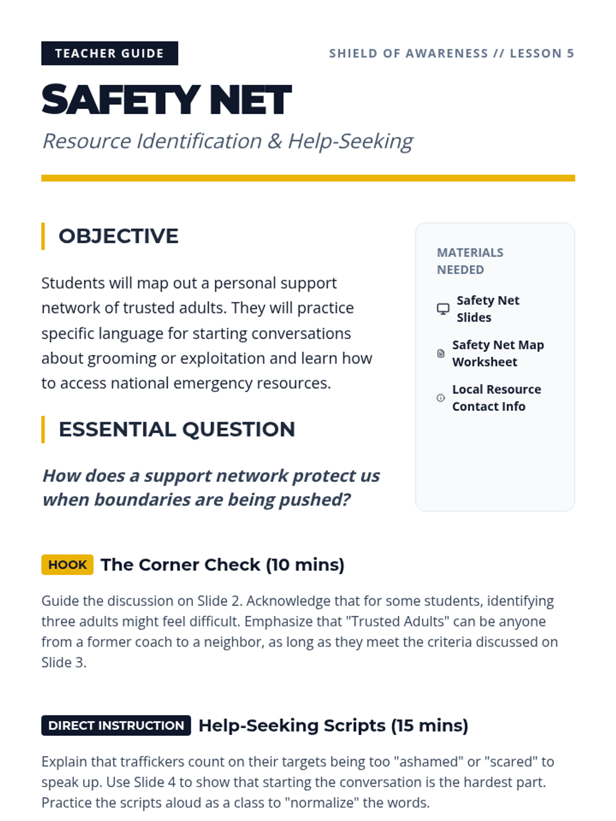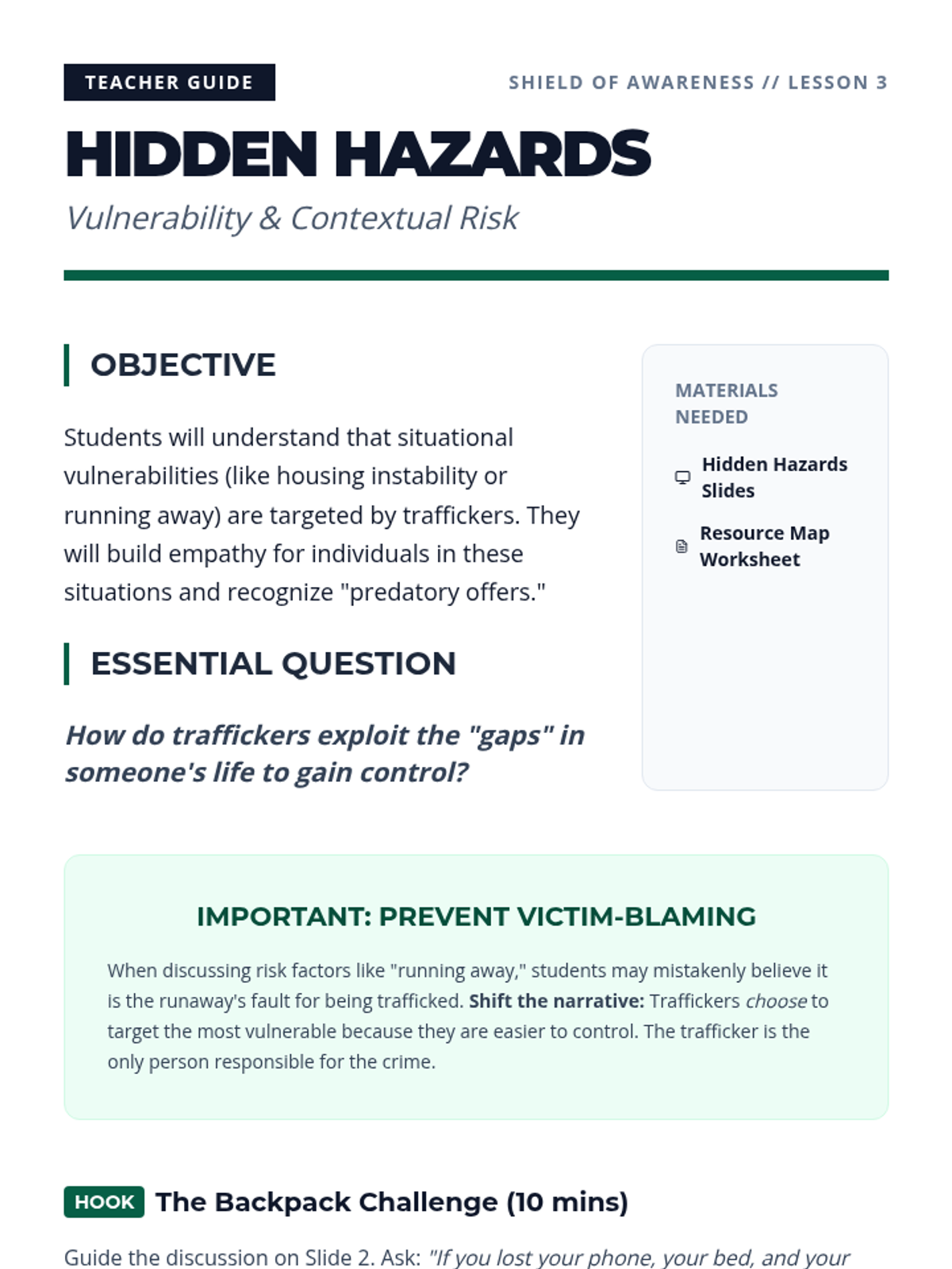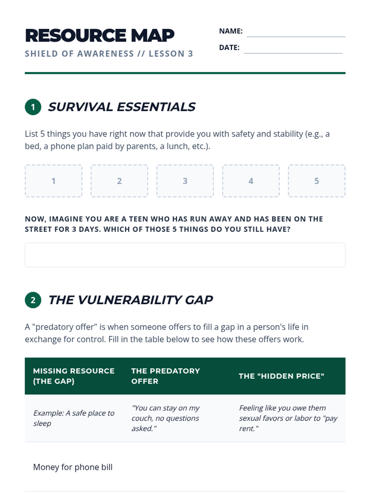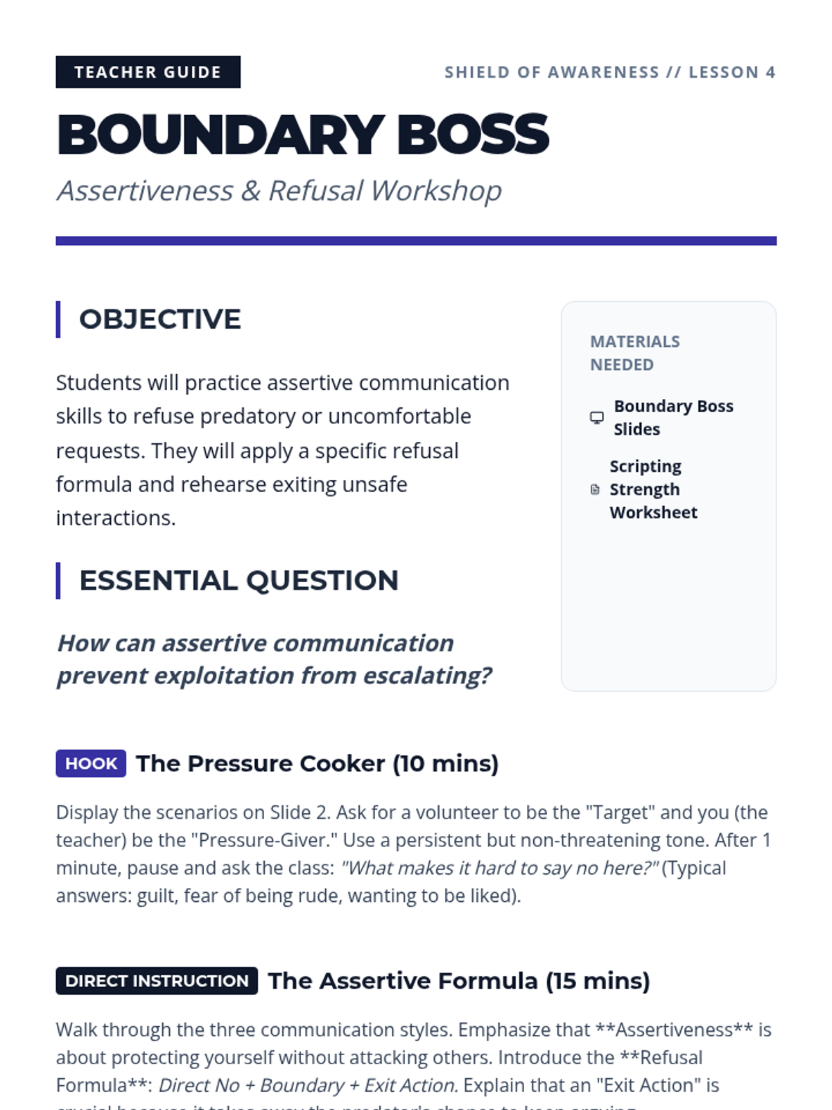 This sequence addresses the interpersonal dynamics of trafficking, focusing on healthy boundaries and the specific 'Romeo' or 'Boyfriend' coercion tactics often used against teens. Students will engage in workshops to practice assertiveness and recognize the difference between affection and control.