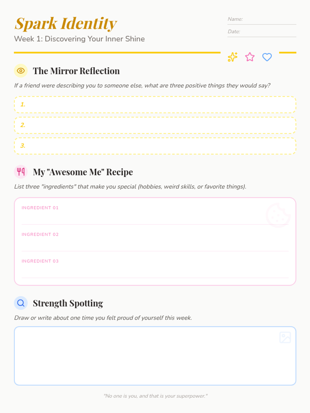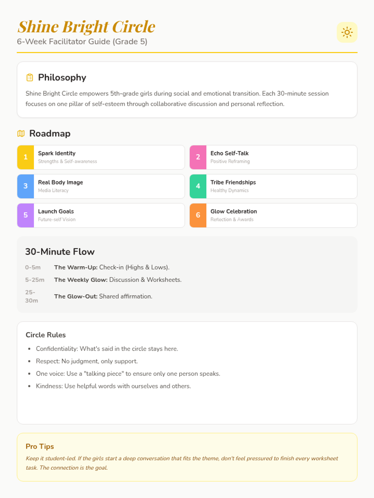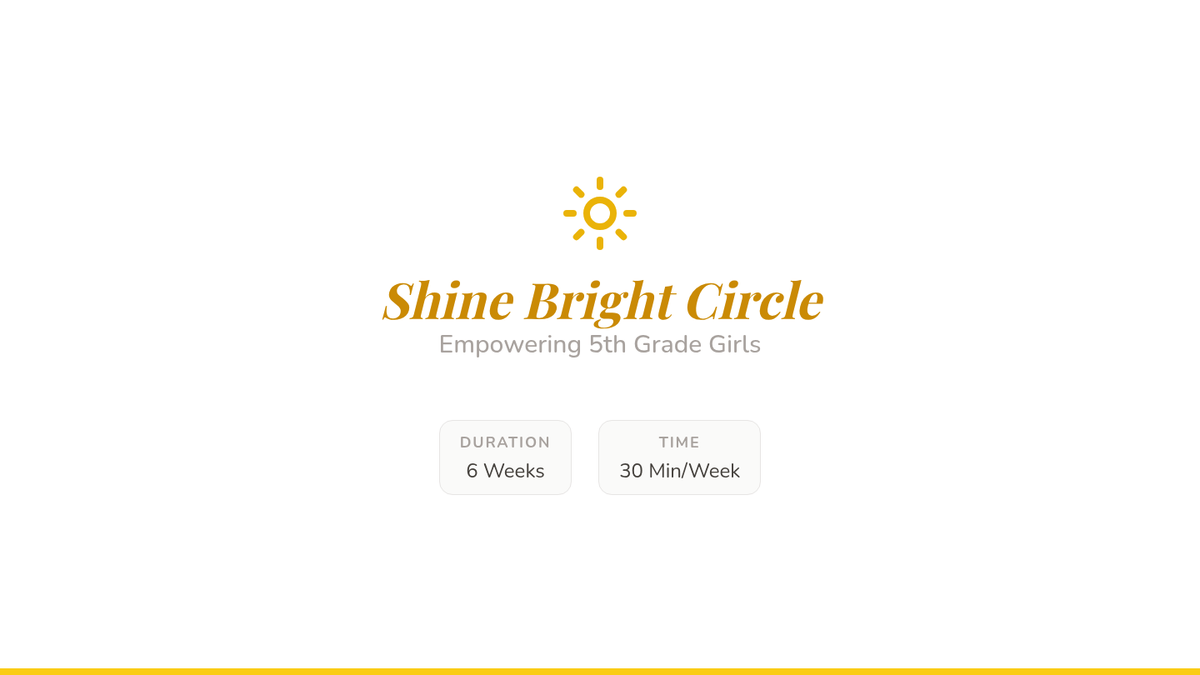 A 6-week self-esteem program for 5th-grade girls designed for 30-minute weekly sessions, covering identity, self-talk, body image, friendships, and goals.