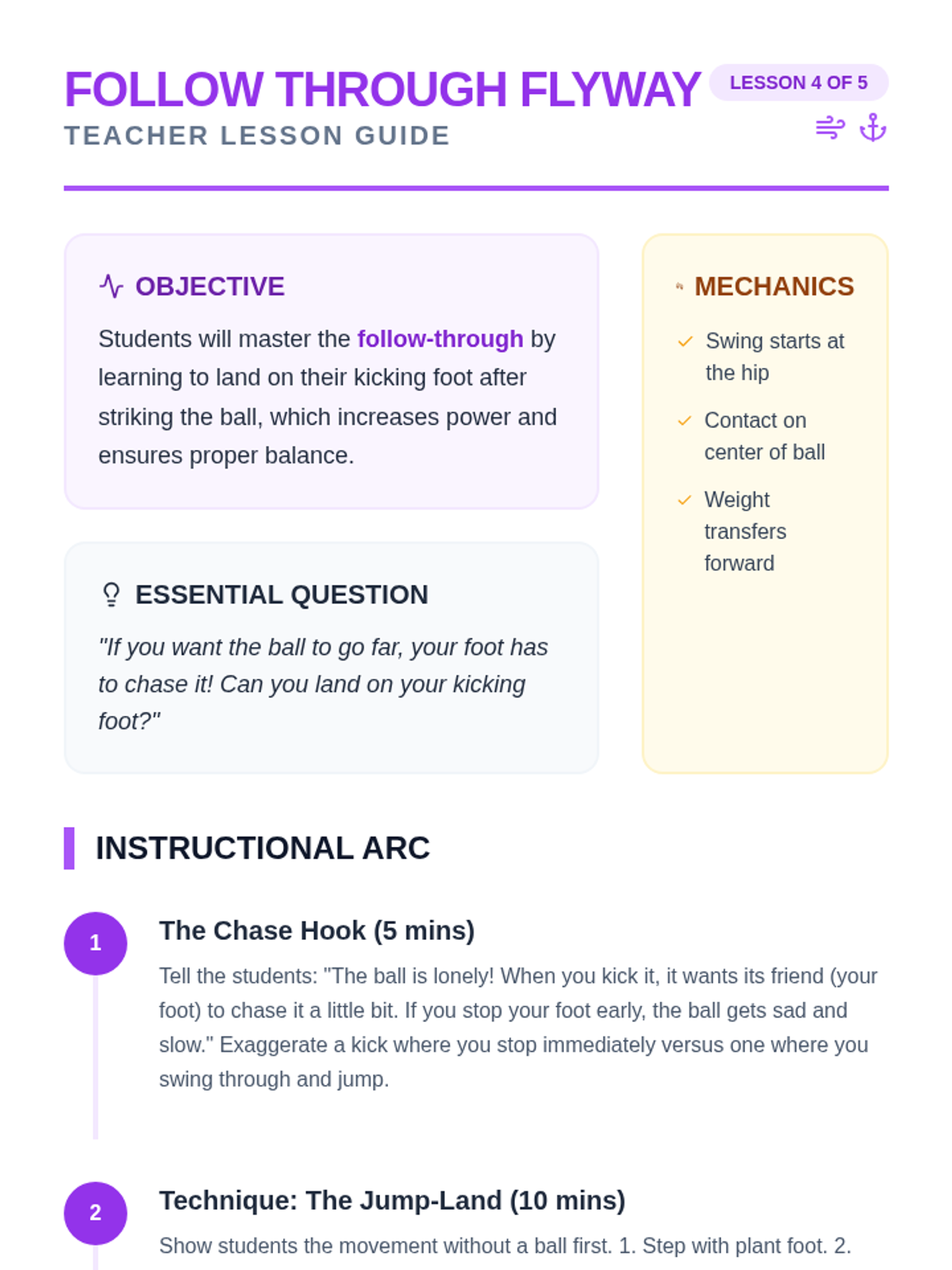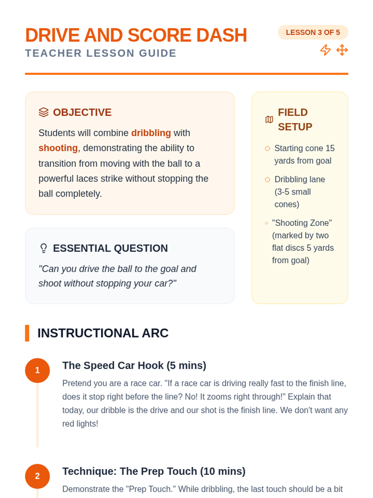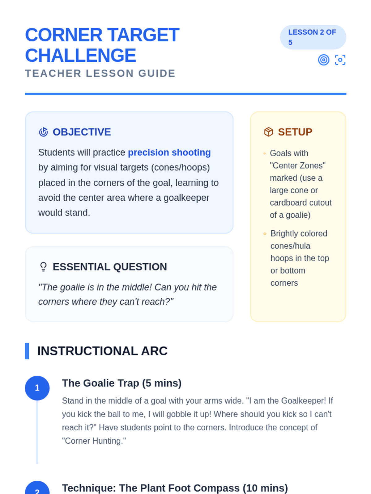 A 5-lesson sequence for Kindergarten students focusing on the mechanics and excitement of shooting in soccer, distinguishing it from passing through power, aim, and follow-through.