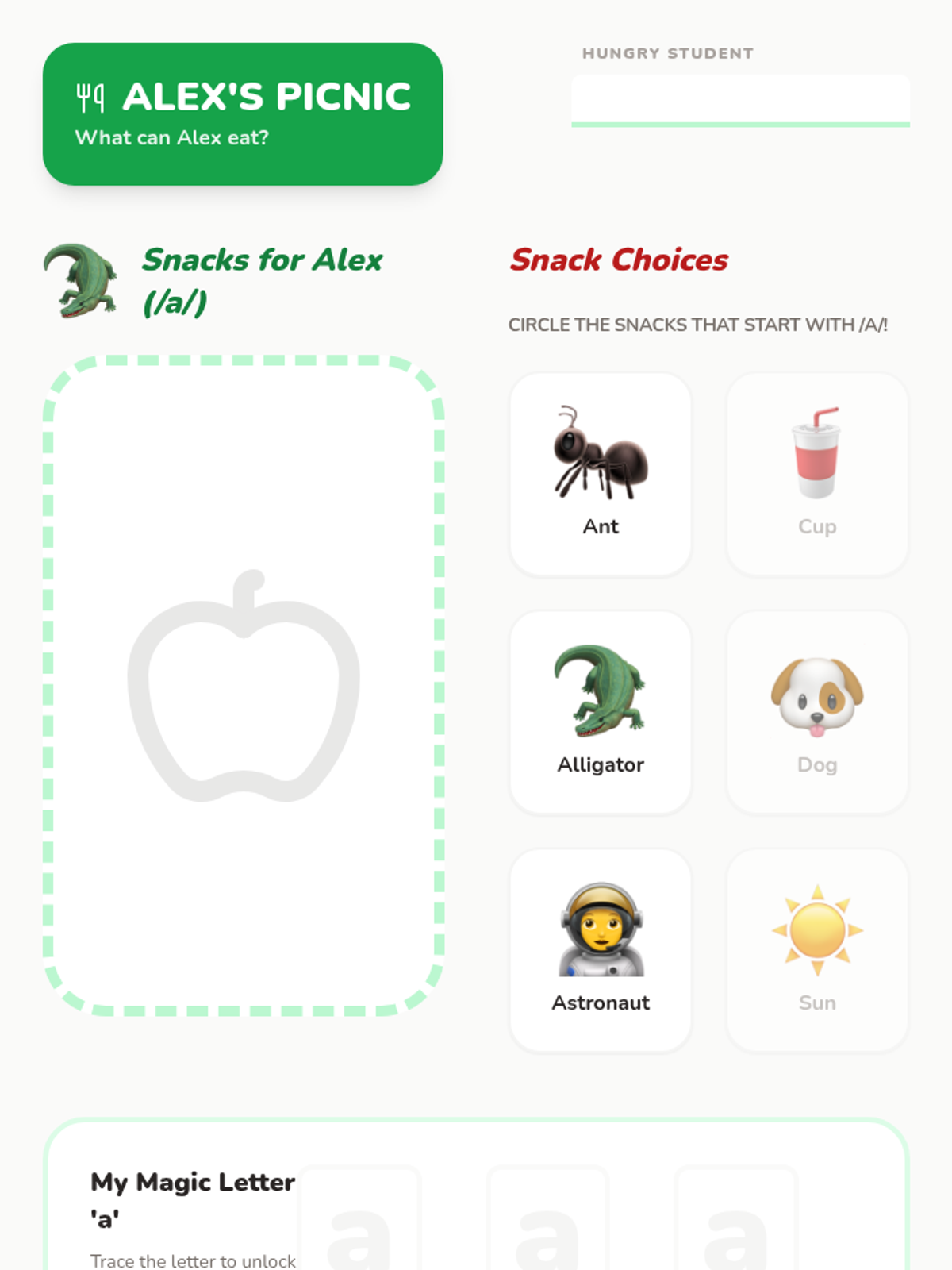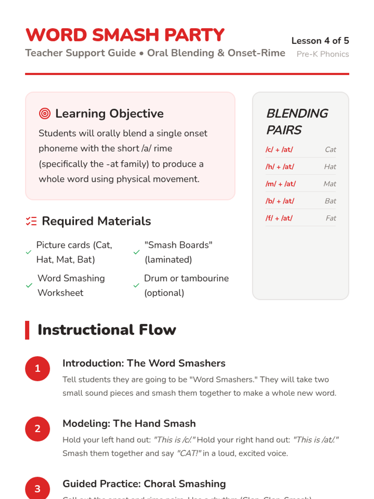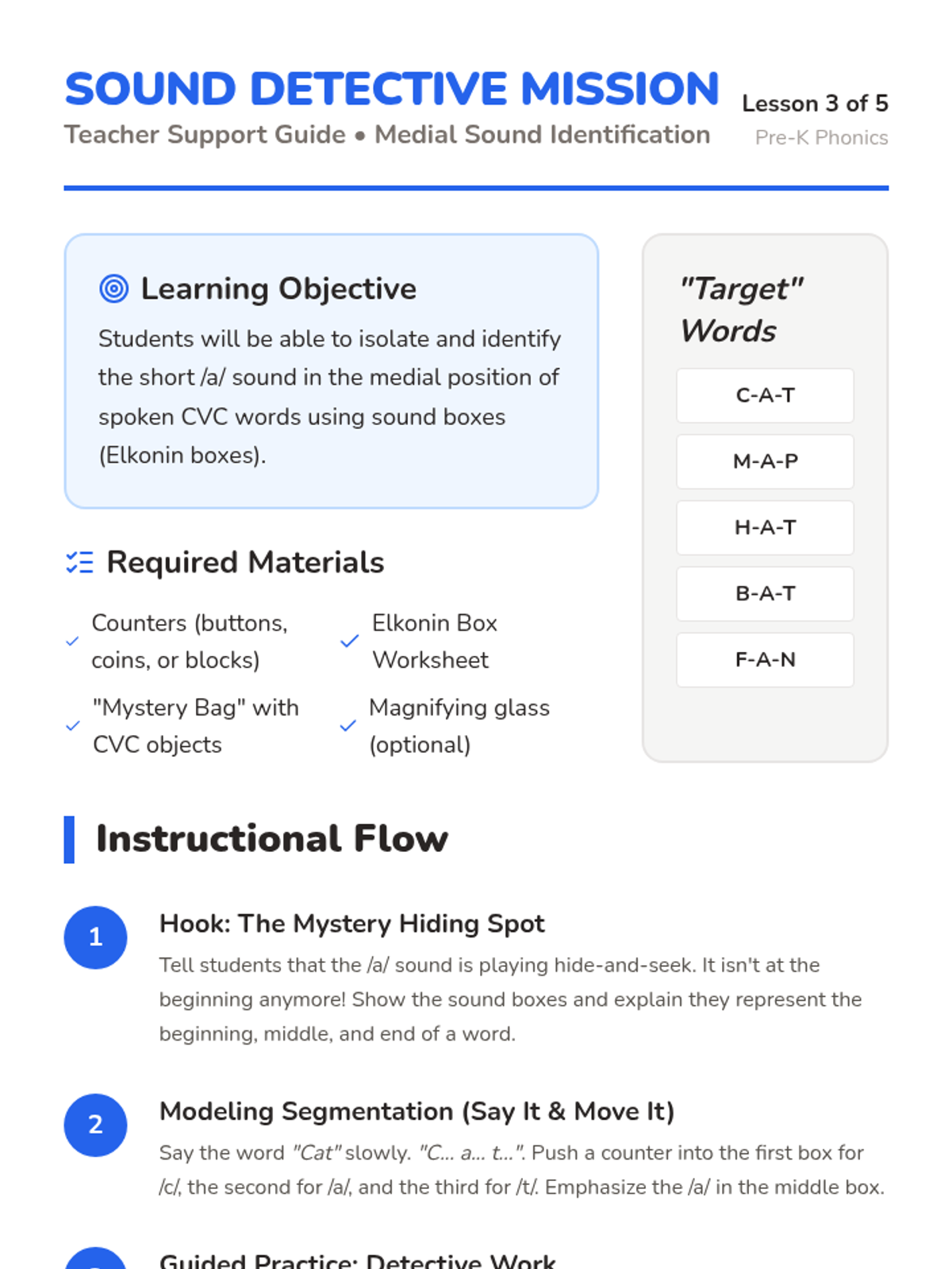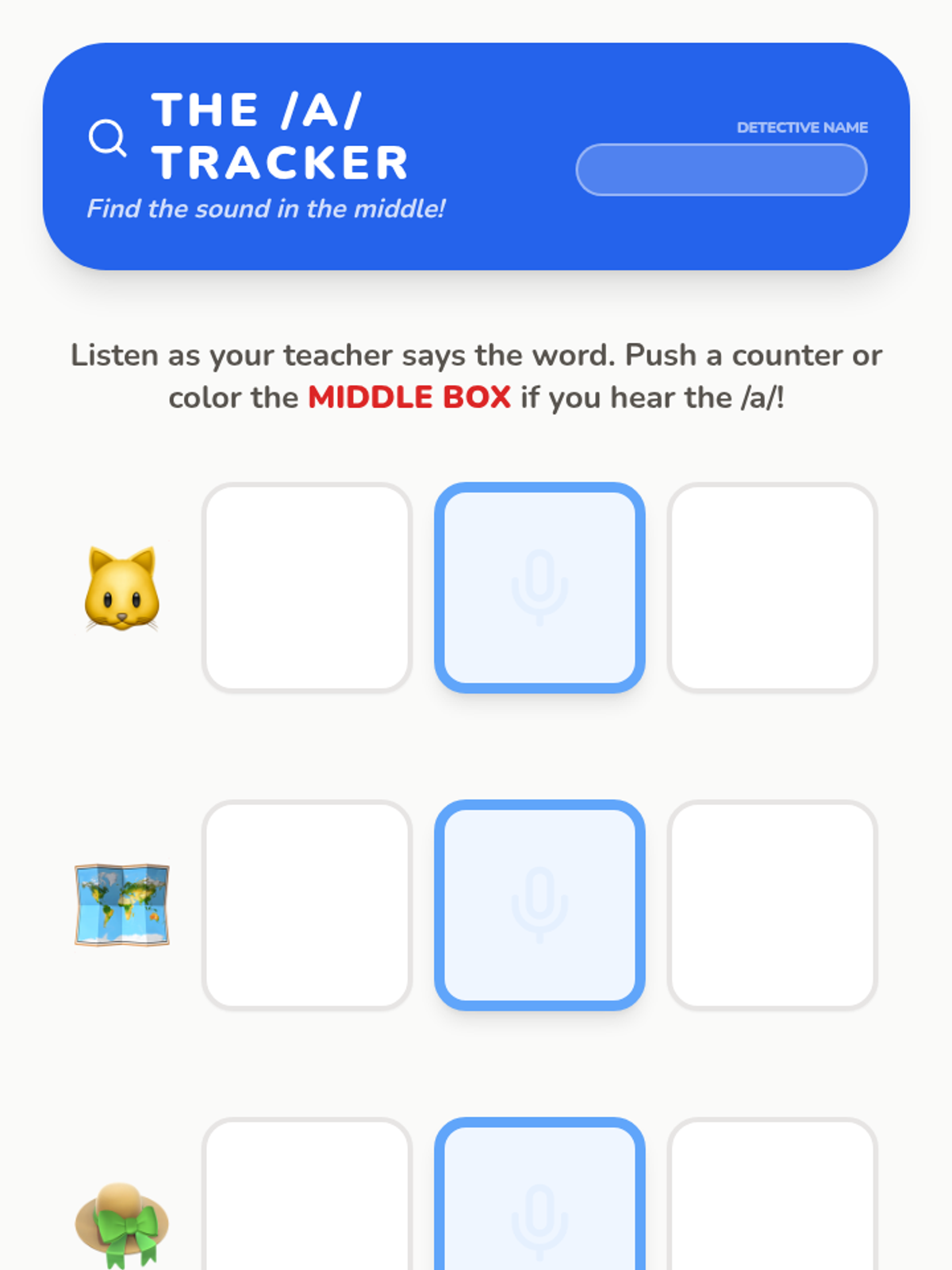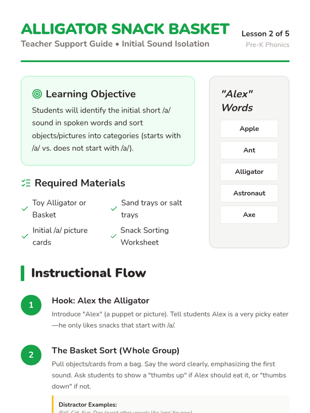 A comprehensive Pre-K sequence focused on phonemic awareness and articulation of the short /a/ sound. Students explore mouth mechanics, isolate initial and medial sounds, and practice oral blending through multi-sensory activities.