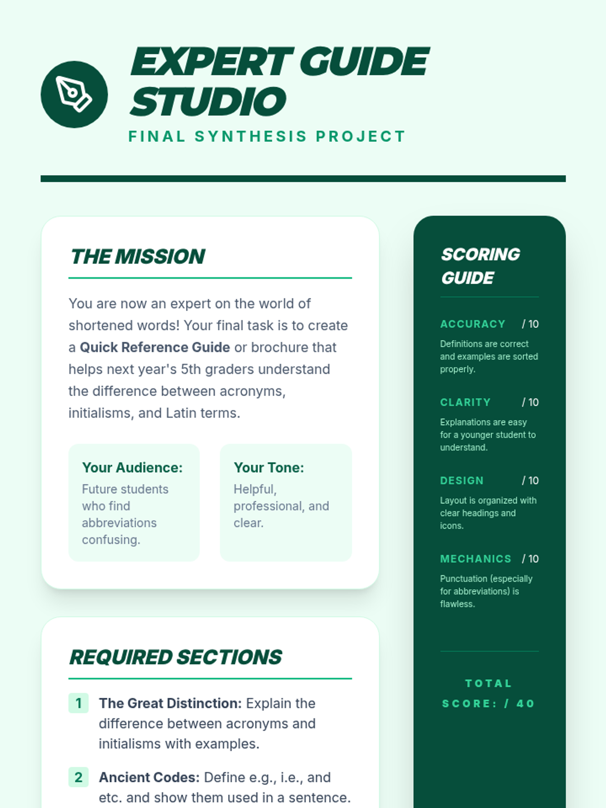 This inquiry-based sequence explores the nuances of acronyms, initialisms, and Latin-based abbreviations found in informational text. Students investigate the origins of these terms, distinguish between those pronounced as words versus individual letters, and produce an informational guide for their peers.