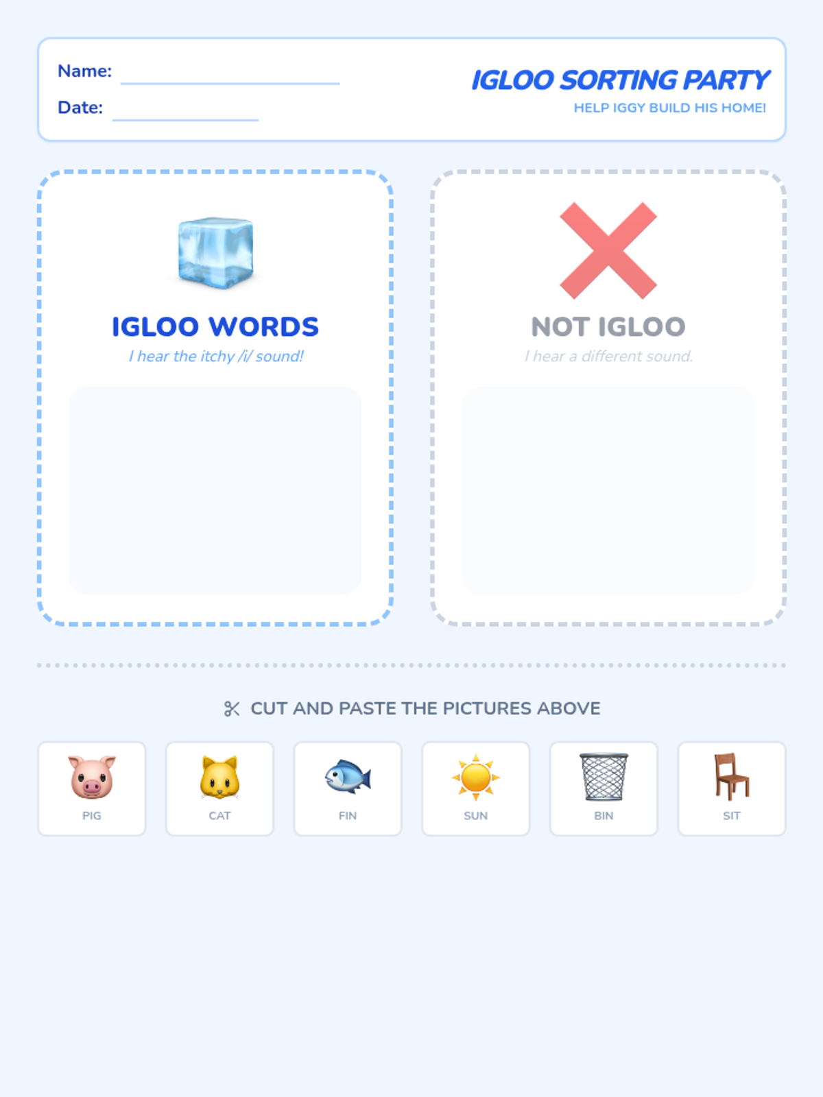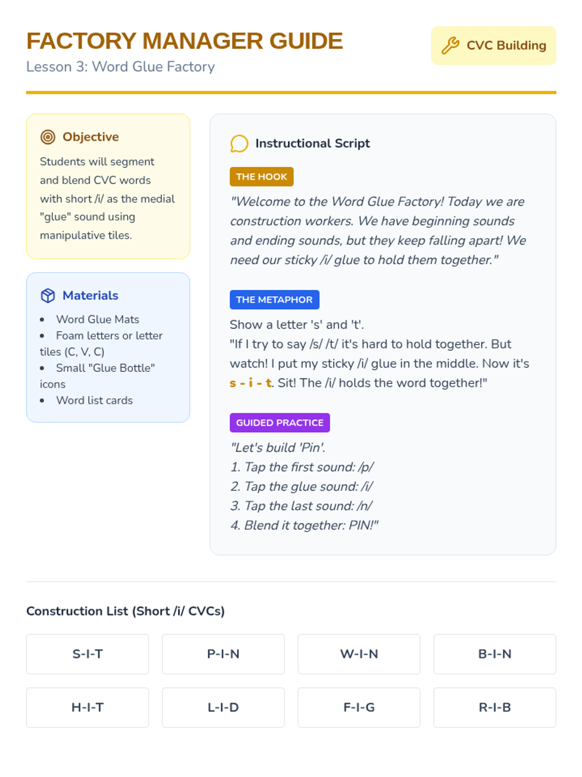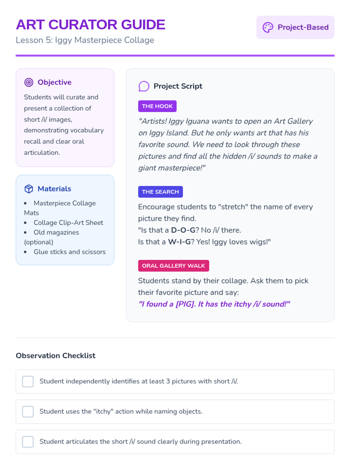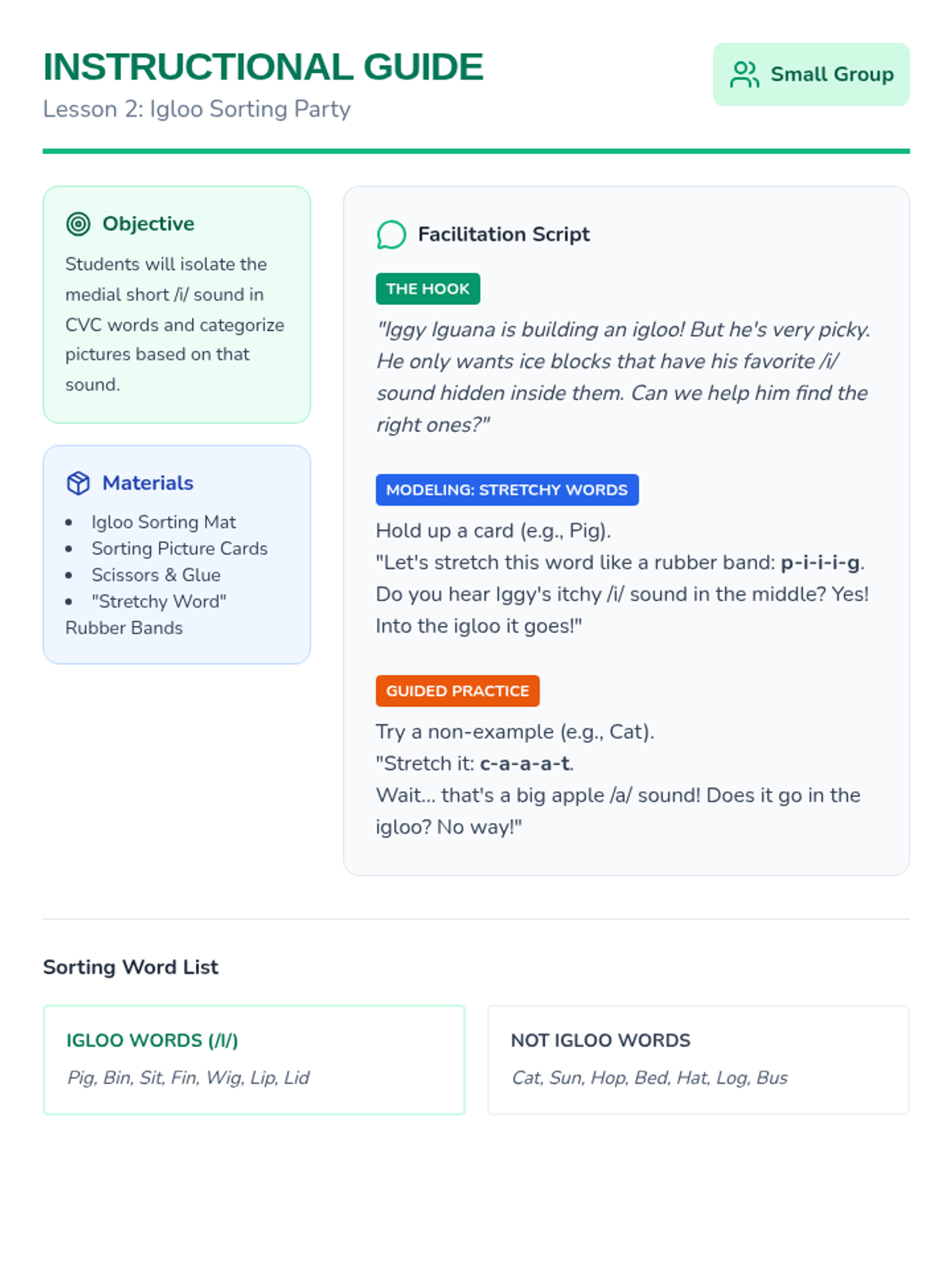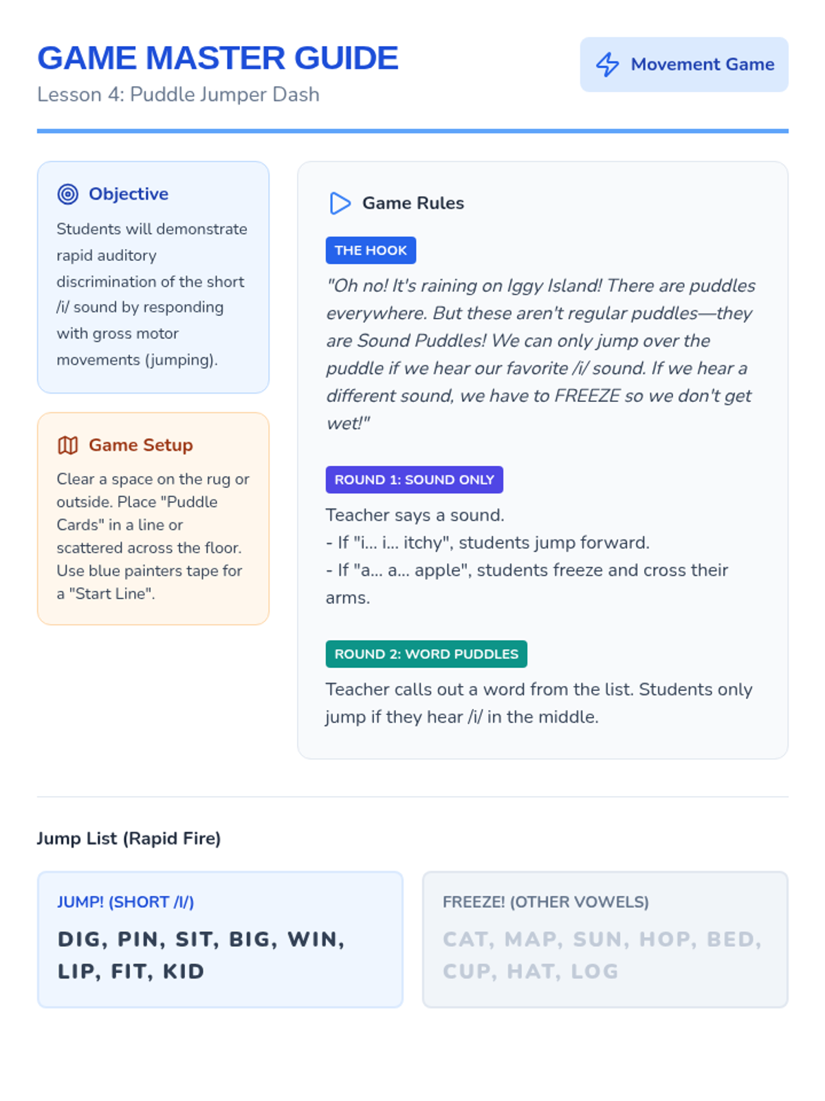 A game-based phonics sequence for Pre-K students focused on discriminating and blending the short /i/ sound using the 'Iggy Iguana' character and 'itchy' tactile cues.