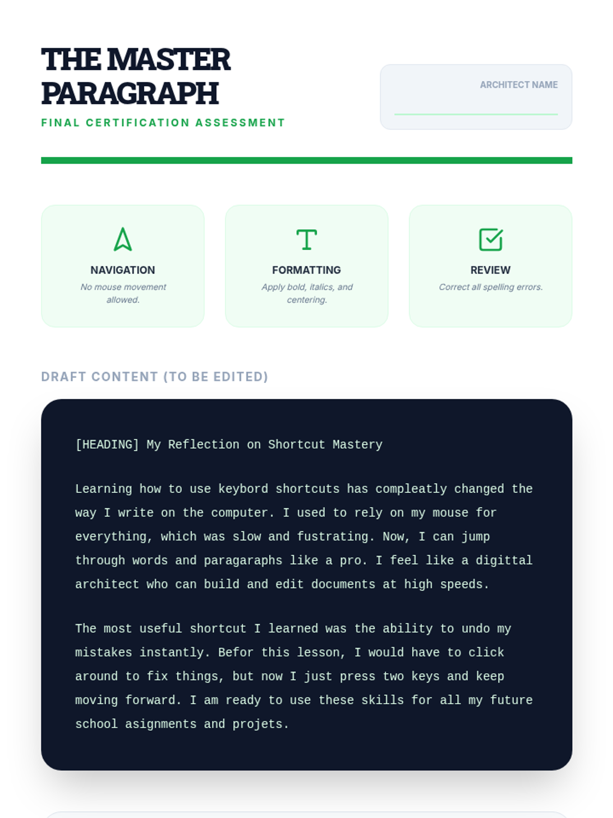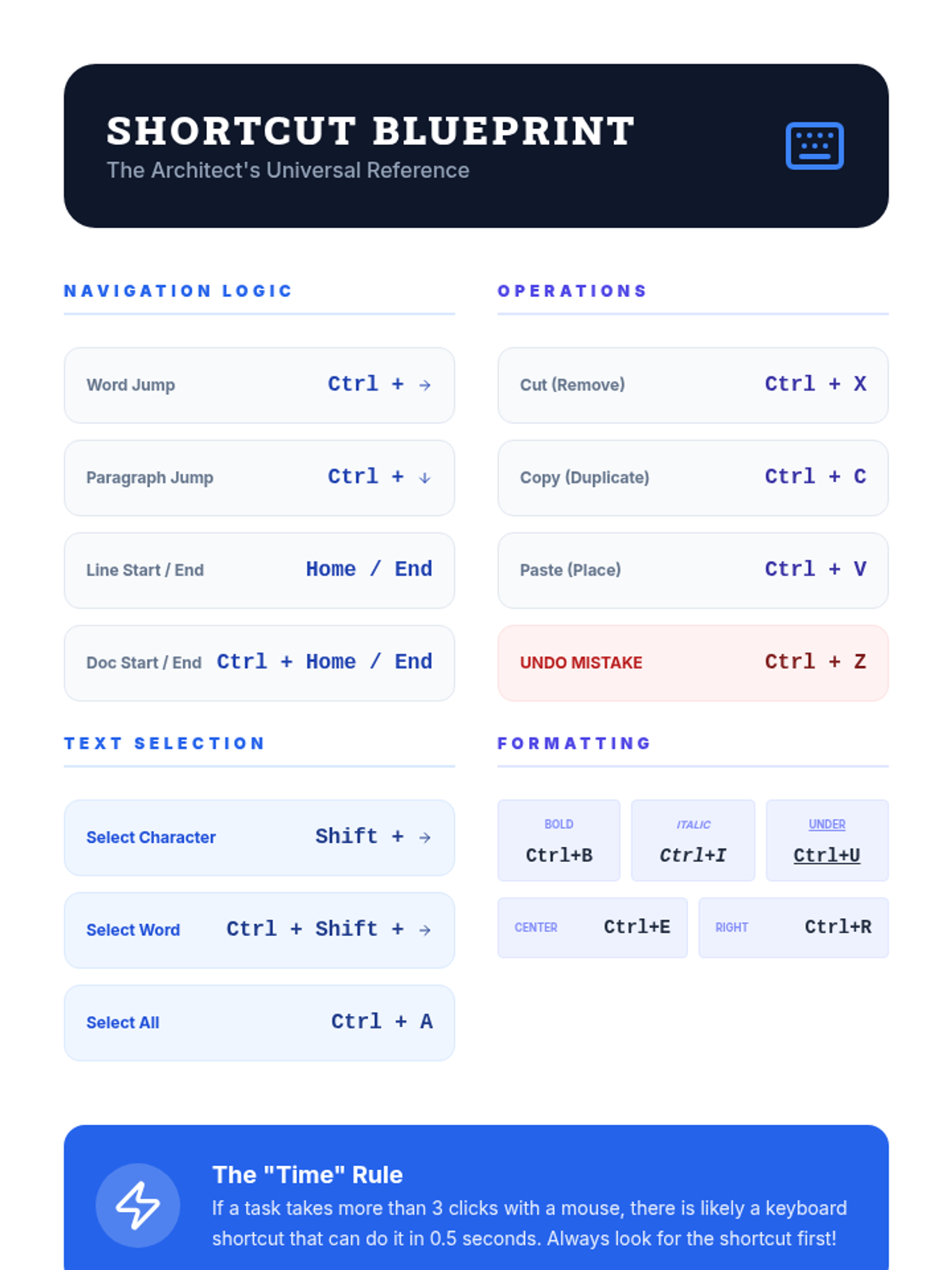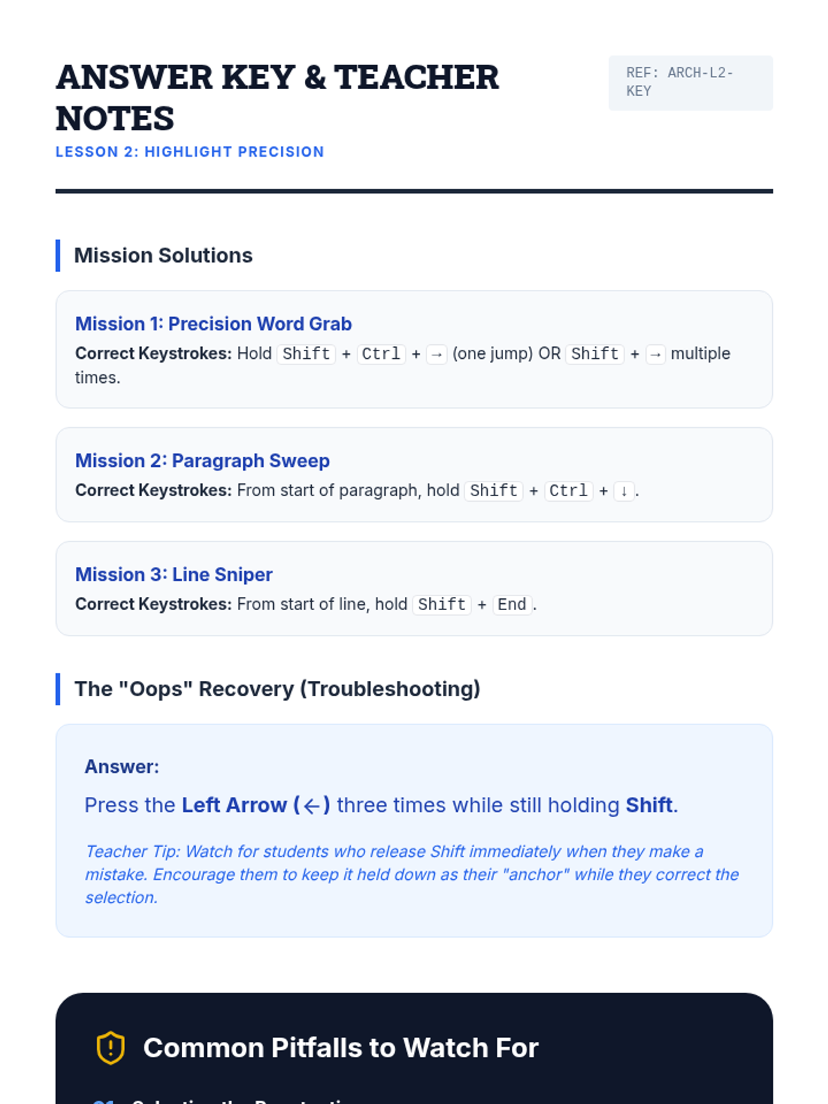 This workshop-style sequence equips 9th-grade students with essential keyboard shortcuts for academic writing and editing, moving from basic cursor navigation to advanced document formatting and review.