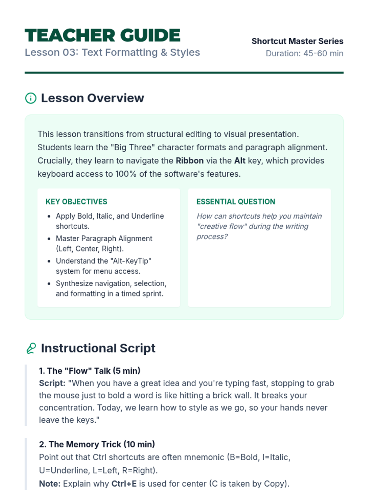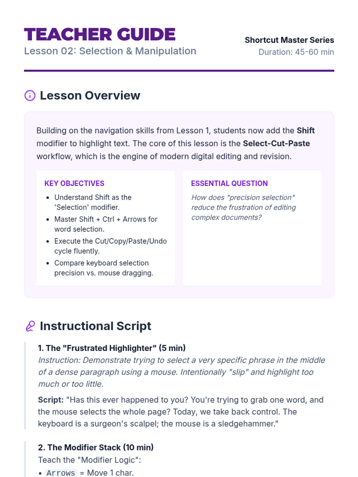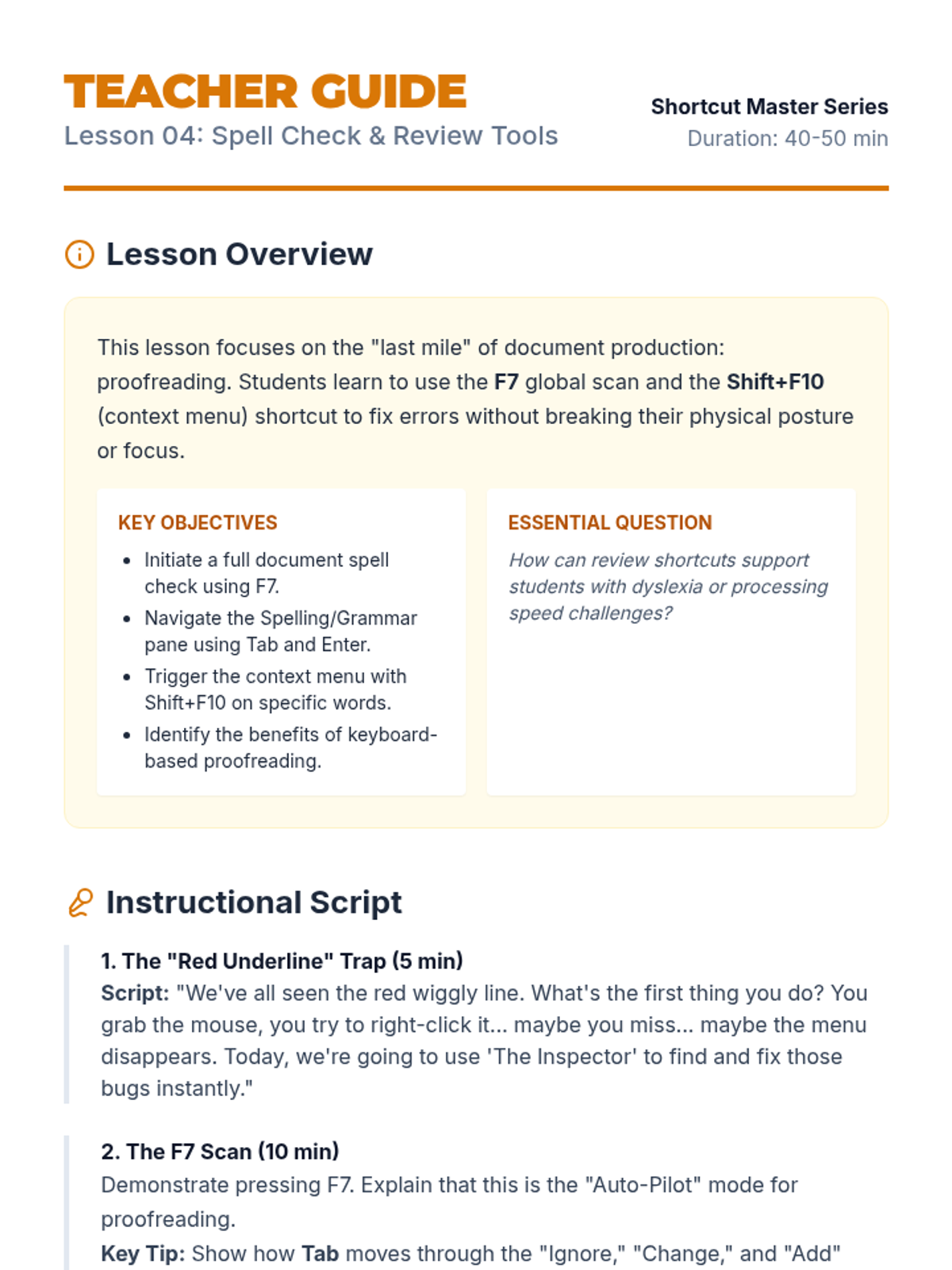 A specialized sequence for 10th-grade students to master keyboard navigation and document editing techniques. This unit reduces physical strain and increases digital productivity through intentional shortcut mastery.