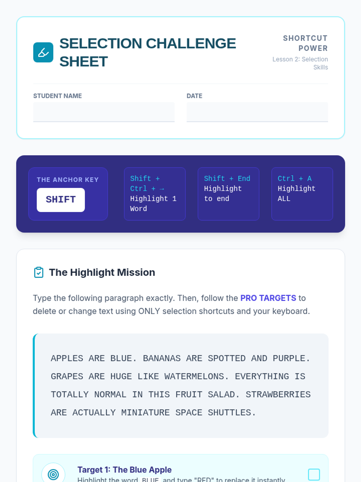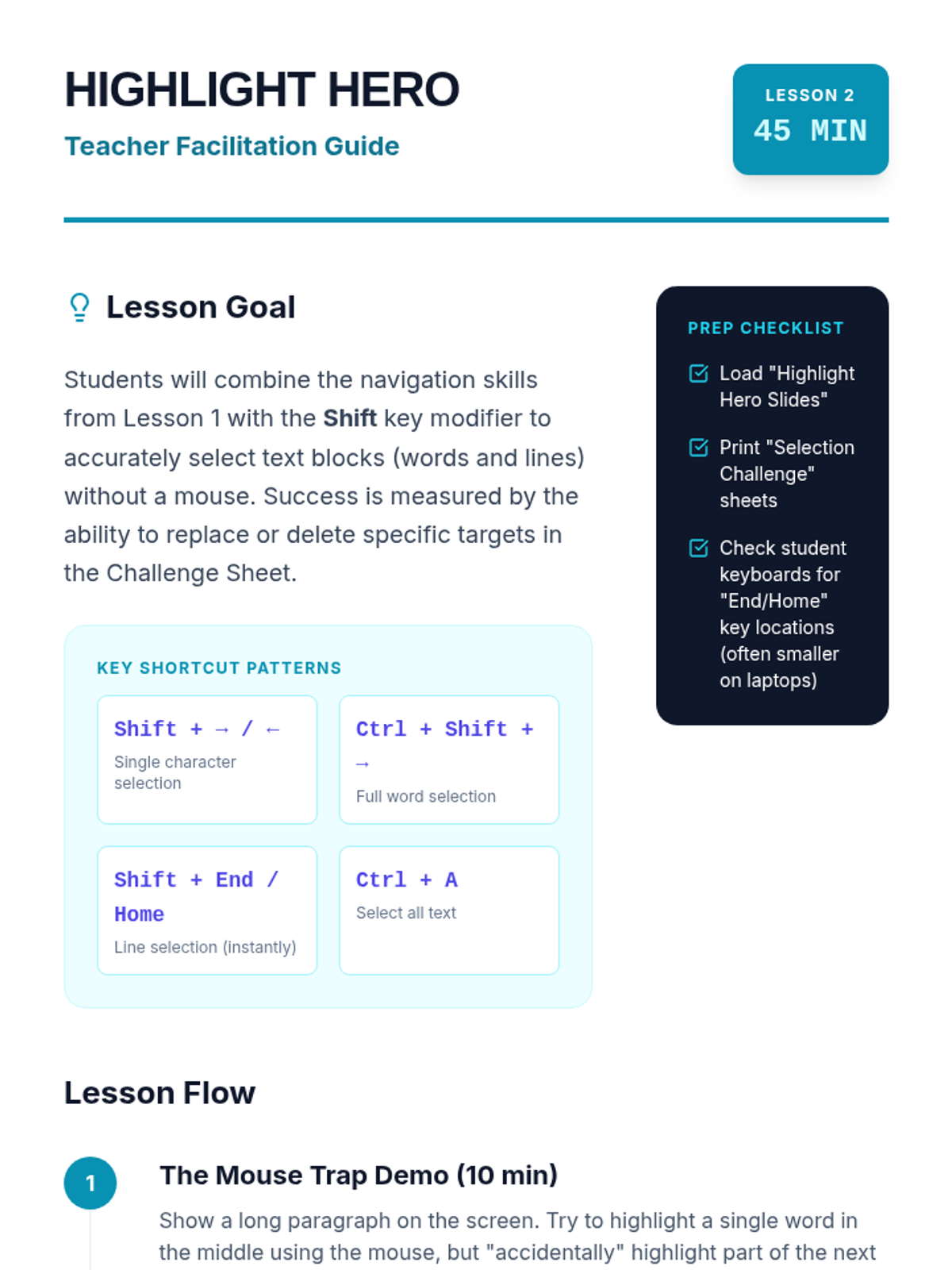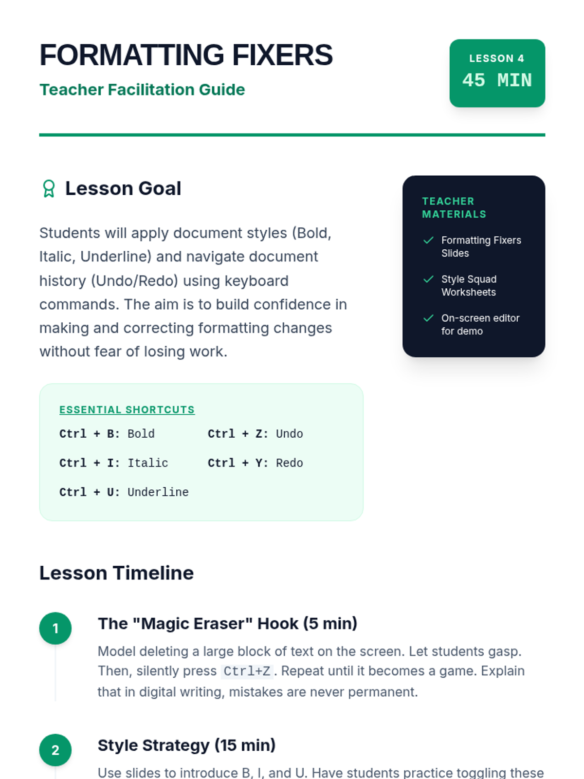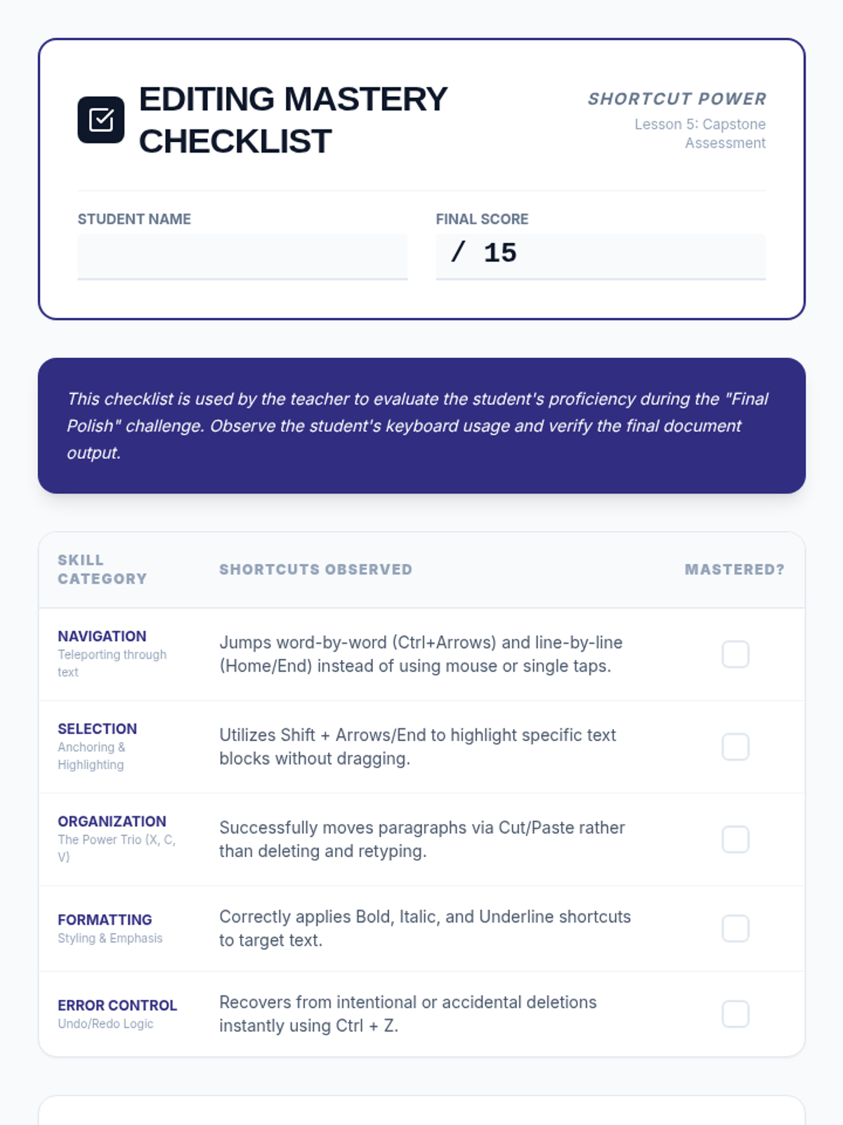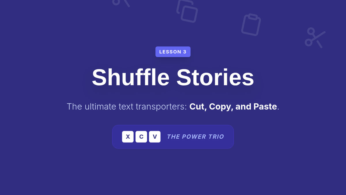A 5-lesson series teaching 6th-grade students essential keyboard shortcuts for efficient document editing and formatting, specifically designed to support students with motor impairments and improve academic production speed.