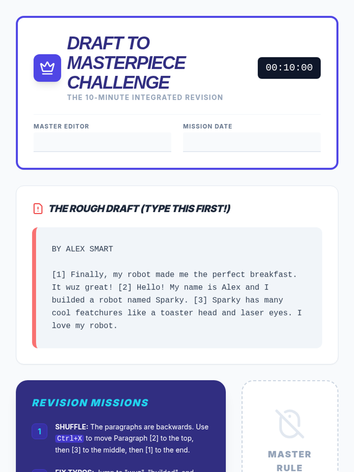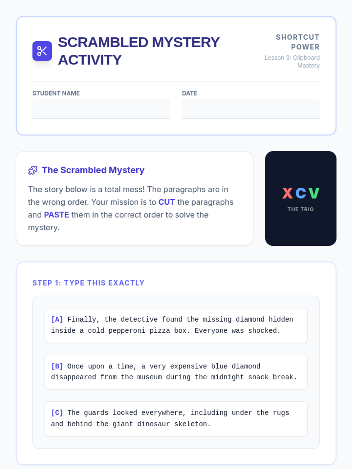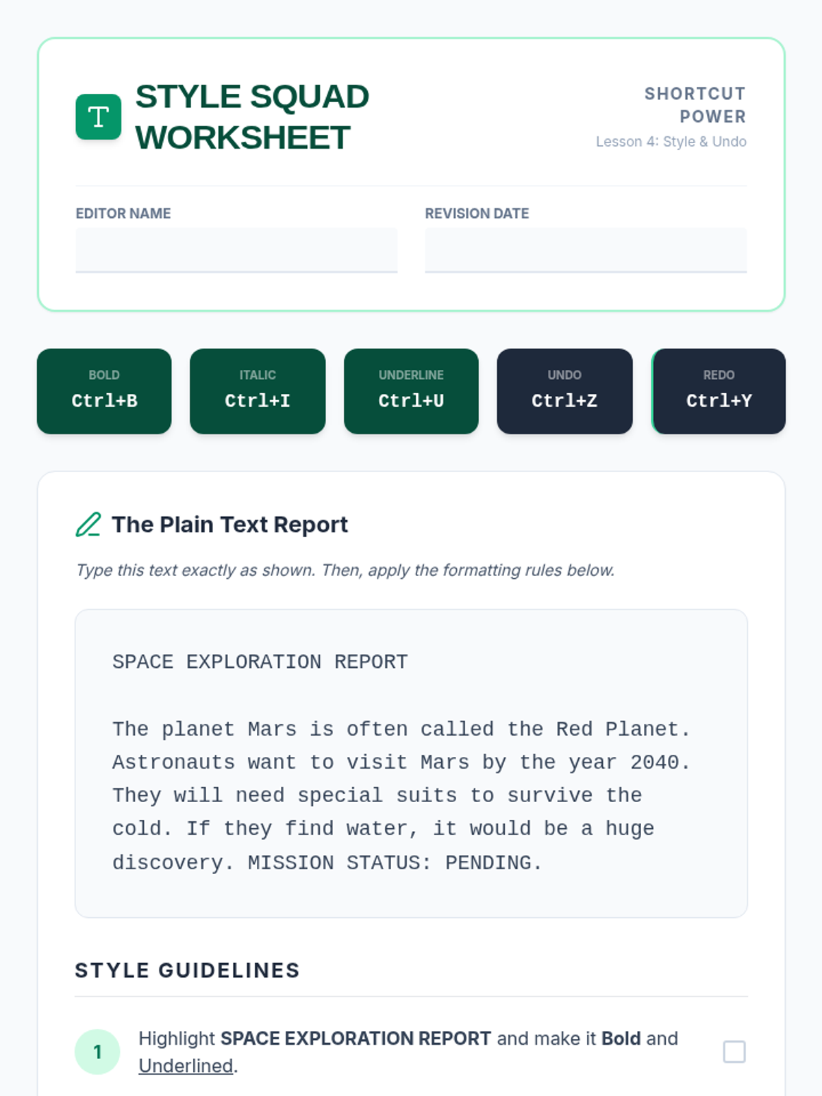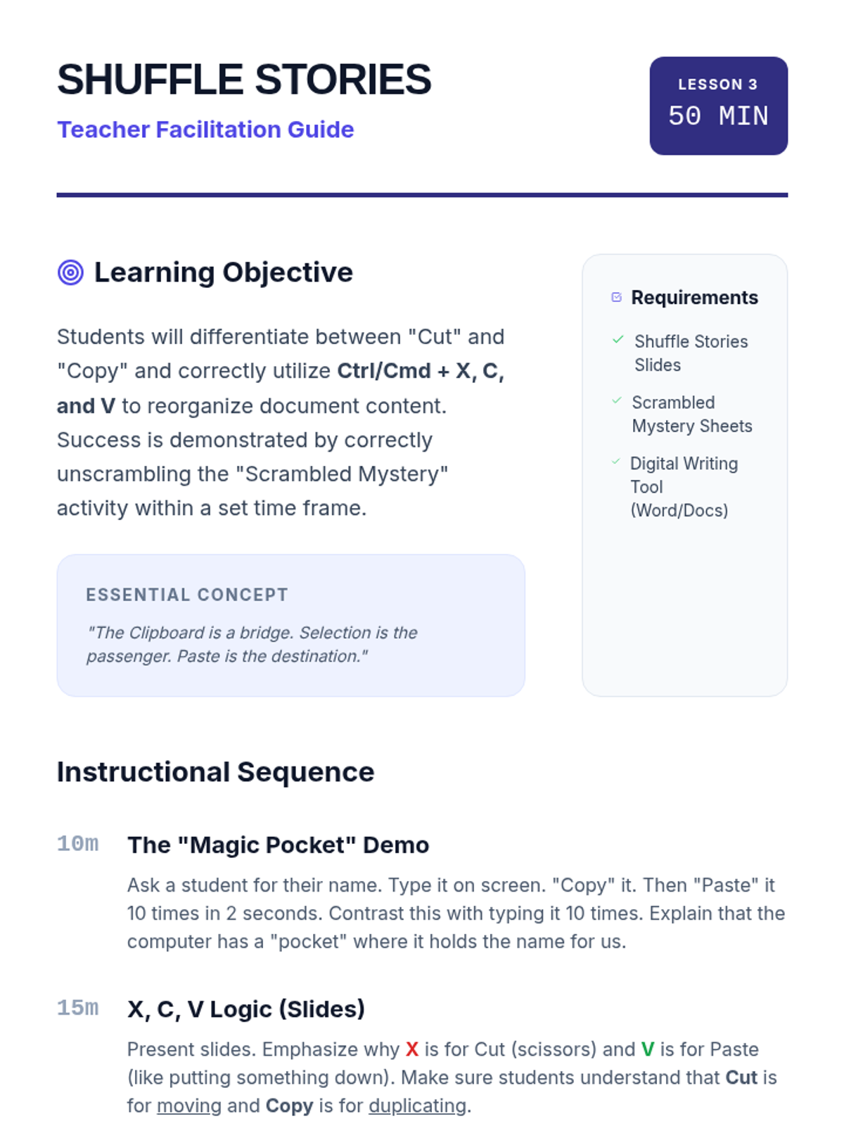 A 5-lesson series teaching 6th-grade students essential keyboard shortcuts for efficient document editing and formatting, specifically designed to support students with motor impairments and improve academic production speed.