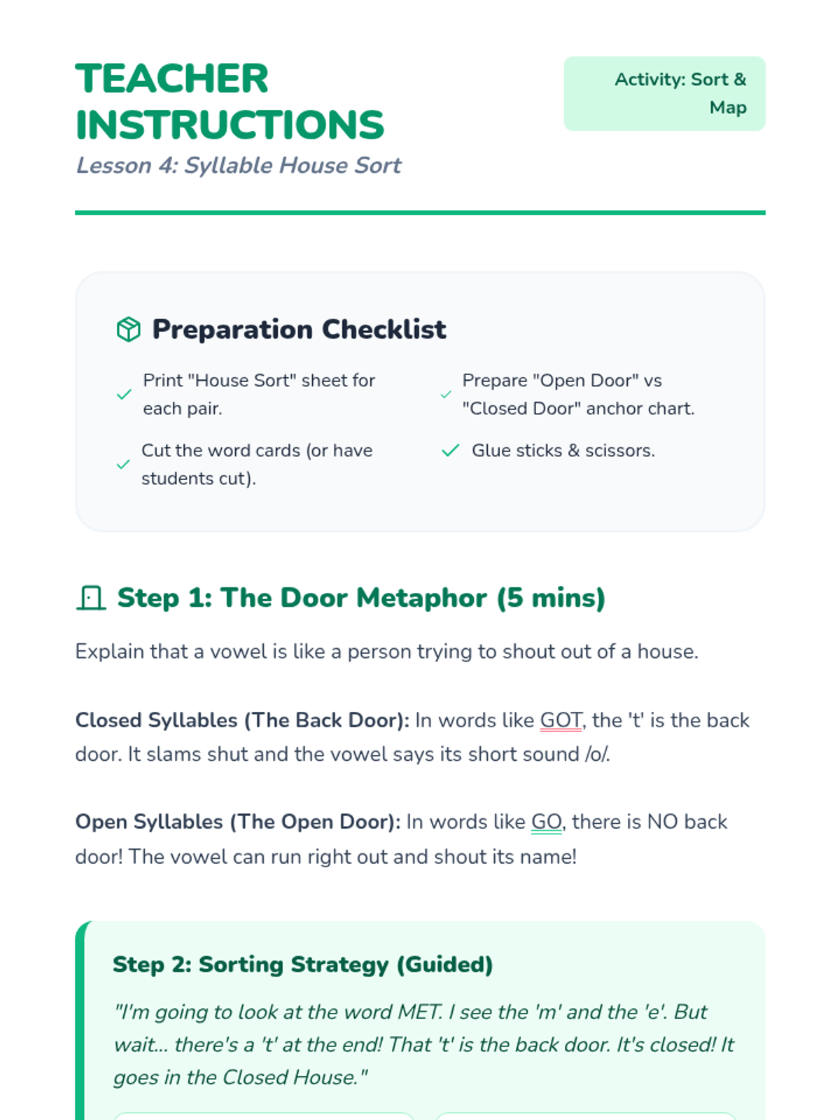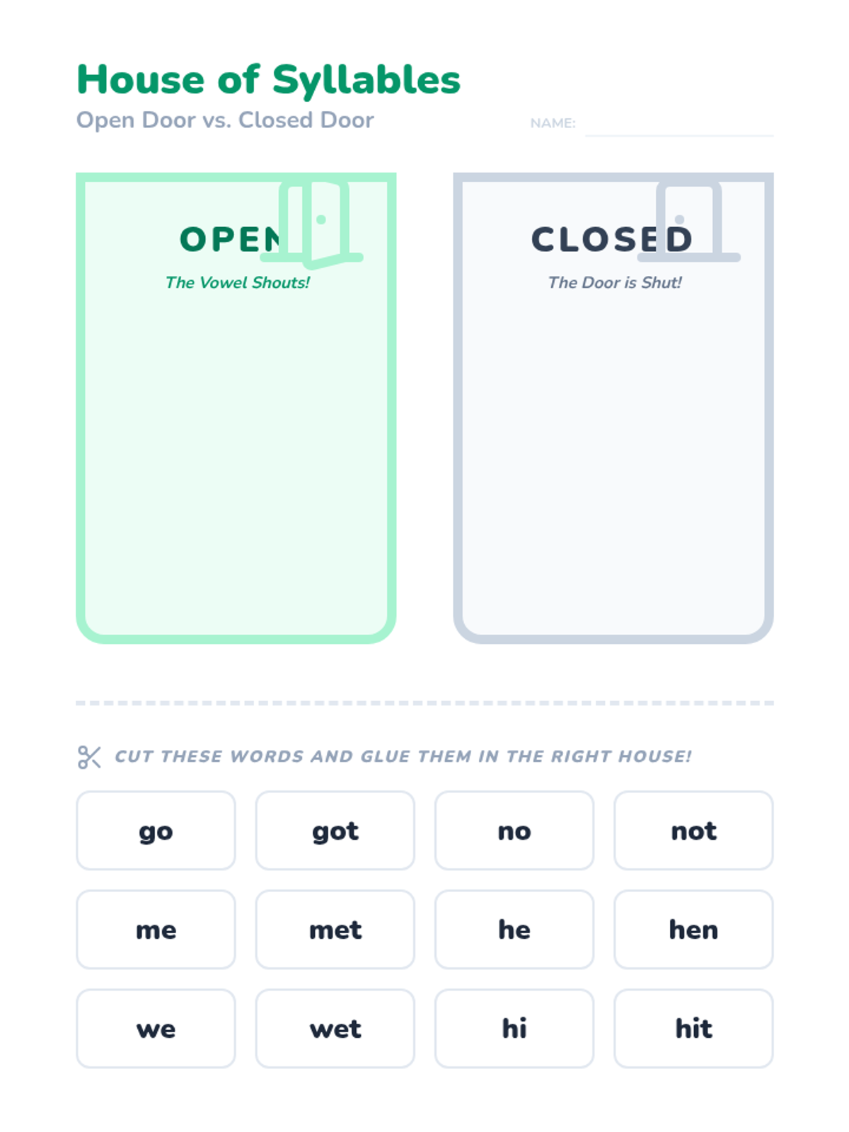 A Kindergarten phonics sequence focusing on the difference between open and closed syllables. Students learn the 'Open Door' metaphor to understand why vowels sometimes shout their own names (long sounds) versus making their short sounds.