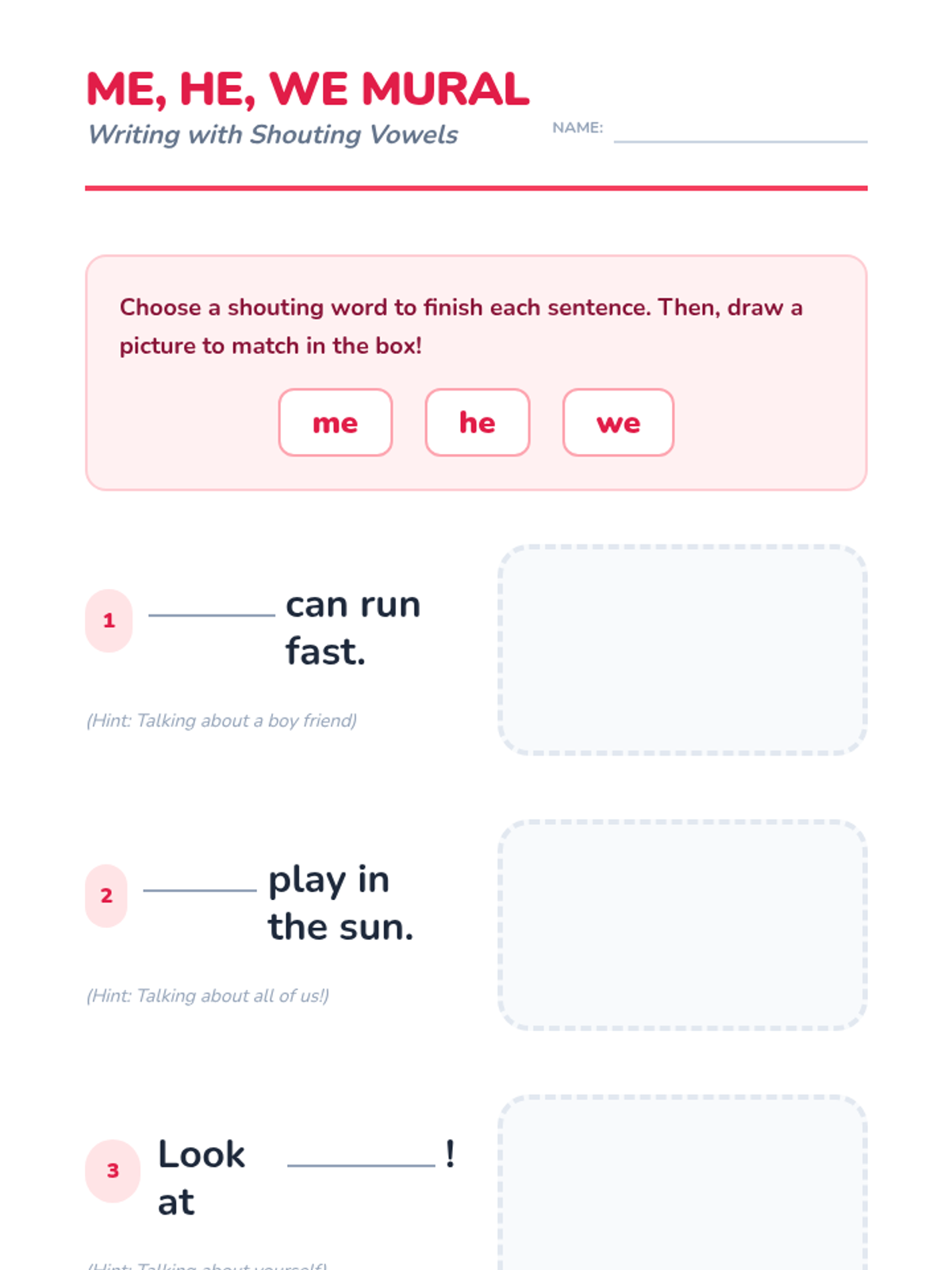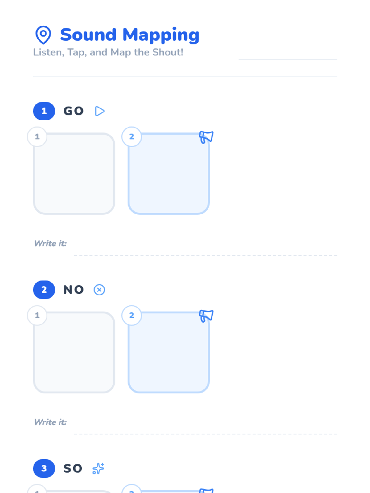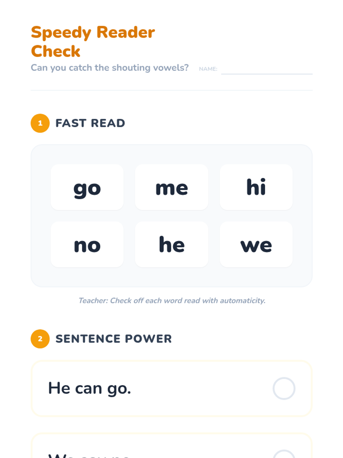 A Kindergarten phonics sequence focusing on open syllables (go, me, hi). Students learn to identify the 'open' mouth shape of long vowel sounds and map these sounds to letters in high-frequency words through sorting, mapping, and games.