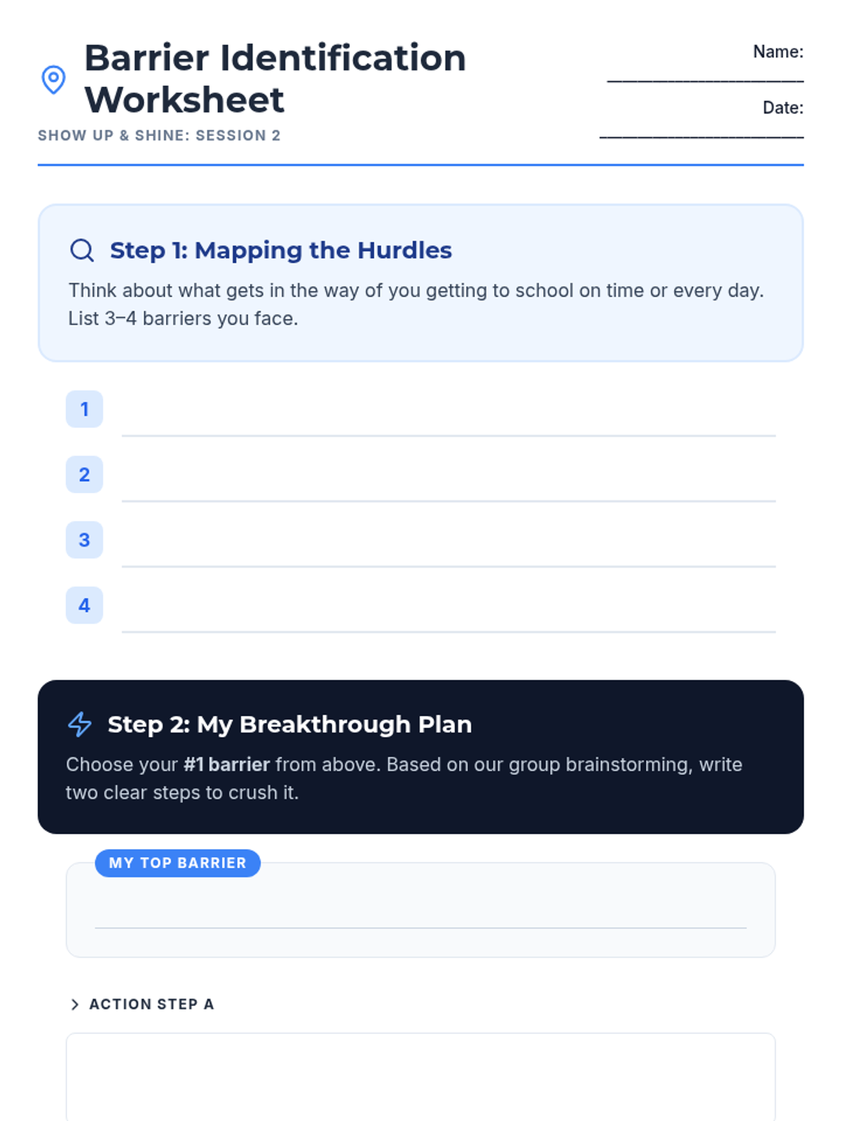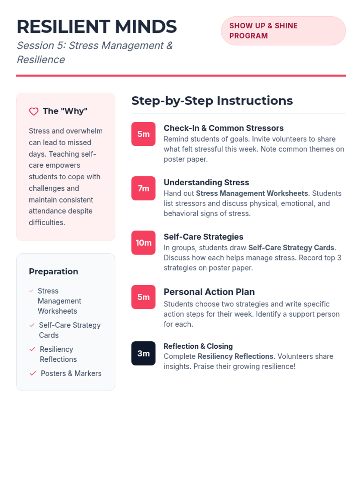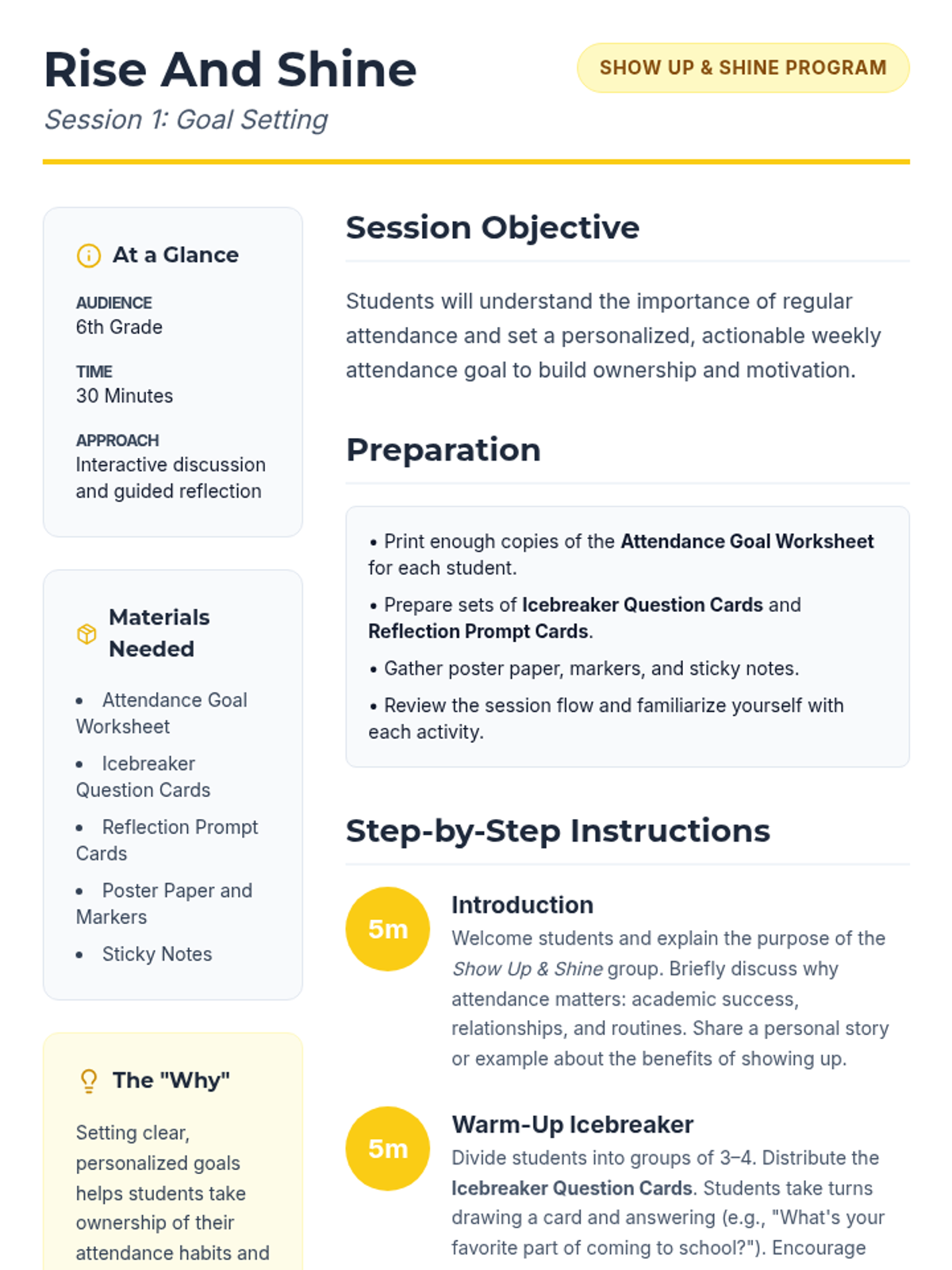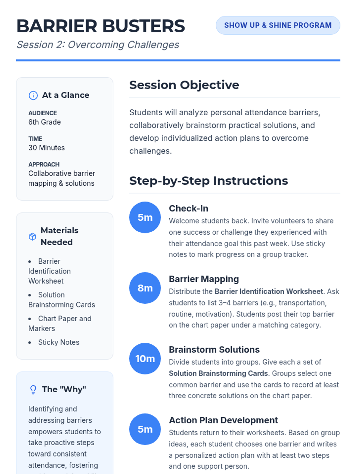 A 7-week group program for 6th graders designed to improve school attendance through goal-setting, barrier identification, peer support, and resilience building. Students develop personal action plans and routines to foster intrinsic motivation and commitment to attending school regularly.