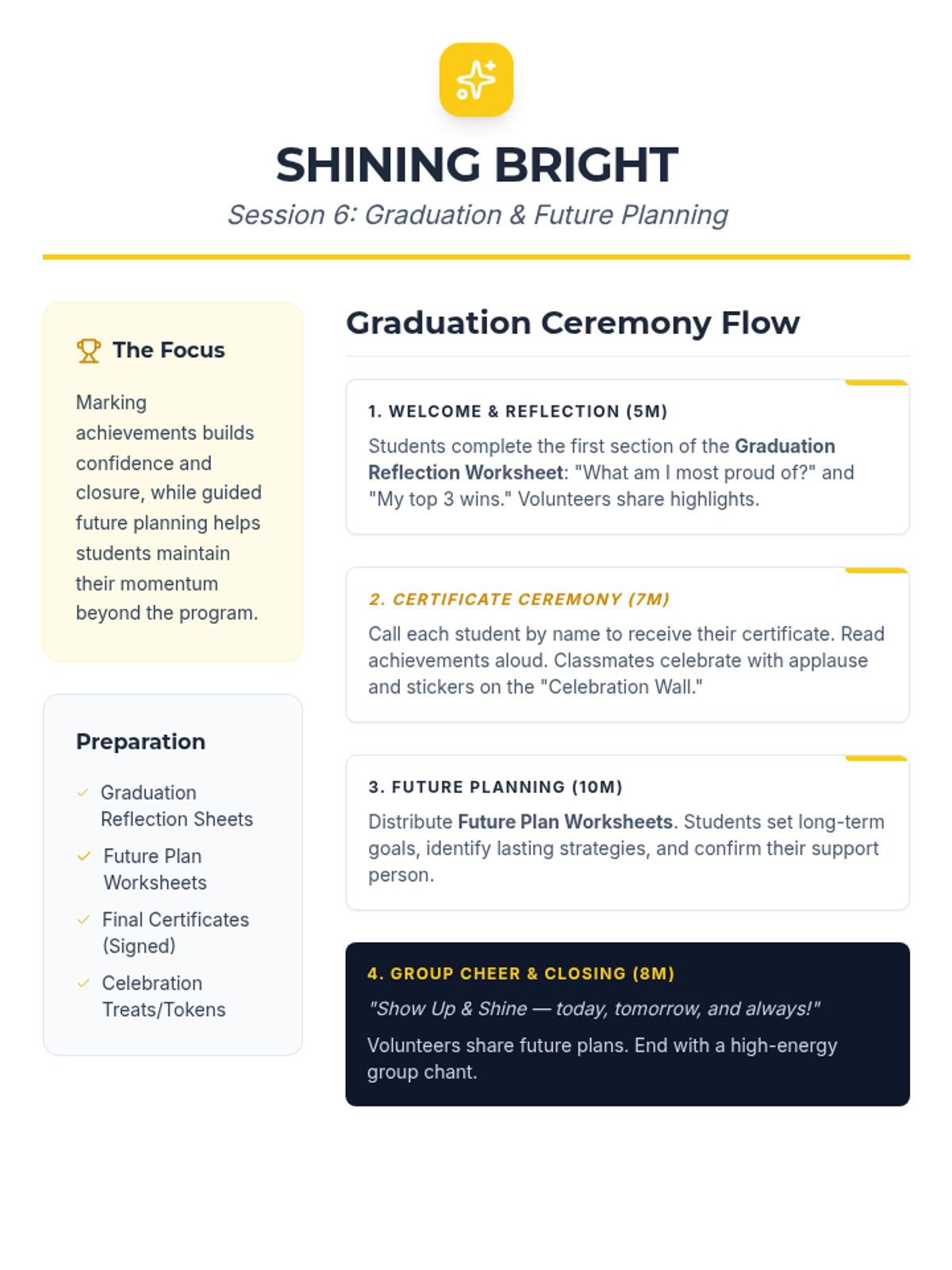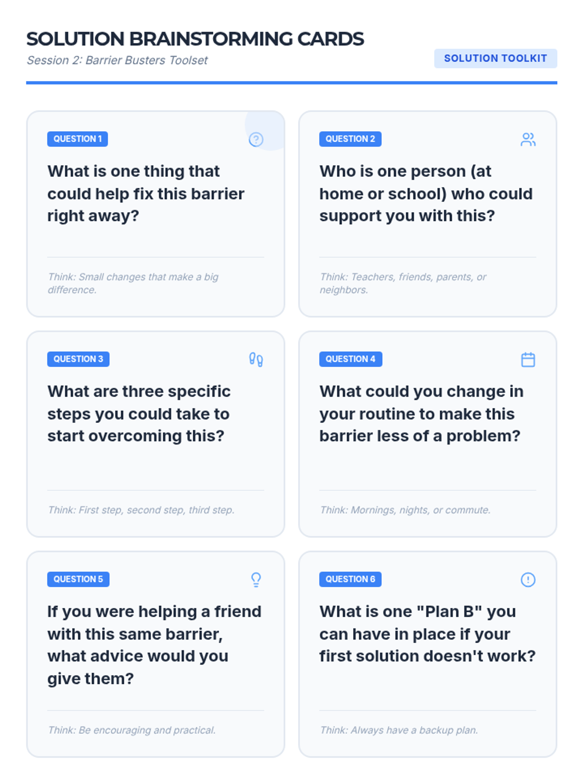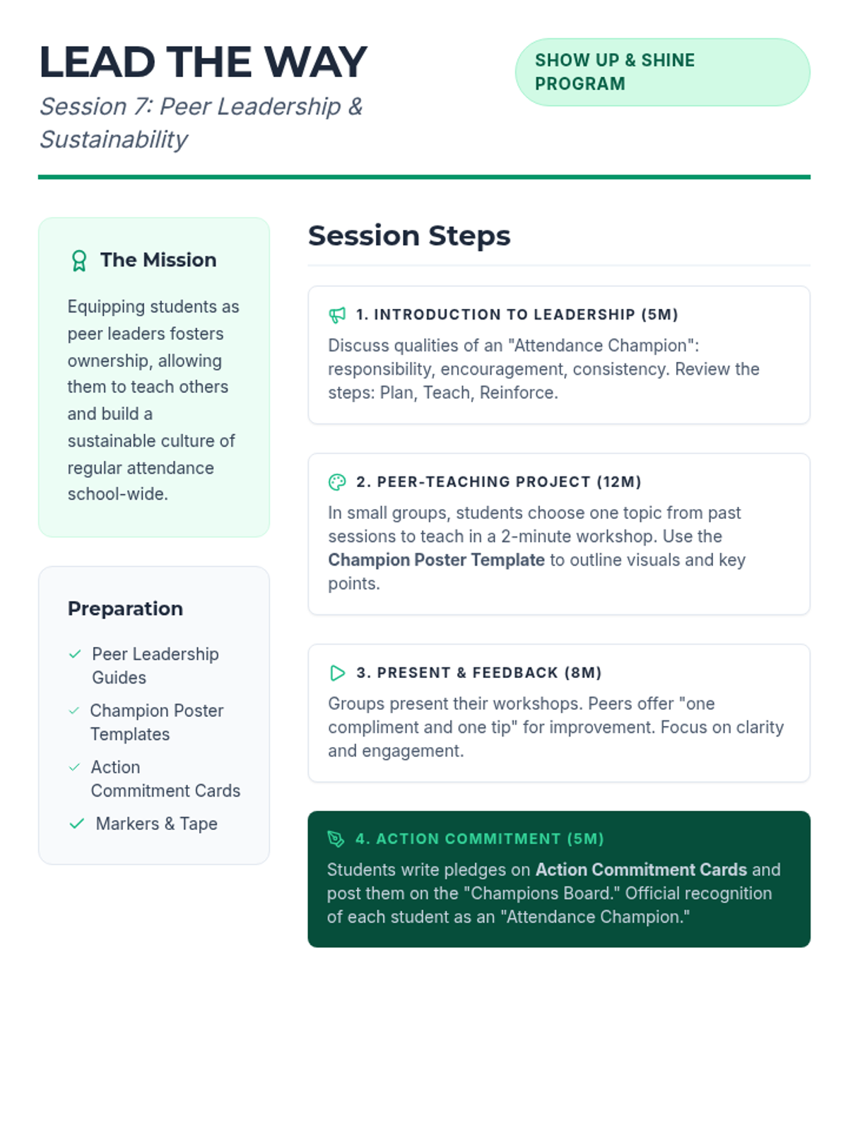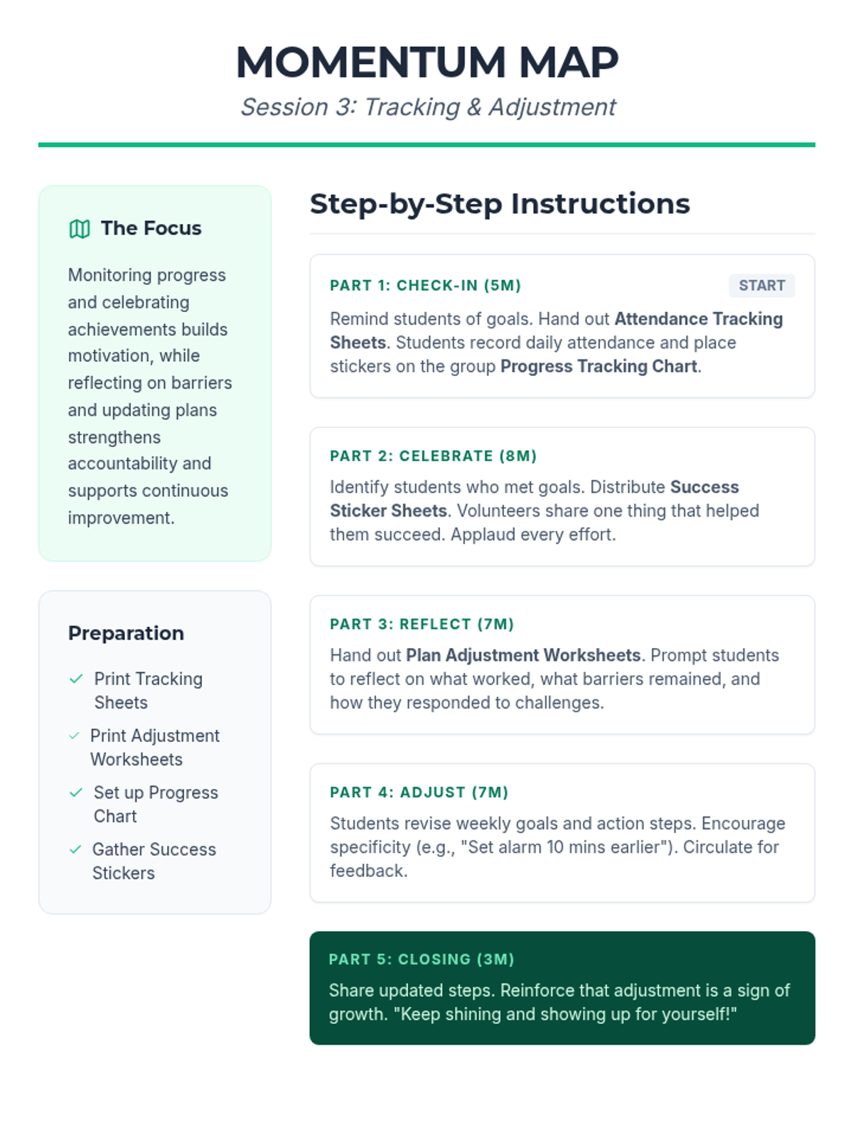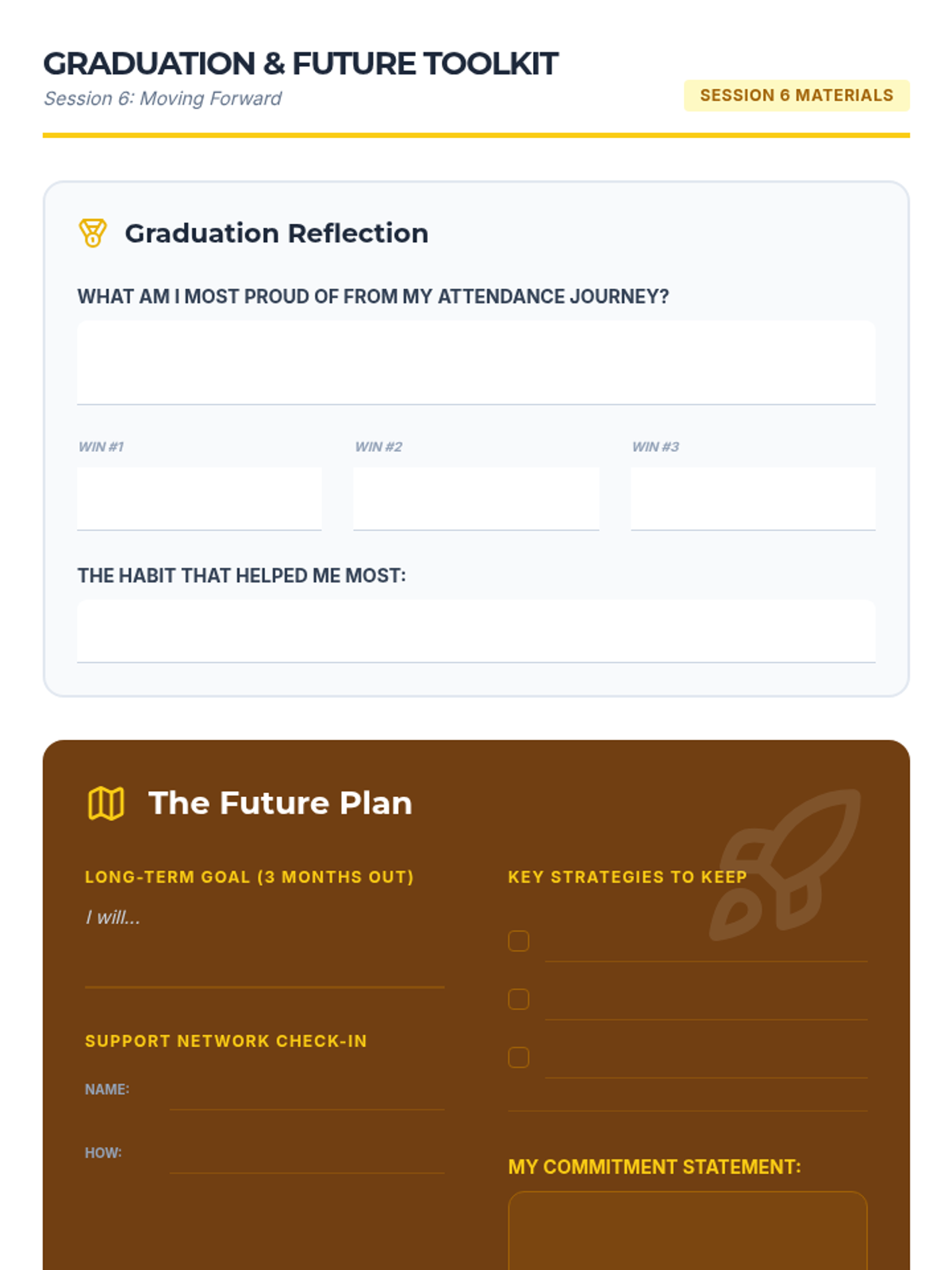 A 7-week group program for 6th graders designed to improve school attendance through goal-setting, barrier identification, peer support, and resilience building. Students develop personal action plans and routines to foster intrinsic motivation and commitment to attending school regularly.