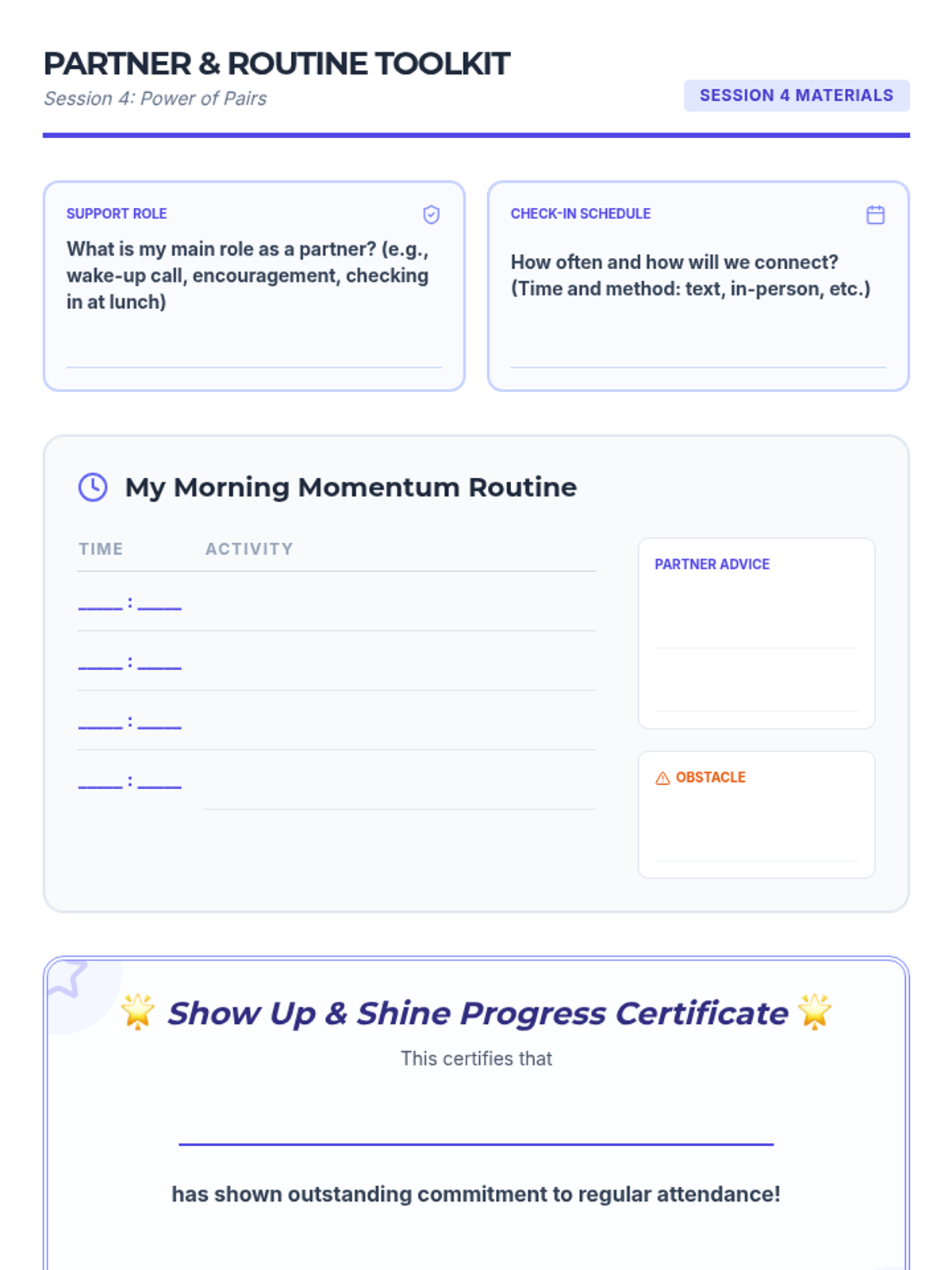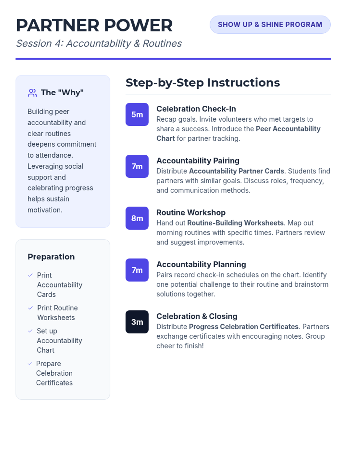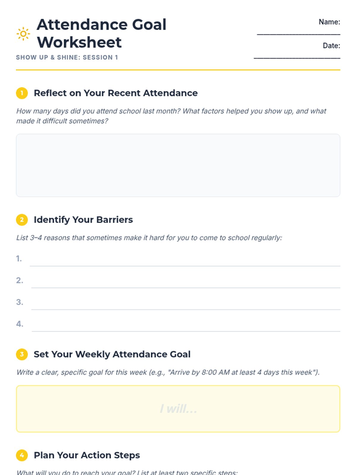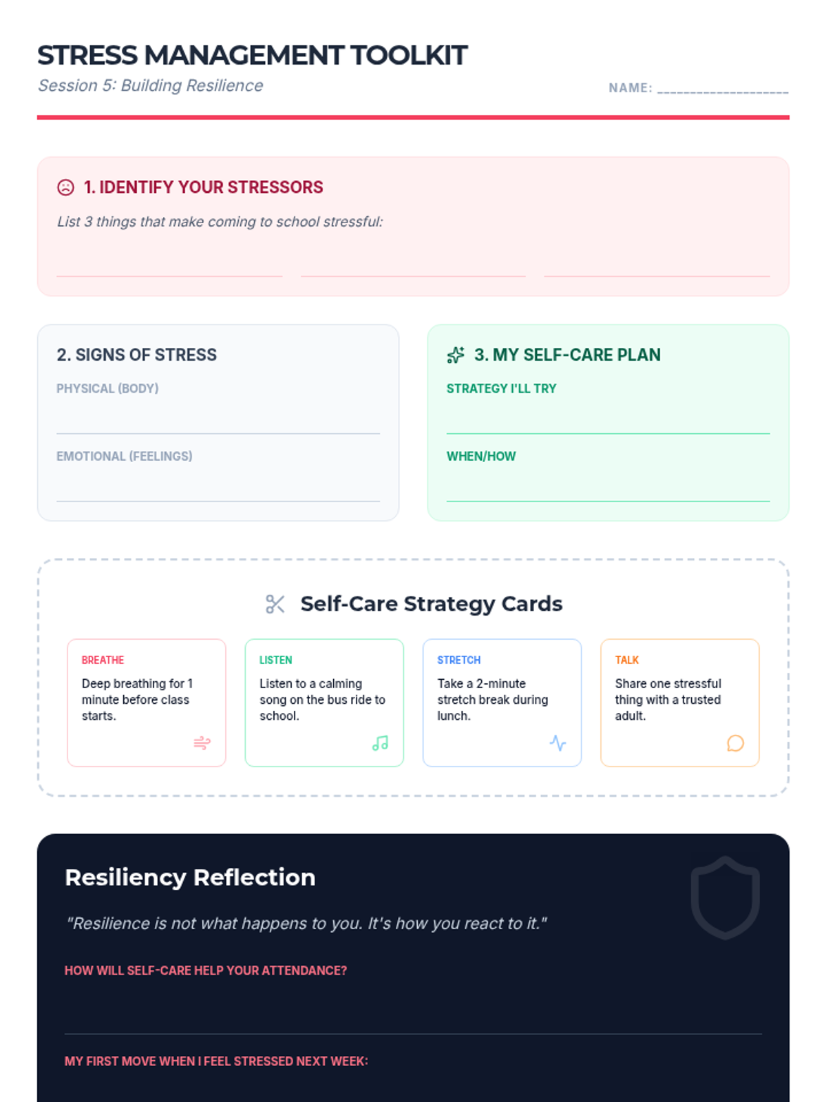 A 7-week group program for 6th graders designed to improve school attendance through goal-setting, barrier identification, peer support, and resilience building. Students develop personal action plans and routines to foster intrinsic motivation and commitment to attending school regularly.