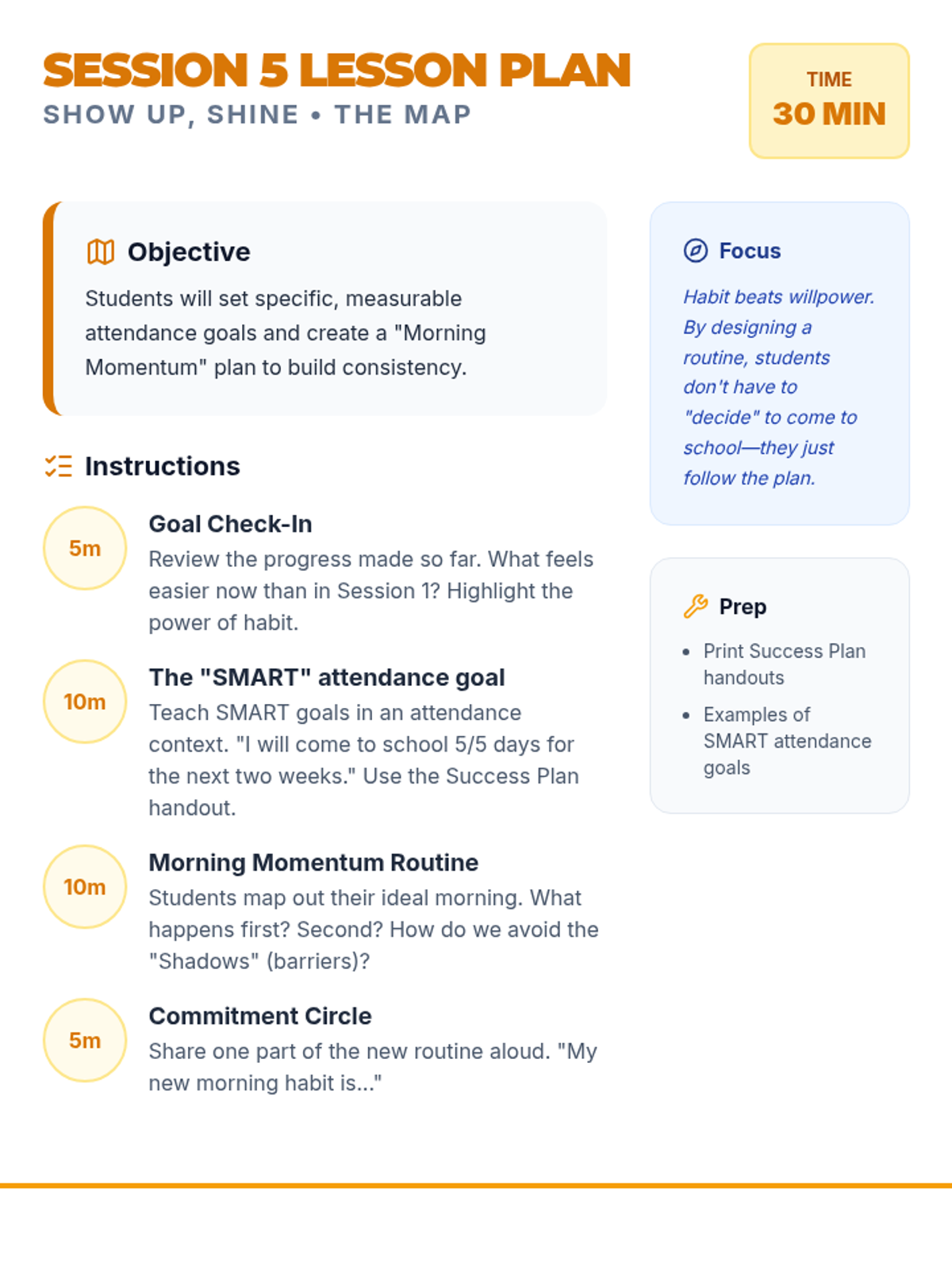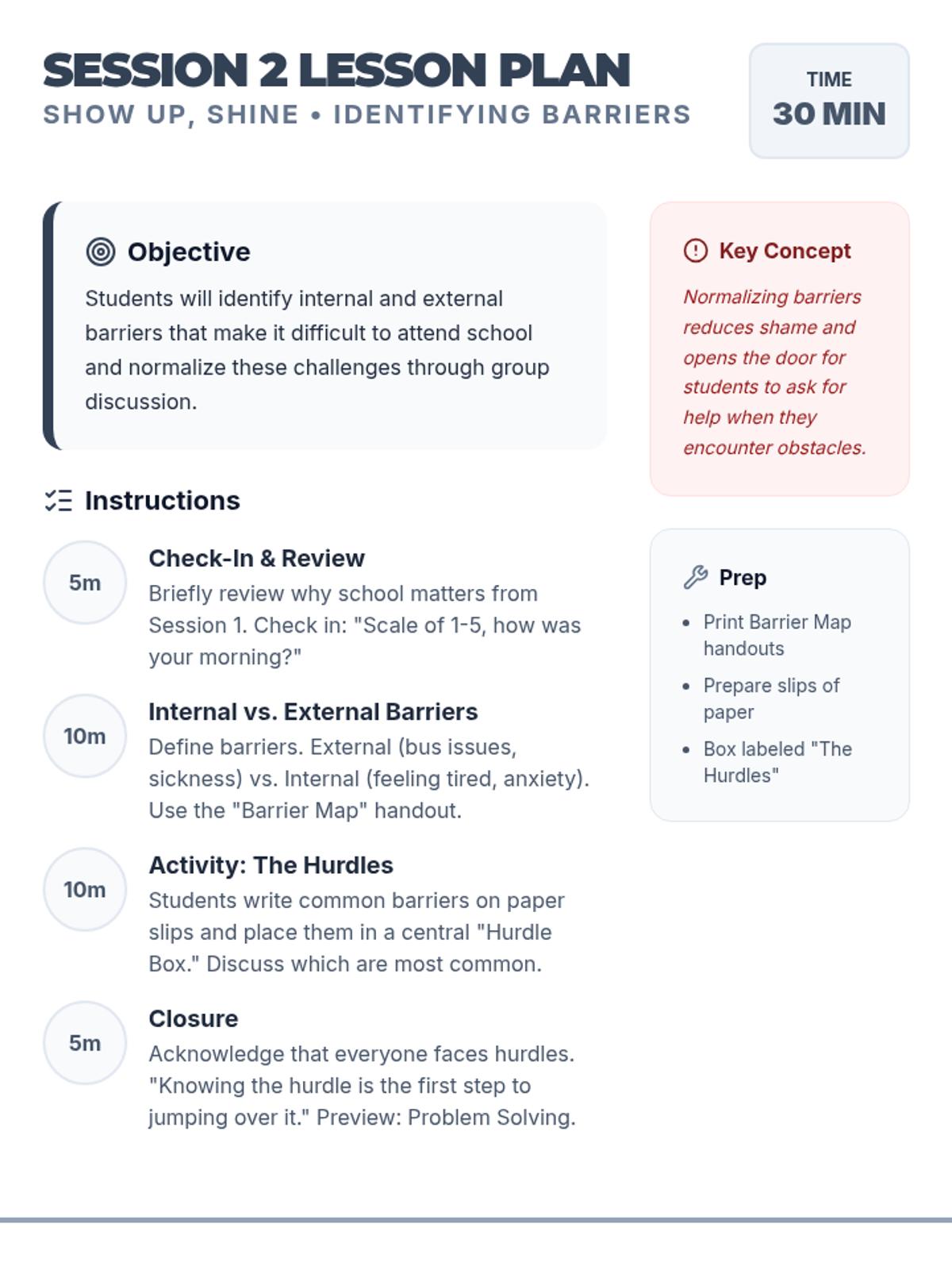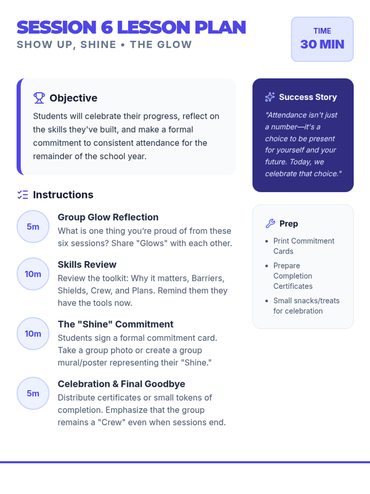 A six-session Tier 2 group intervention for 6th-grade students designed to improve school attendance by fostering motivation, identifying barriers, and building a sense of belonging.
