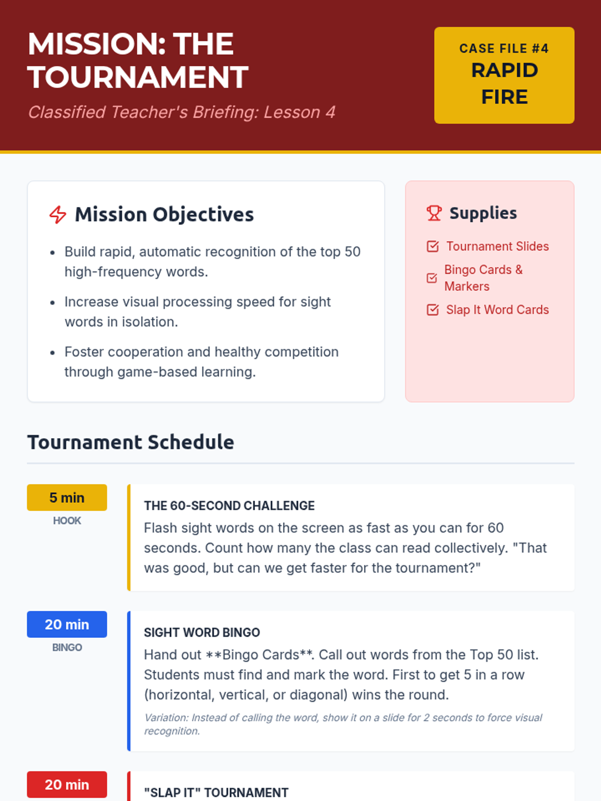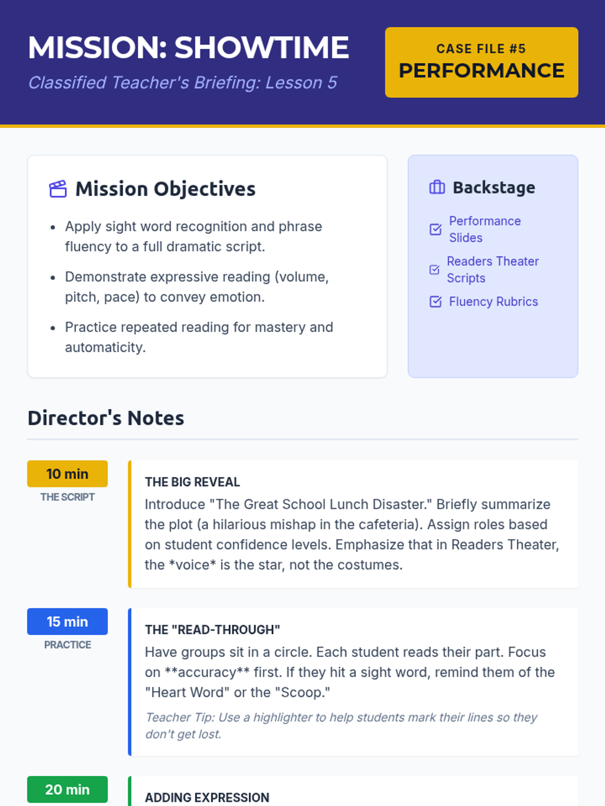 A 5-lesson sequence for 5th-grade beginner ELLs focused on mastering high-frequency sight words through visual memory, context, phrase fluency, games, and performance. Students transition from word recognition to expressive reading.
