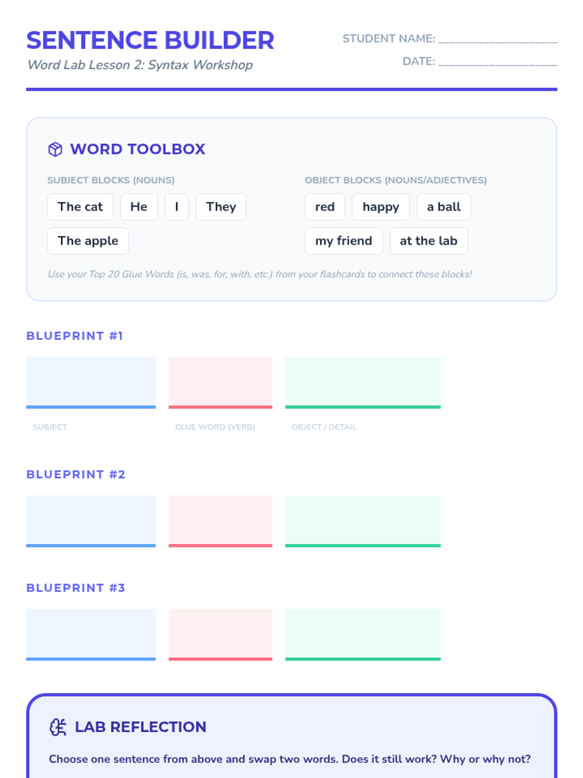 This sequence targets beginner EL students, focusing on the top 20 high-frequency 'glue' words. Students progress from rapid-fire recognition to physical sentence construction and creative story writing, building the foundation for reading fluency and syntactic understanding.