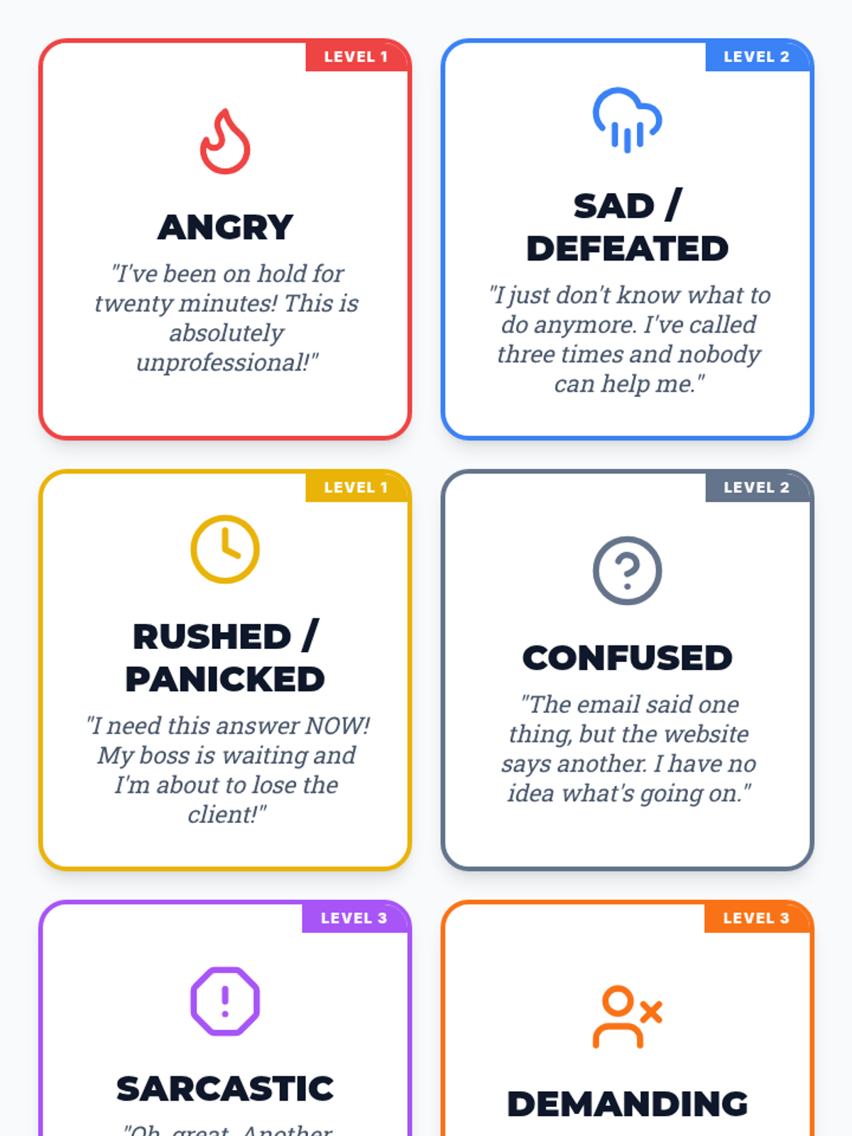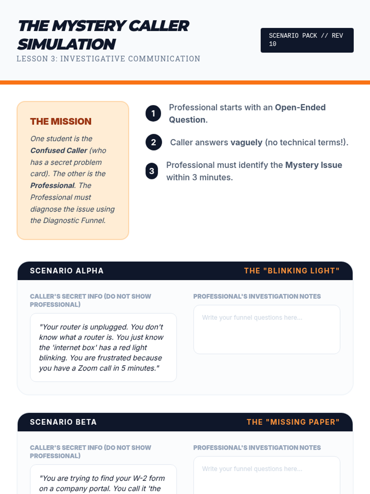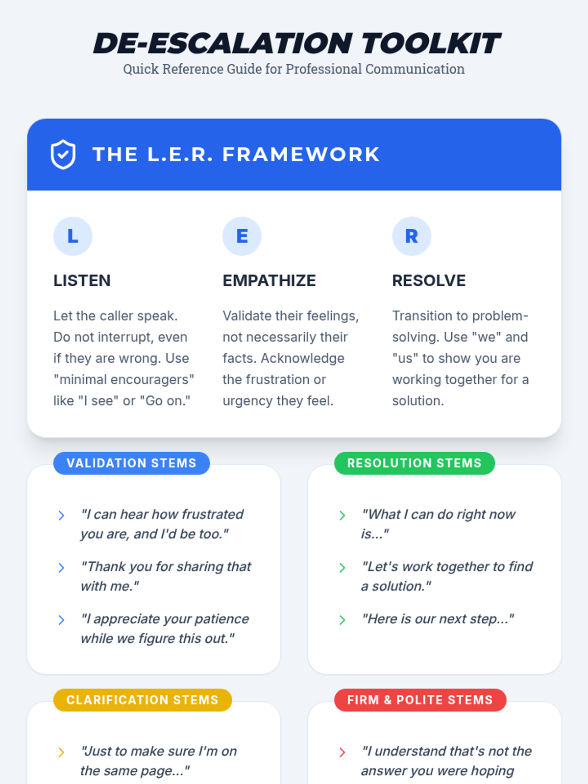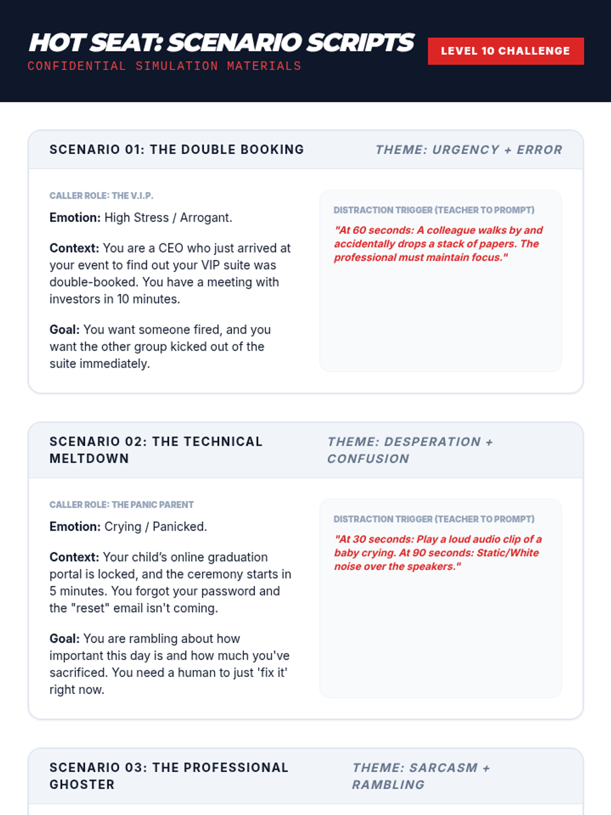 An advanced sequence focused on mastering professional phone communication through conflict resolution and de-escalation techniques for 10th-grade students. Students progress from identifying triggers to managing high-stakes simulations.