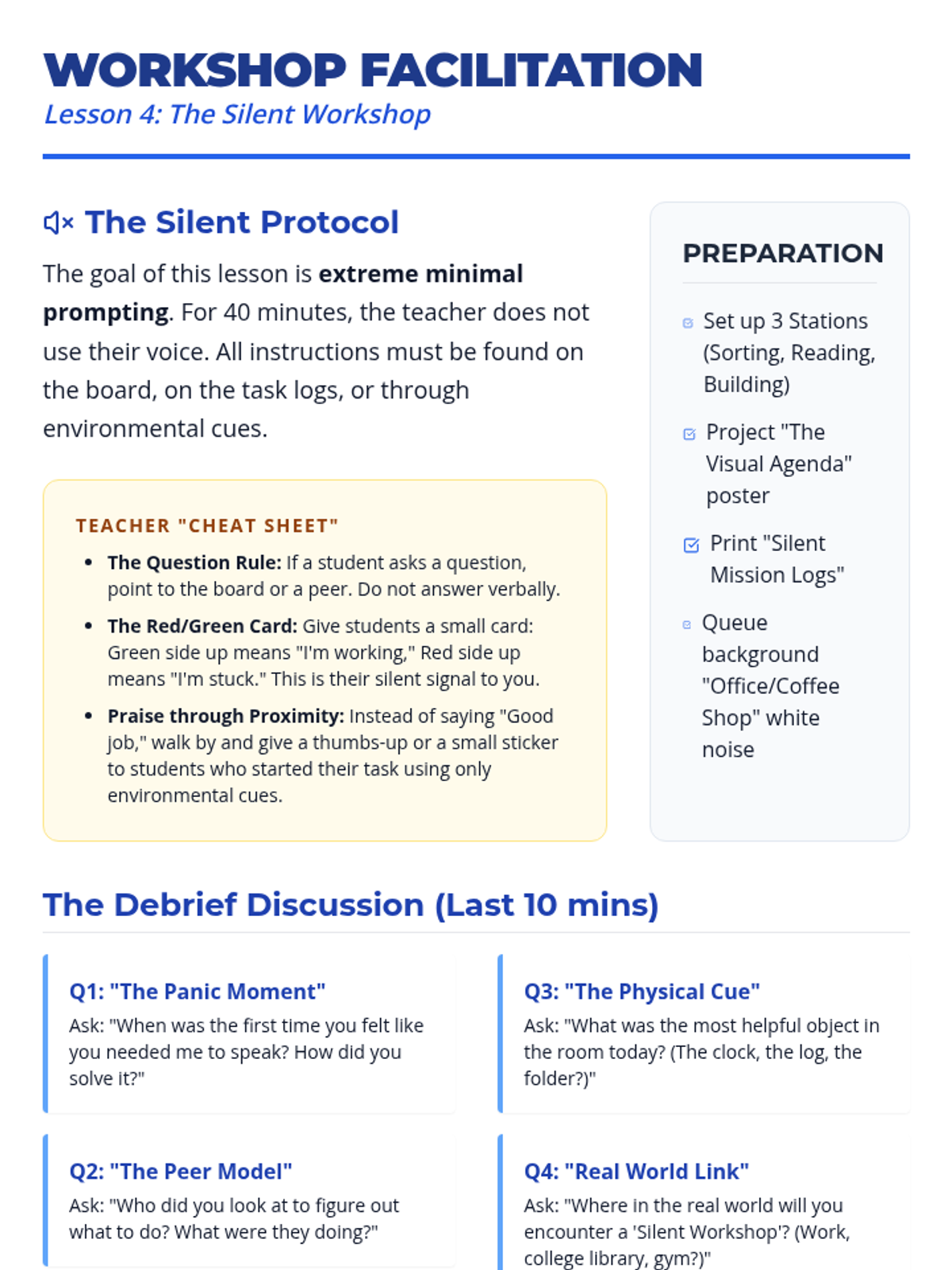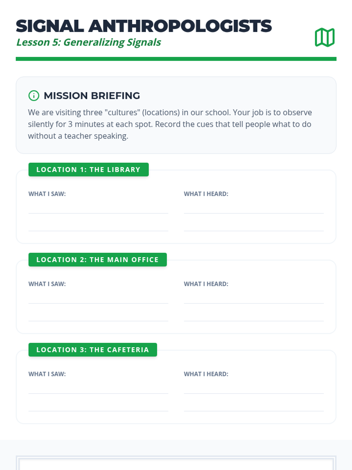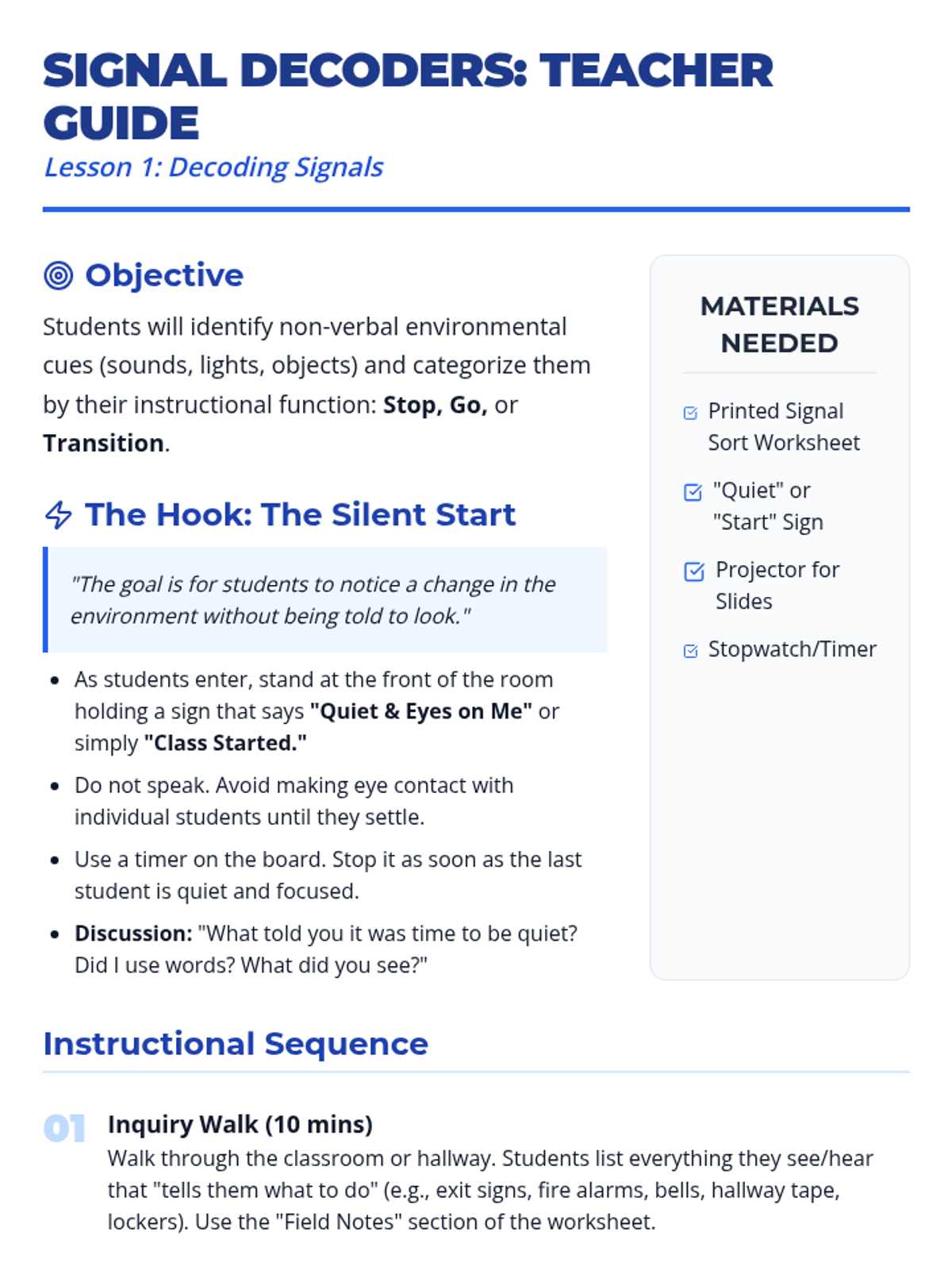 A sequence focused on helping 9th-grade students recognize and interpret environmental cues (physical objects, sounds, social behaviors) as signals to start tasks without direct verbal prompting. Students move from identifying basic signals to navigating a 'silent workshop' and mapping cues across school environments.