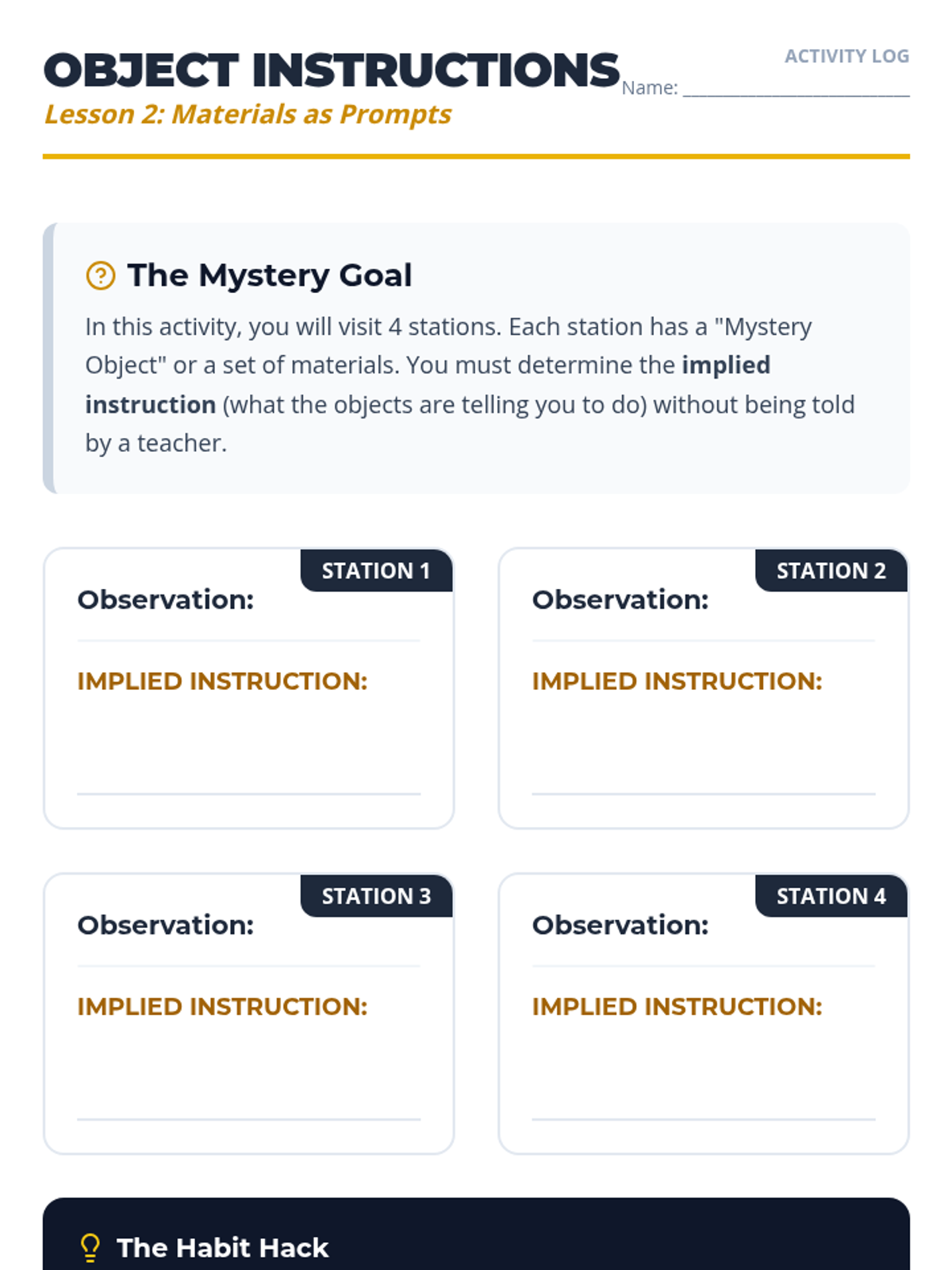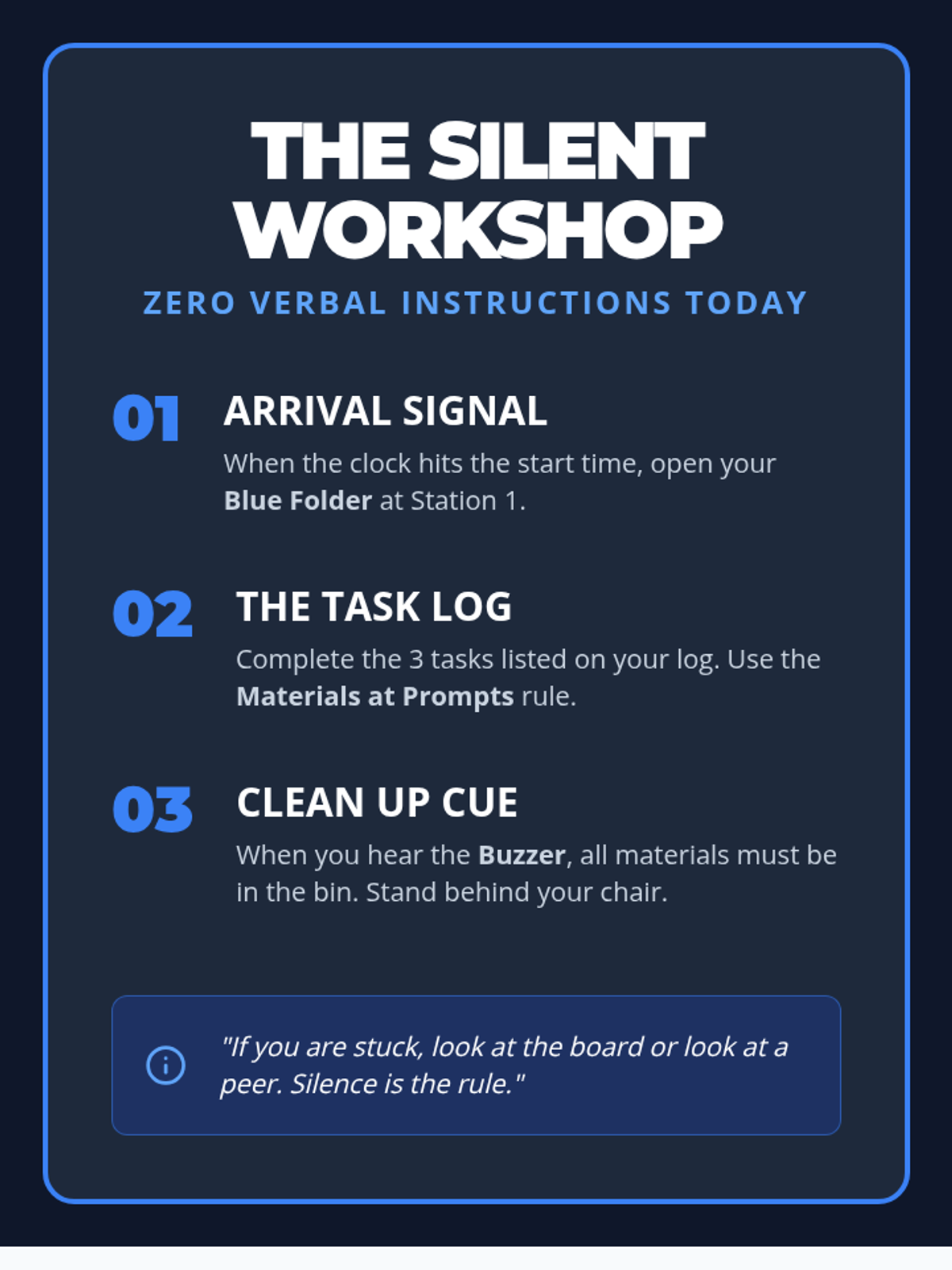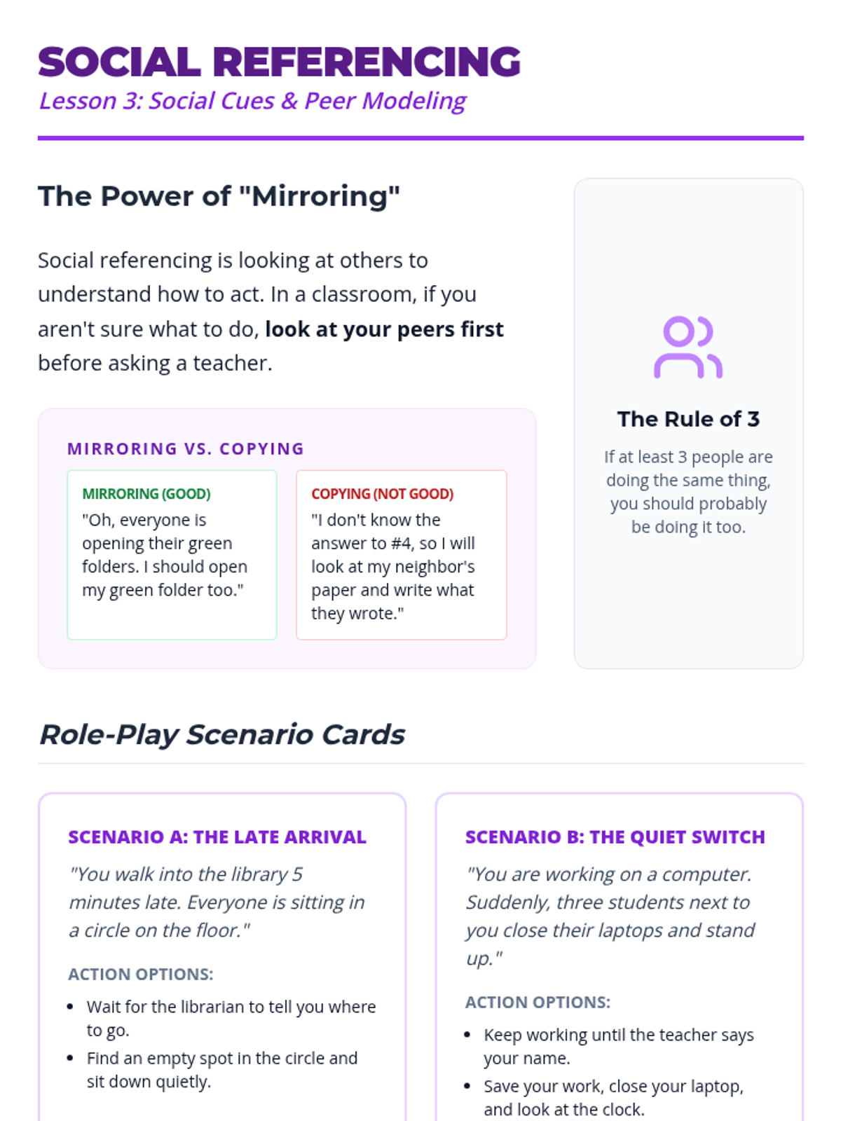A sequence focused on helping 9th-grade students recognize and interpret environmental cues (physical objects, sounds, social behaviors) as signals to start tasks without direct verbal prompting. Students move from identifying basic signals to navigating a 'silent workshop' and mapping cues across school environments.