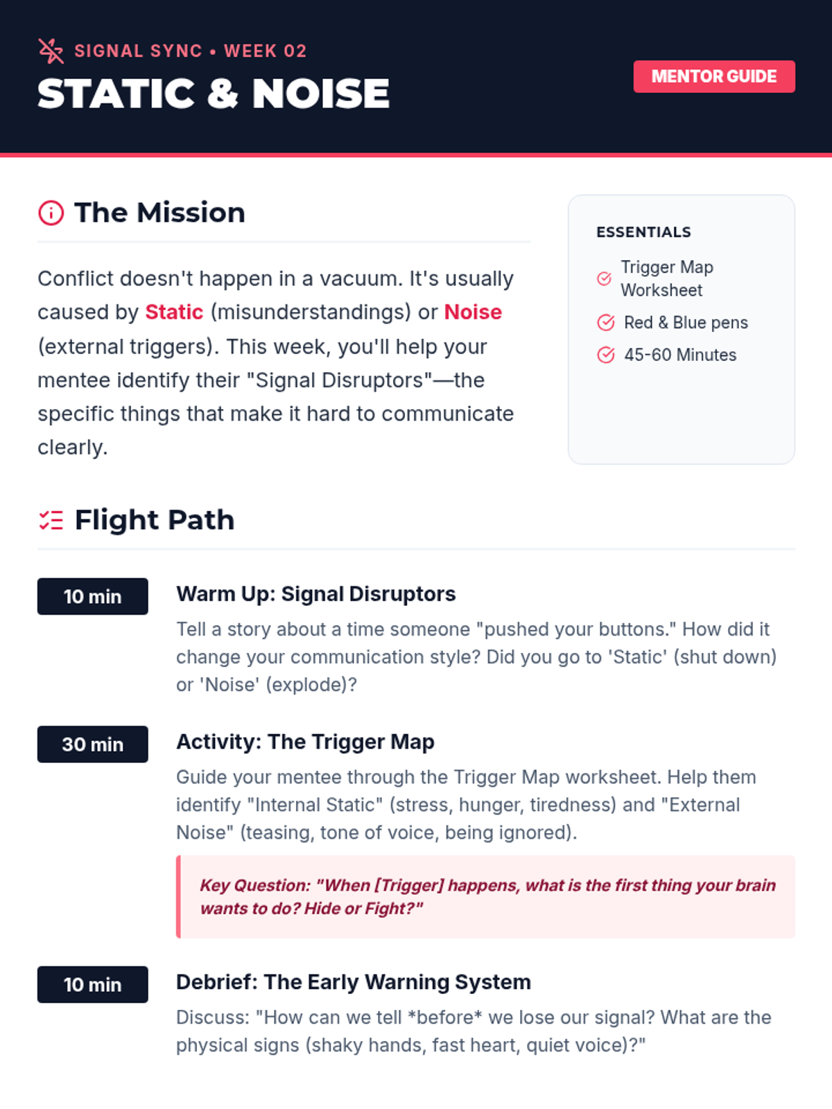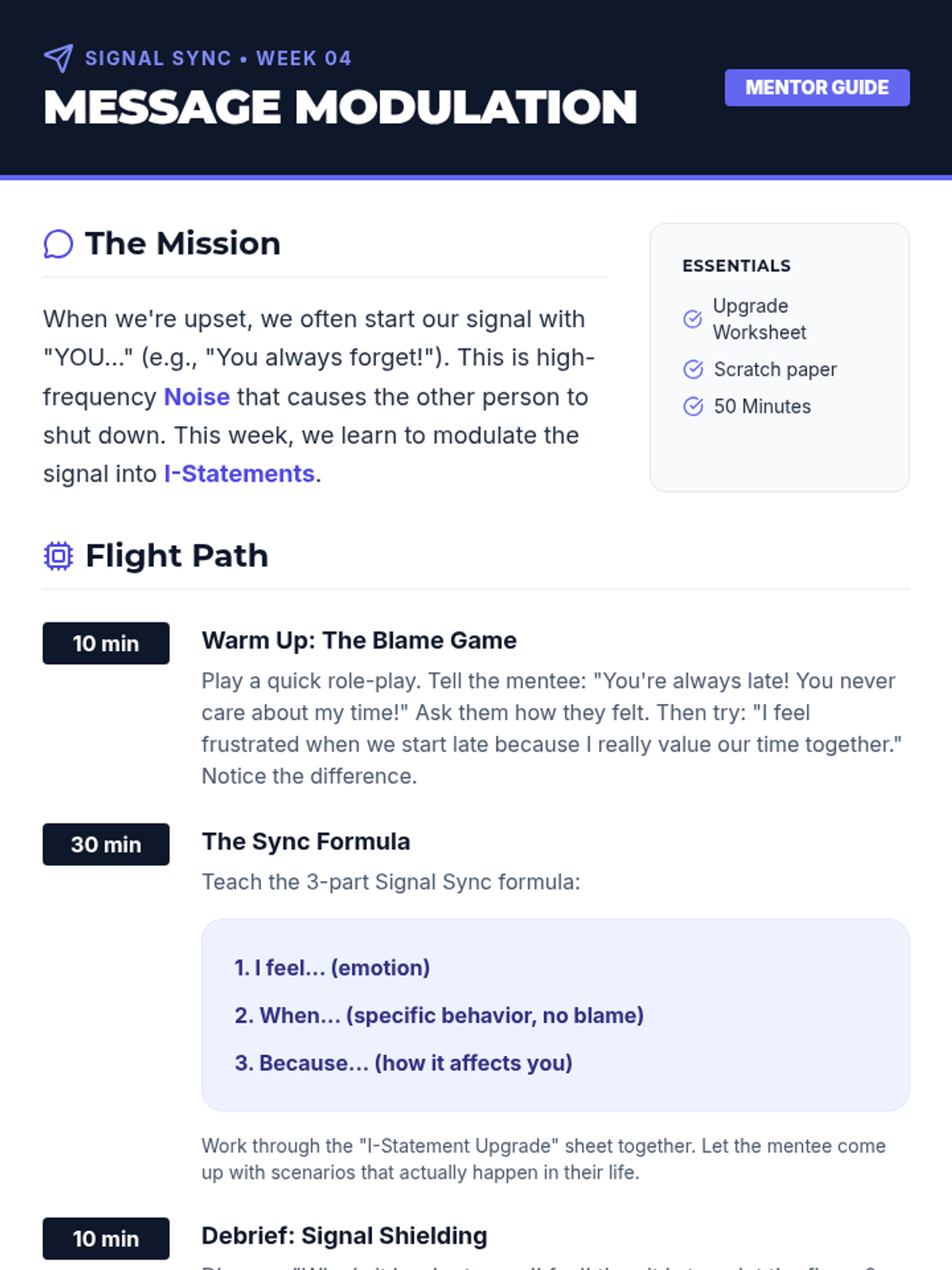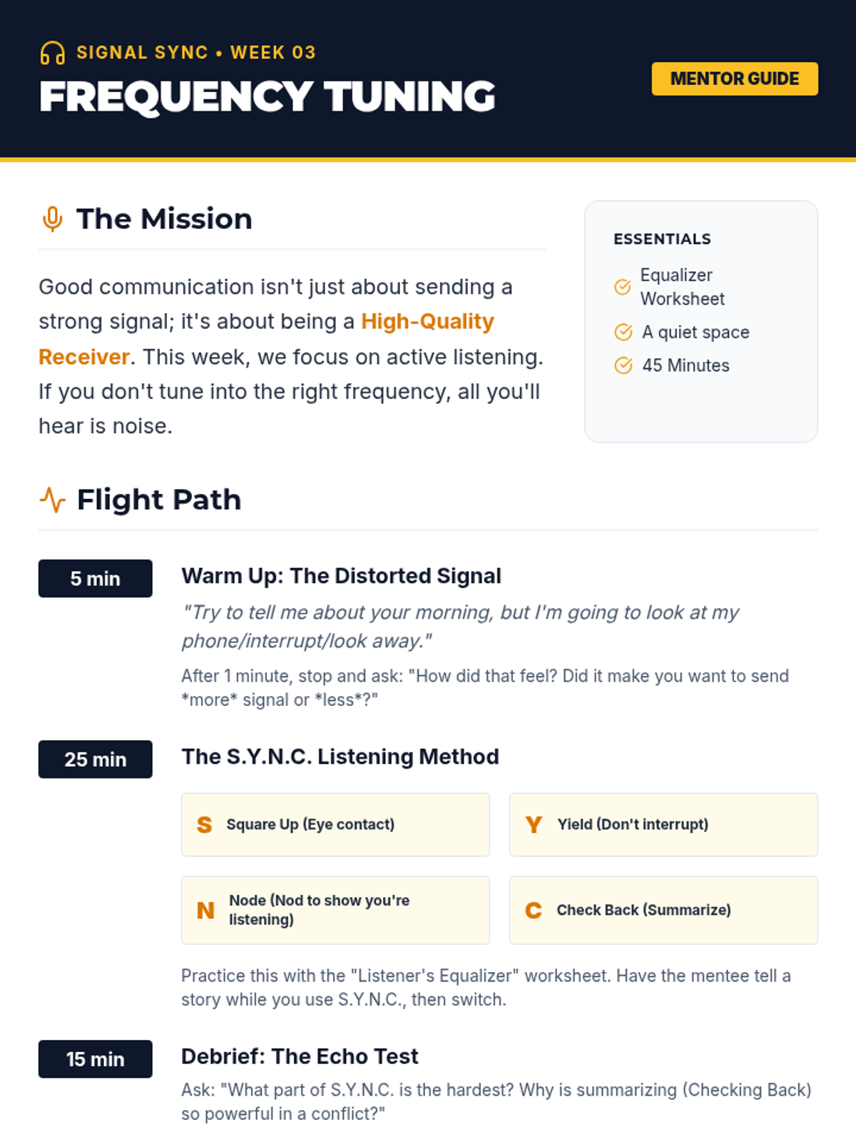 A 10-week comprehensive curriculum for mentors and mentees focusing on building effective communication habits and mastering conflict resolution through the 'Signal Sync' framework.