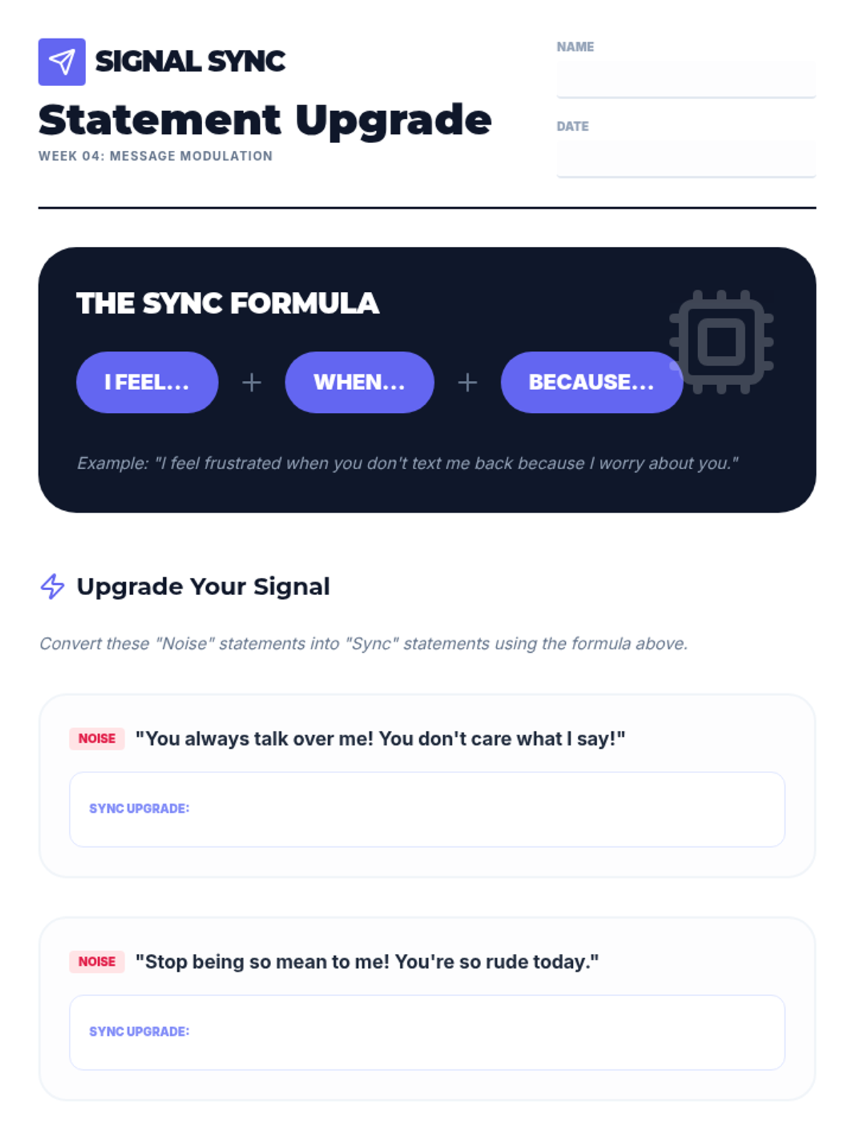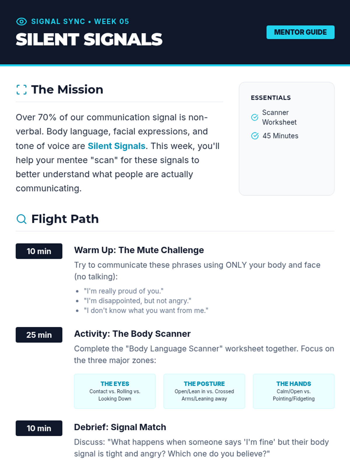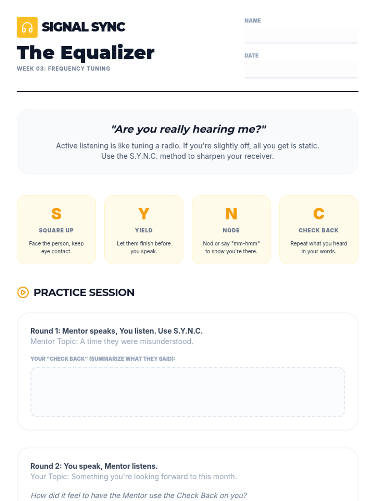 A 10-week comprehensive curriculum for mentors and mentees focusing on building effective communication habits and mastering conflict resolution through the 'Signal Sync' framework.
