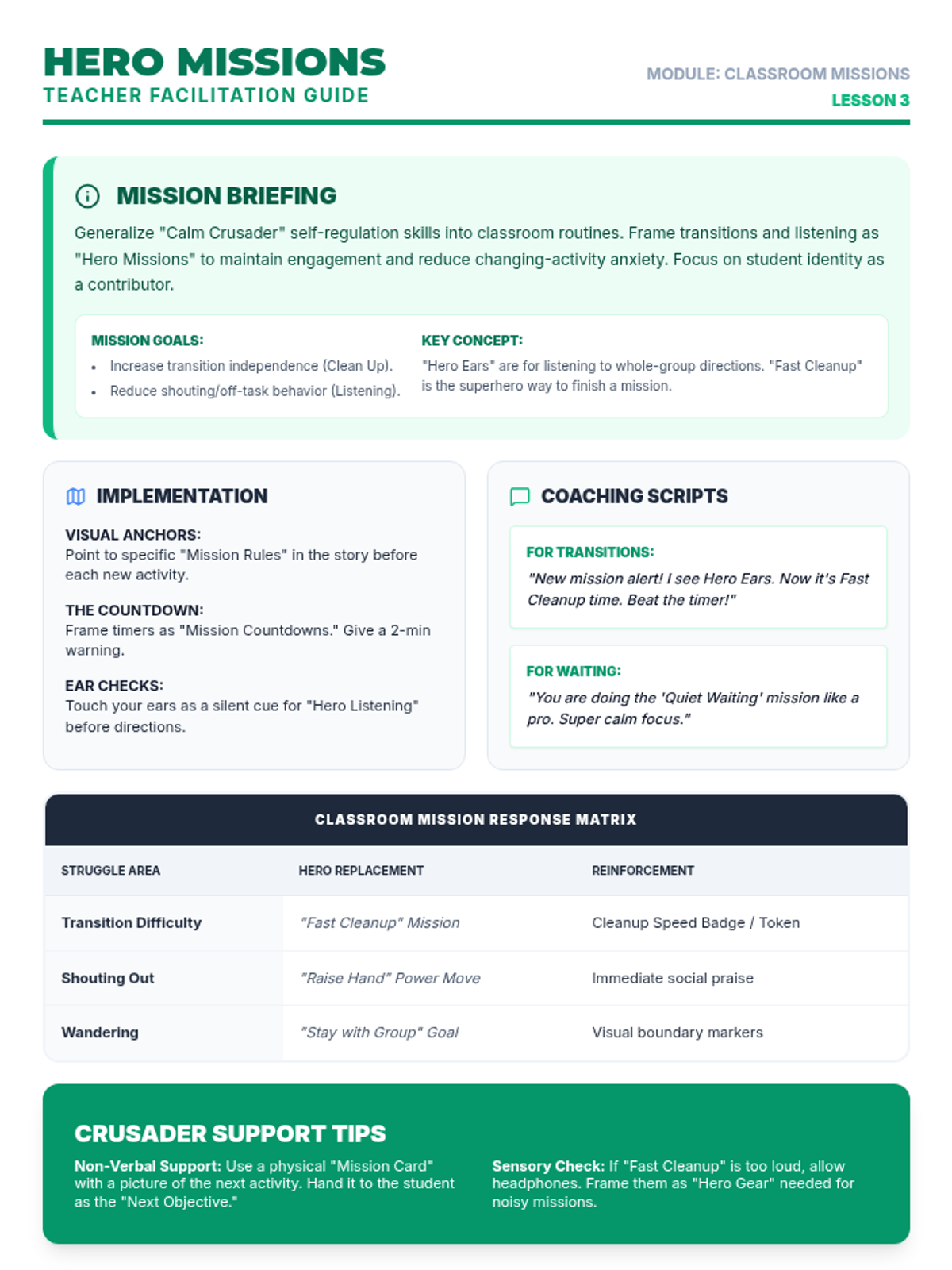 A comprehensive behavioral and social skills curriculum for a kindergarten student with autism, using a 'Calm Crusader' superhero theme to teach self-regulation, safety, and prosocial friendship behaviors while integrating handwriting practice.