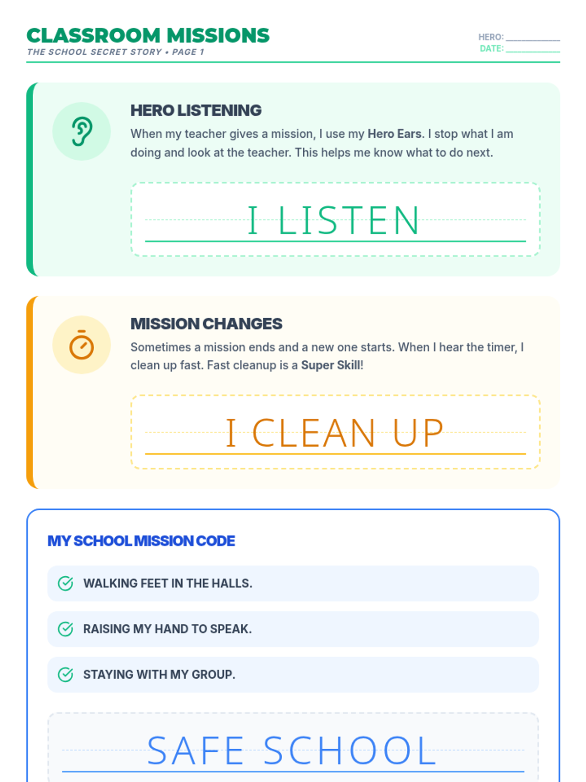 A series of three 10-minute 1-to-1 social skills sessions designed to help a student navigate classroom communication, specifically focusing on story-timing, being called on, and asking questions during work time.