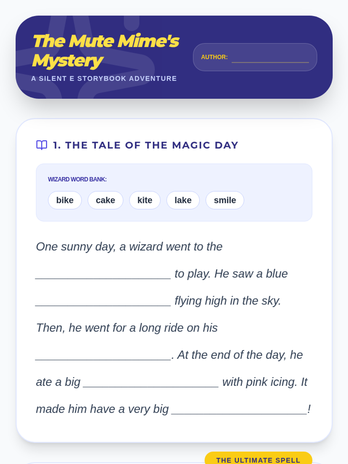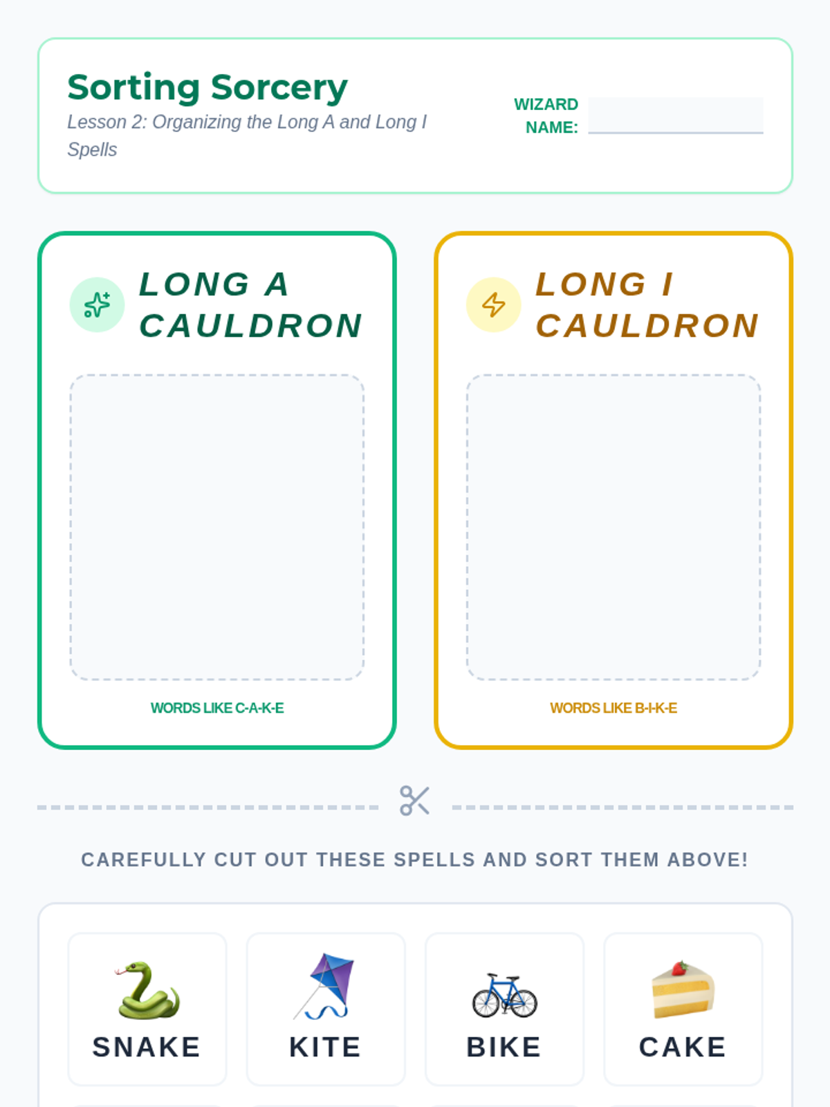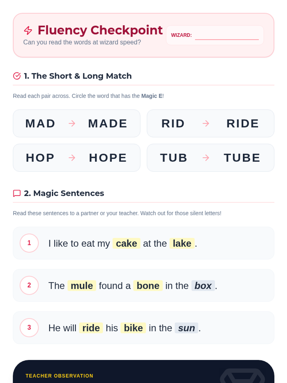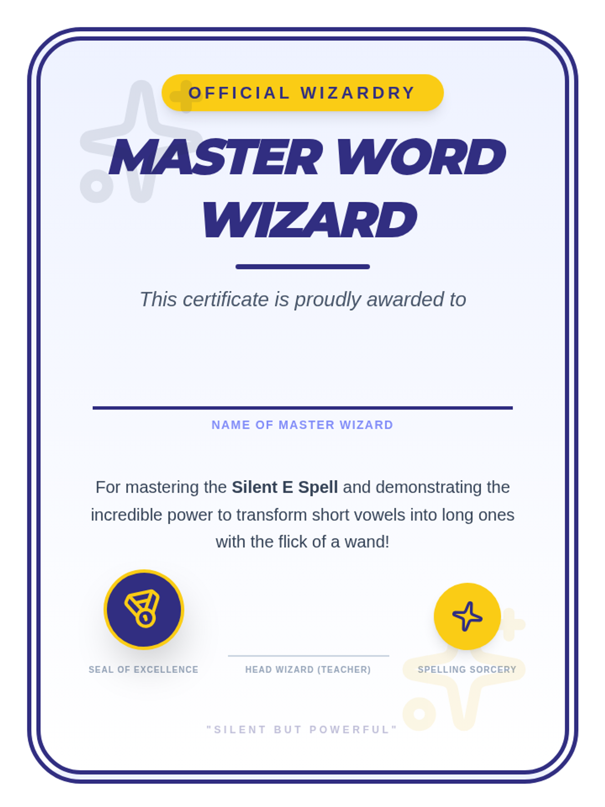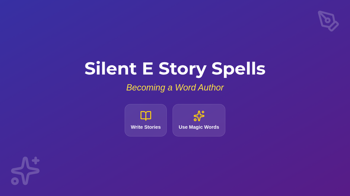Students explore the 'Silent E' (CVCe) rule through a 'Word Wizard' theme, transforming short vowel words into long vowel words. The sequence covers concept introduction, specific vowel patterns (a, i, o, u), fluency practice, and creative writing application.