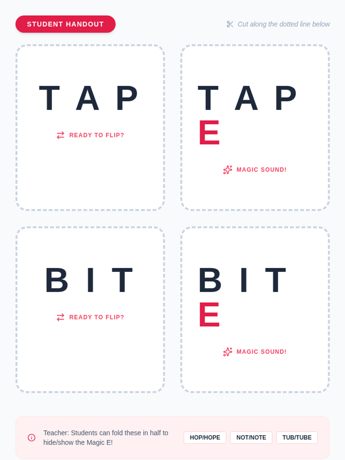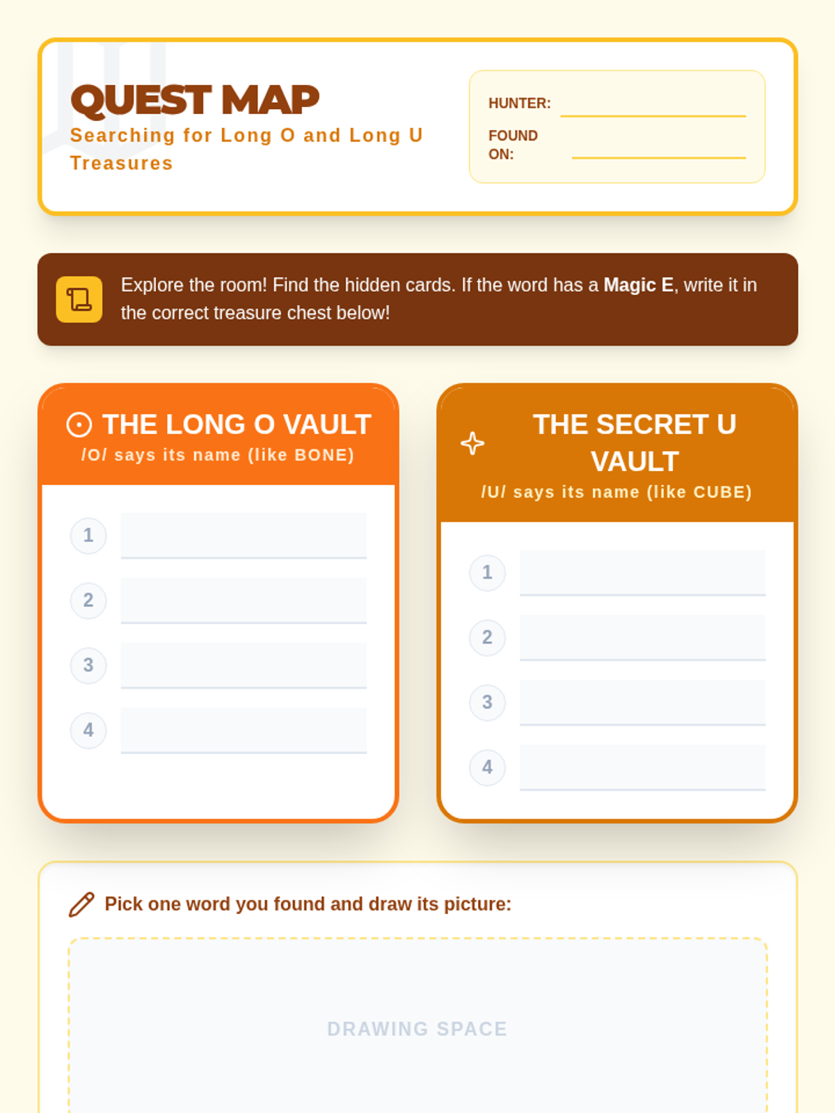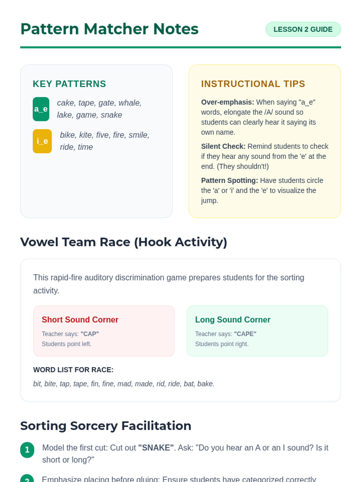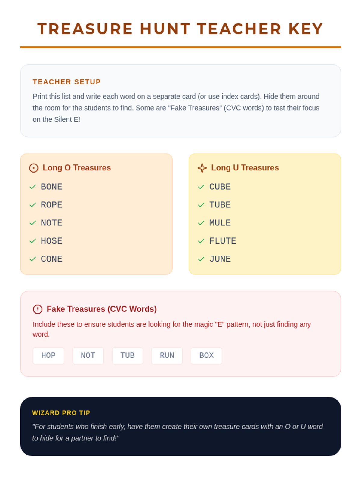 Students explore the 'Silent E' (CVCe) rule through a 'Word Wizard' theme, transforming short vowel words into long vowel words. The sequence covers concept introduction, specific vowel patterns (a, i, o, u), fluency practice, and creative writing application.