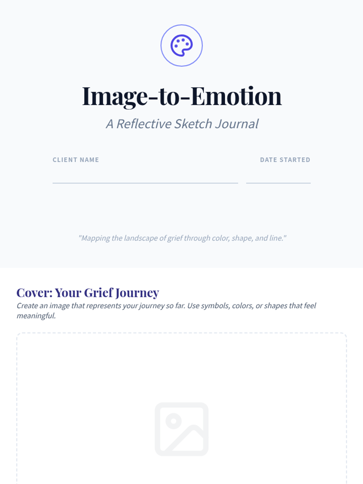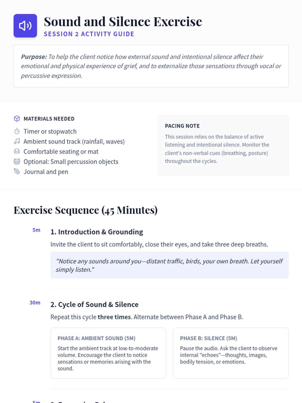 A therapeutic three-part module designed for individual grief processing through visual metaphors, sound/silence exercises, and reflective sketching. This program helps clients externalize and articulate complex emotions associated with loss.