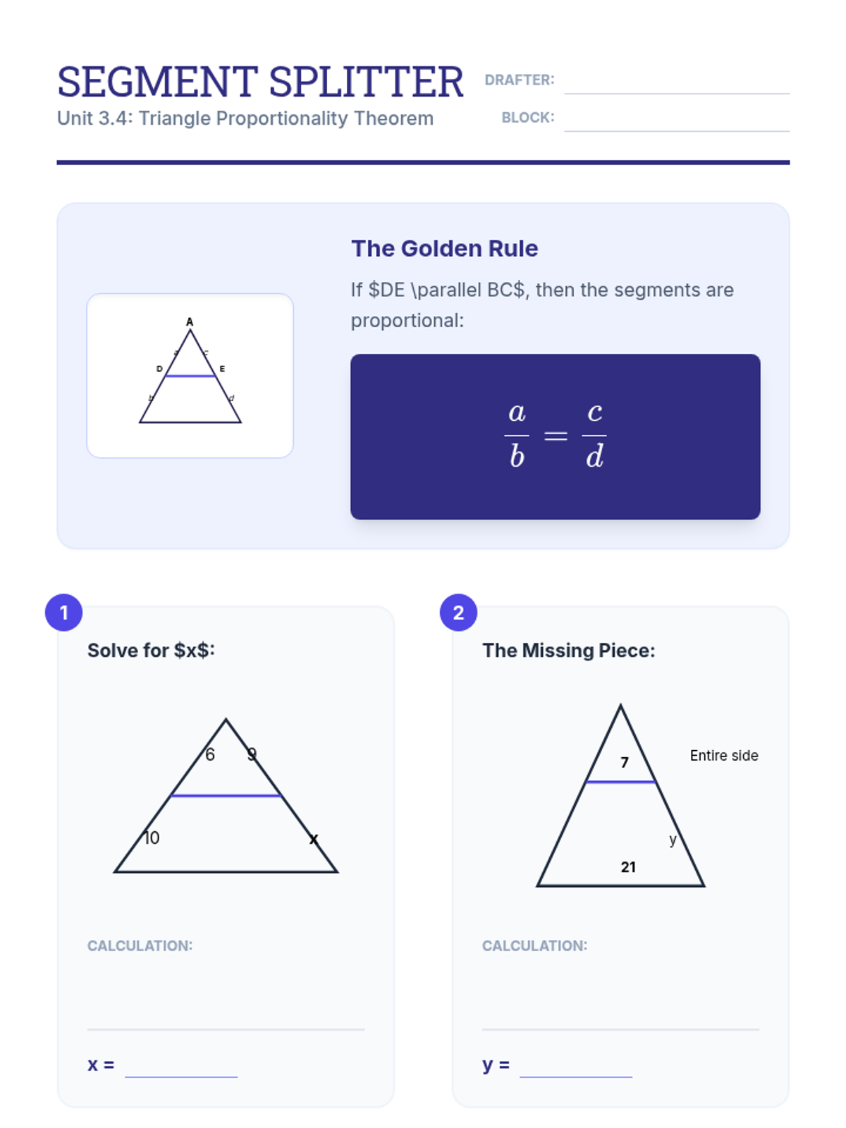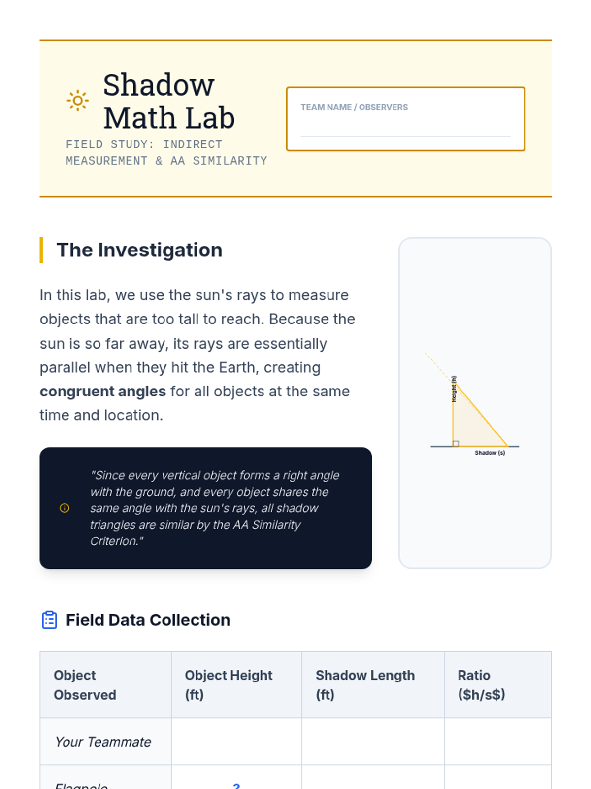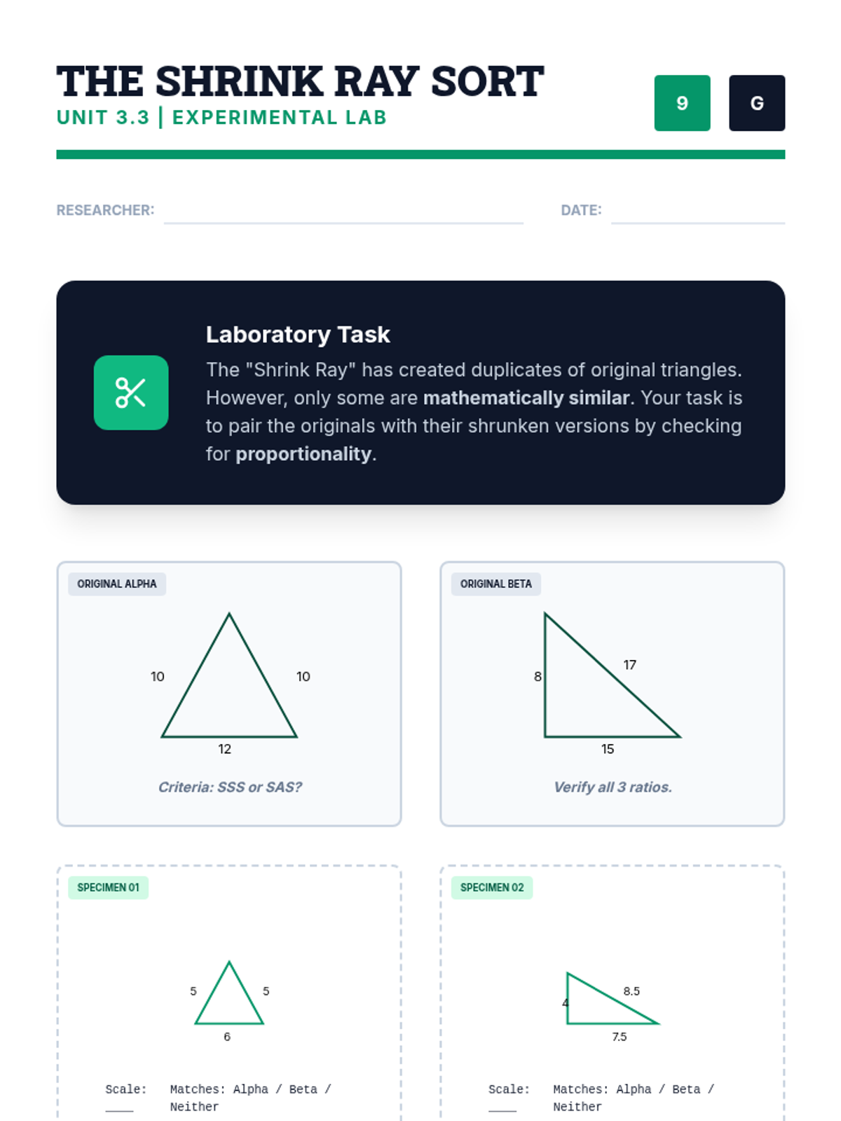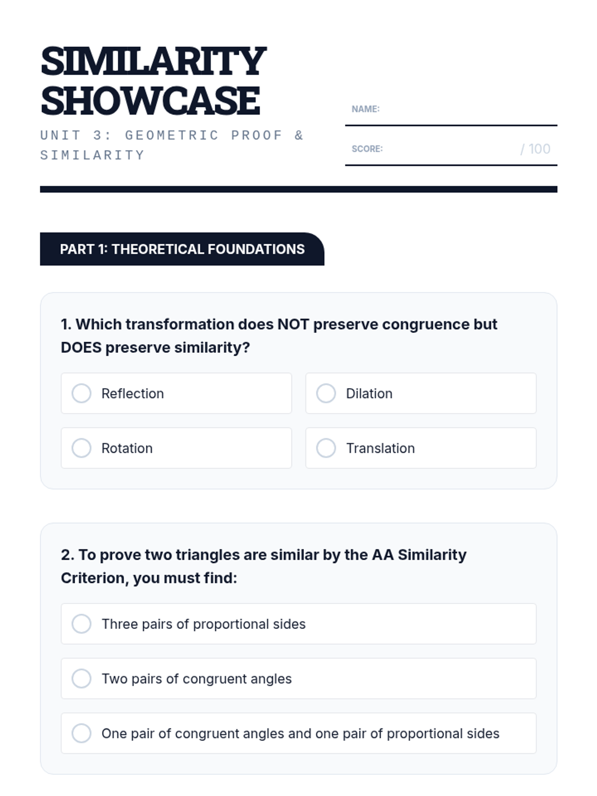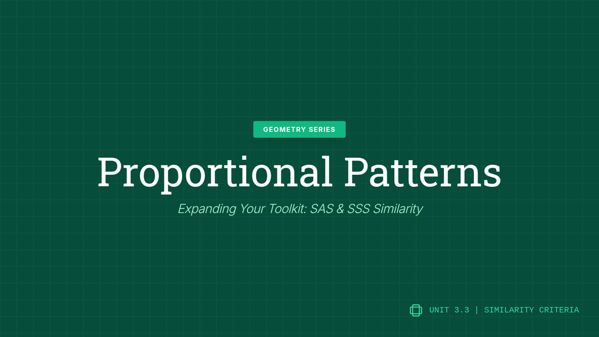 A comprehensive geometry unit exploring similarity, dilations, and proportionality theorems. Students progress from intuitive transformations to formal proofs and real-world applications of geometric ratios.