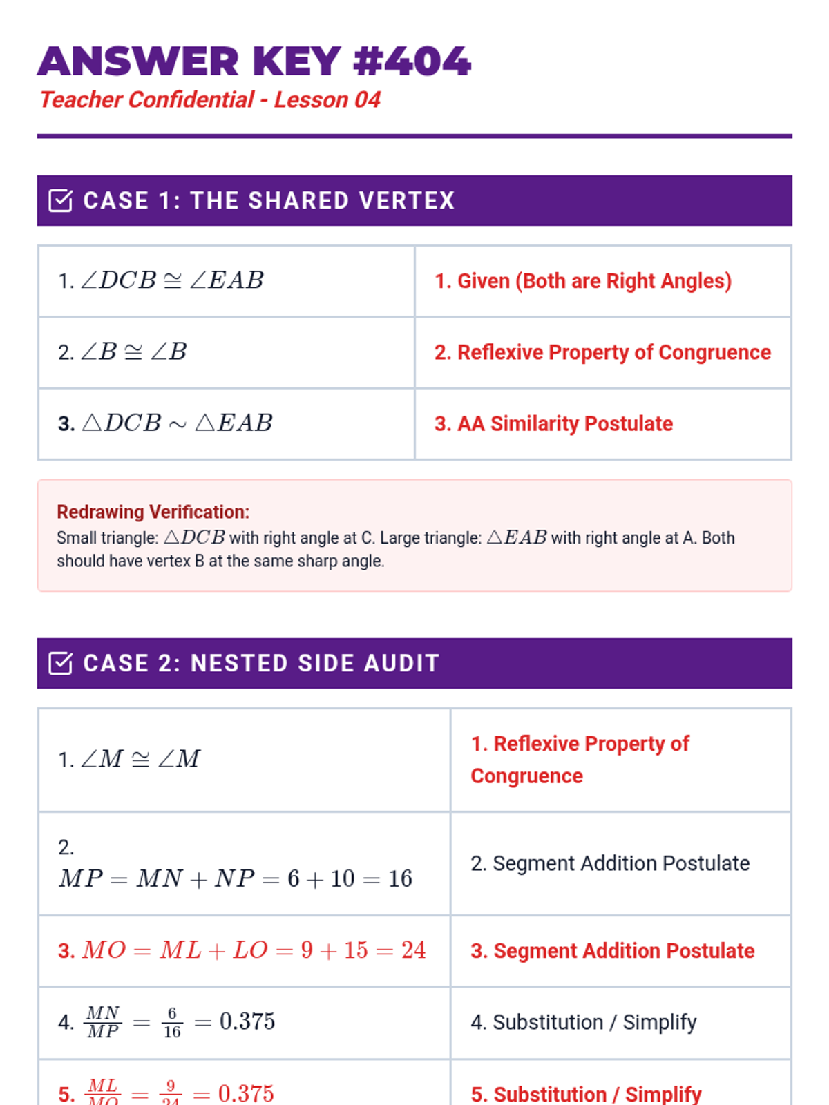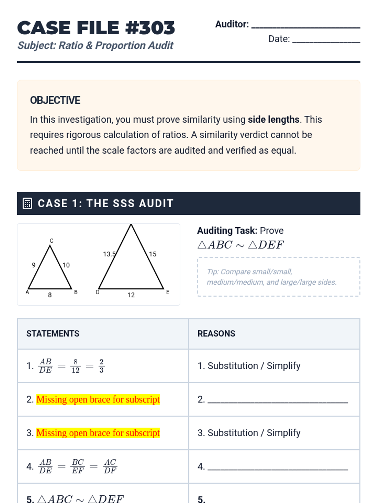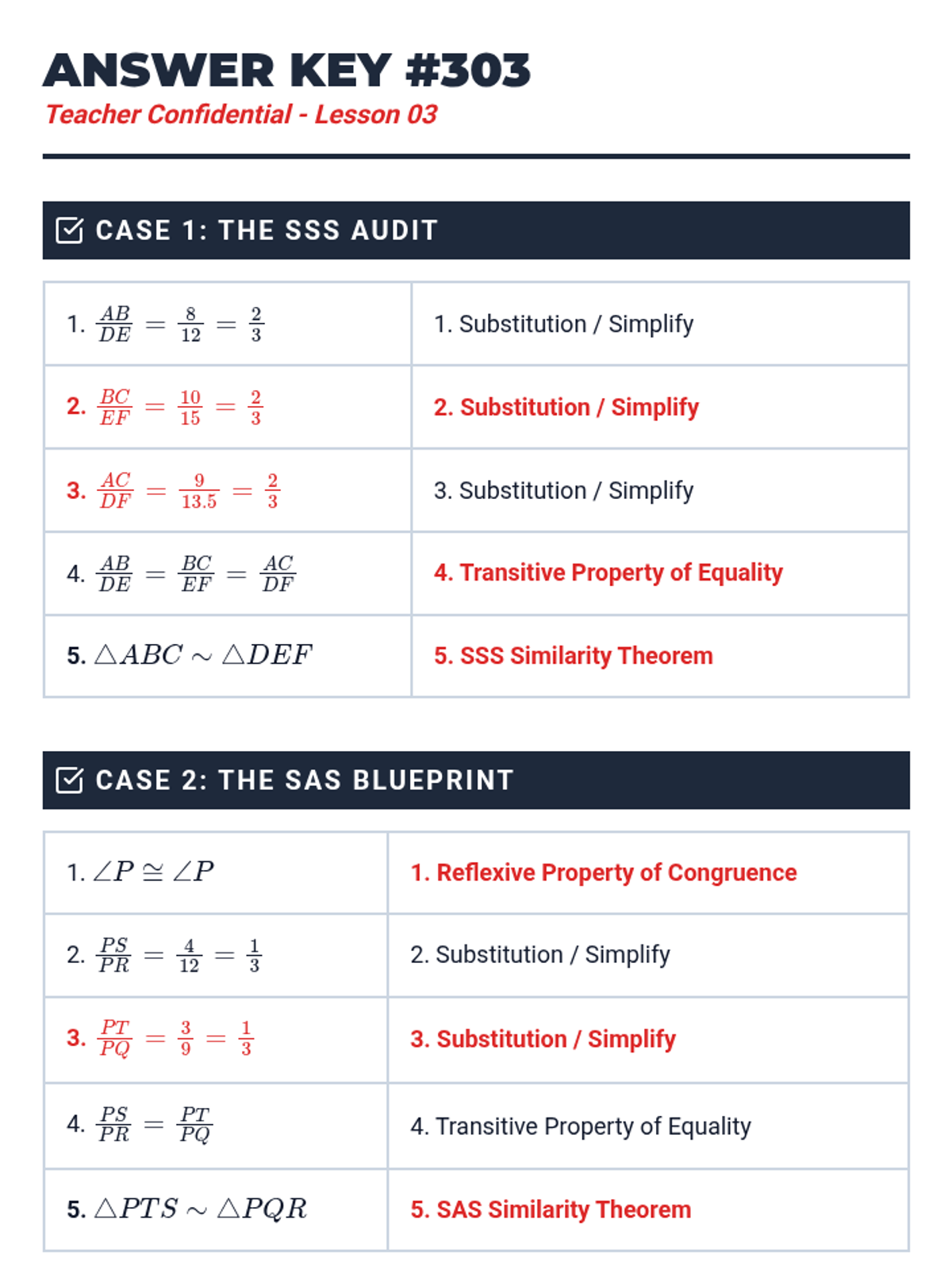 This skill-building sequence focuses on the rigorous development of formal geometric proofs using similarity. Students progress from filling in missing steps in flowcharts to writing complete two-column proofs from scratch, emphasizing logical progression and justification.