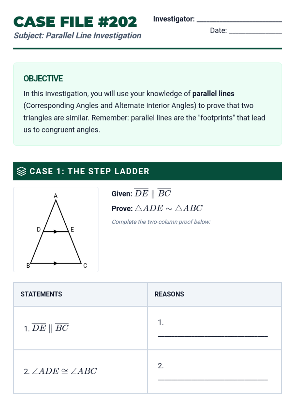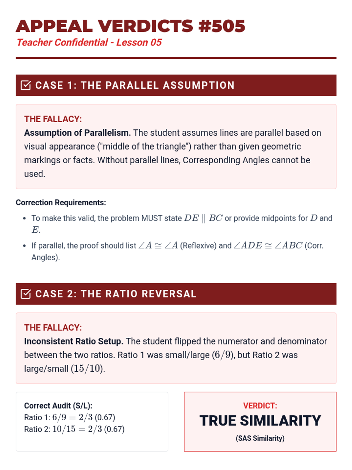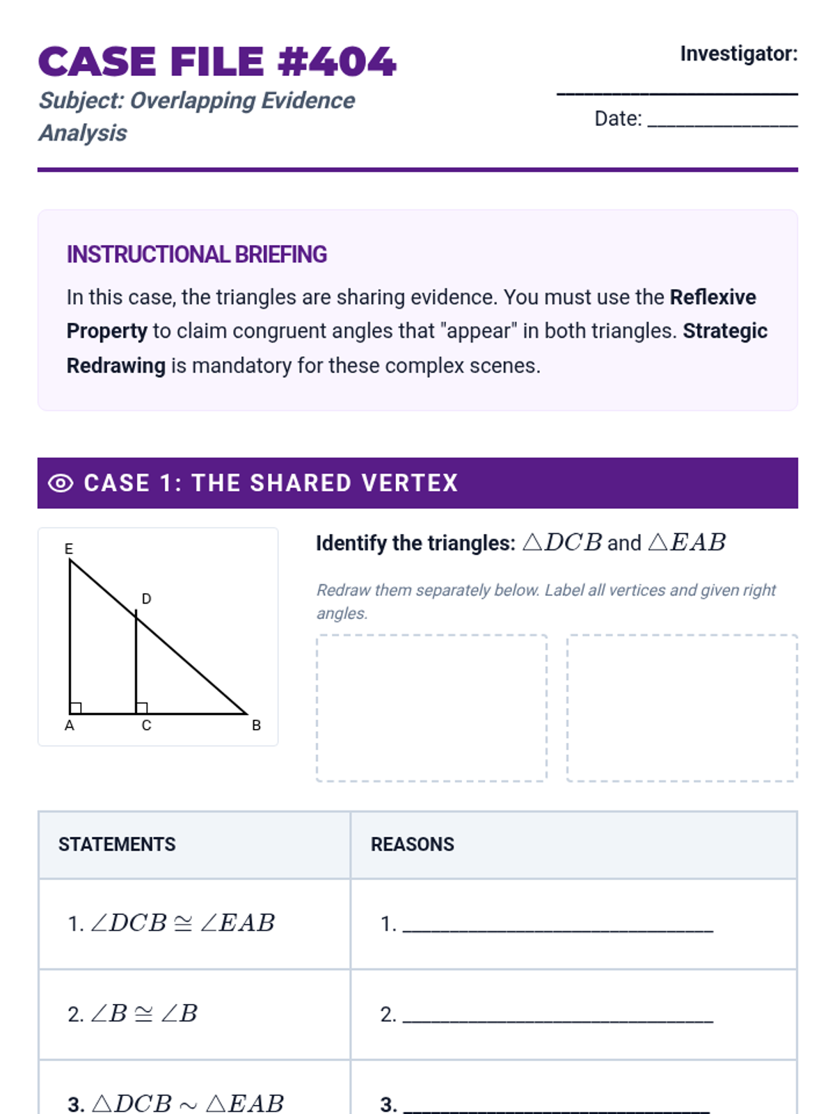 This skill-building sequence focuses on the rigorous development of formal geometric proofs using similarity. Students progress from filling in missing steps in flowcharts to writing complete two-column proofs from scratch, emphasizing logical progression and justification.