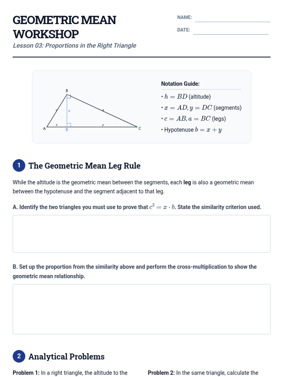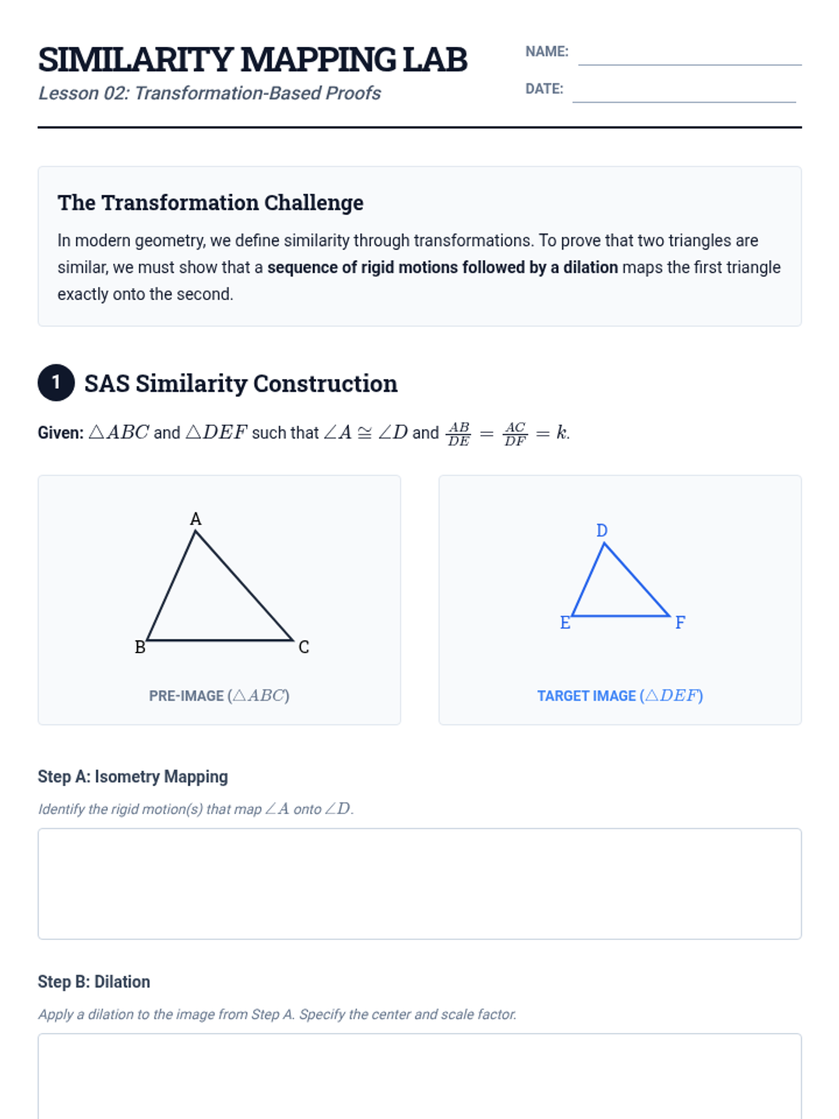 A rigorous undergraduate exploration of similarity theory, proportionality, and their applications in proving the Pythagorean Theorem and circle properties. Students move from dynamic exploration to formal proofs.