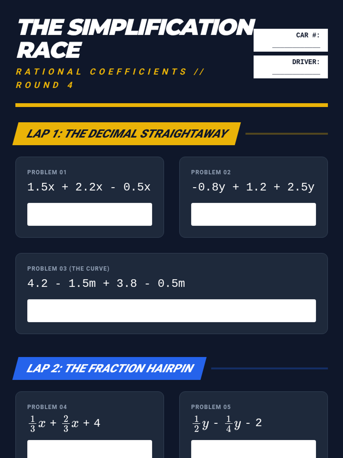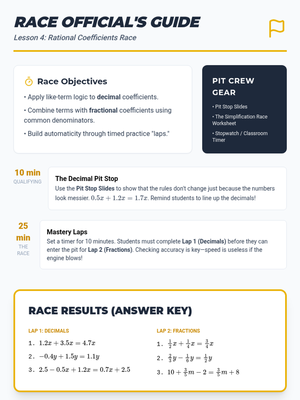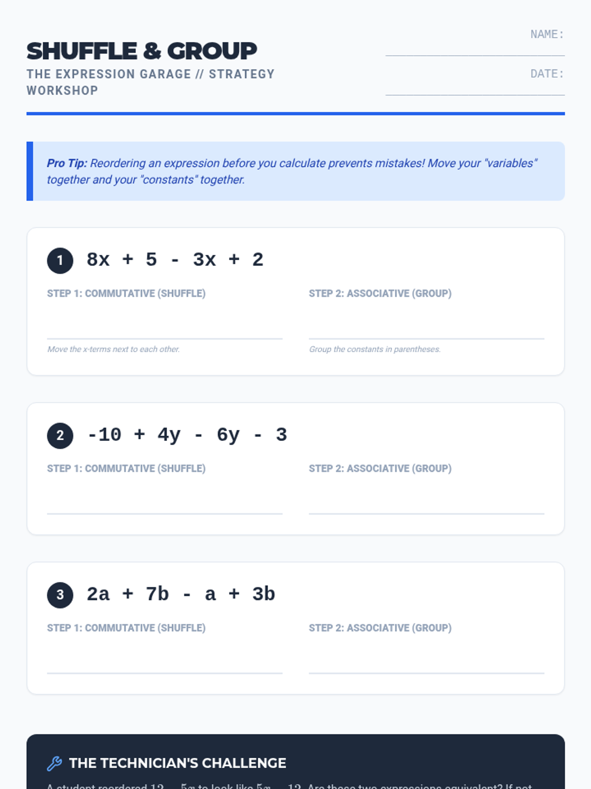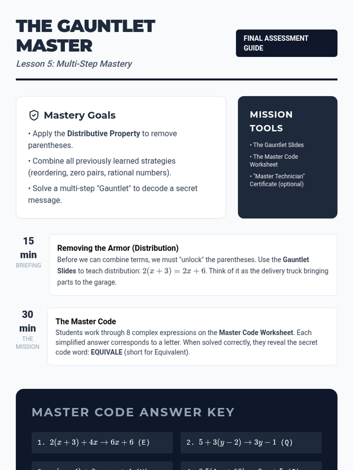 This 5-lesson sequence for 7th-grade students focuses on identifying, reordering, and combining like terms within algebraic expressions. Using a 'Math Garage' theme, students move from basic identification of terms to mastering complex simplification with rational numbers and parentheses through gamified and hands-on activities.