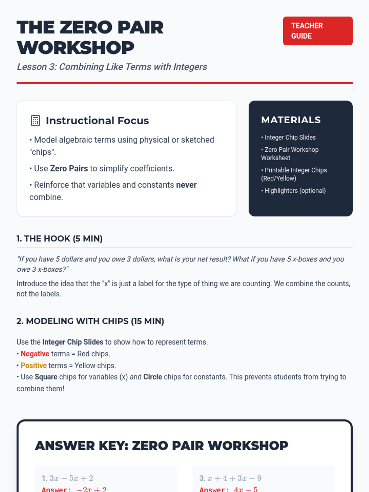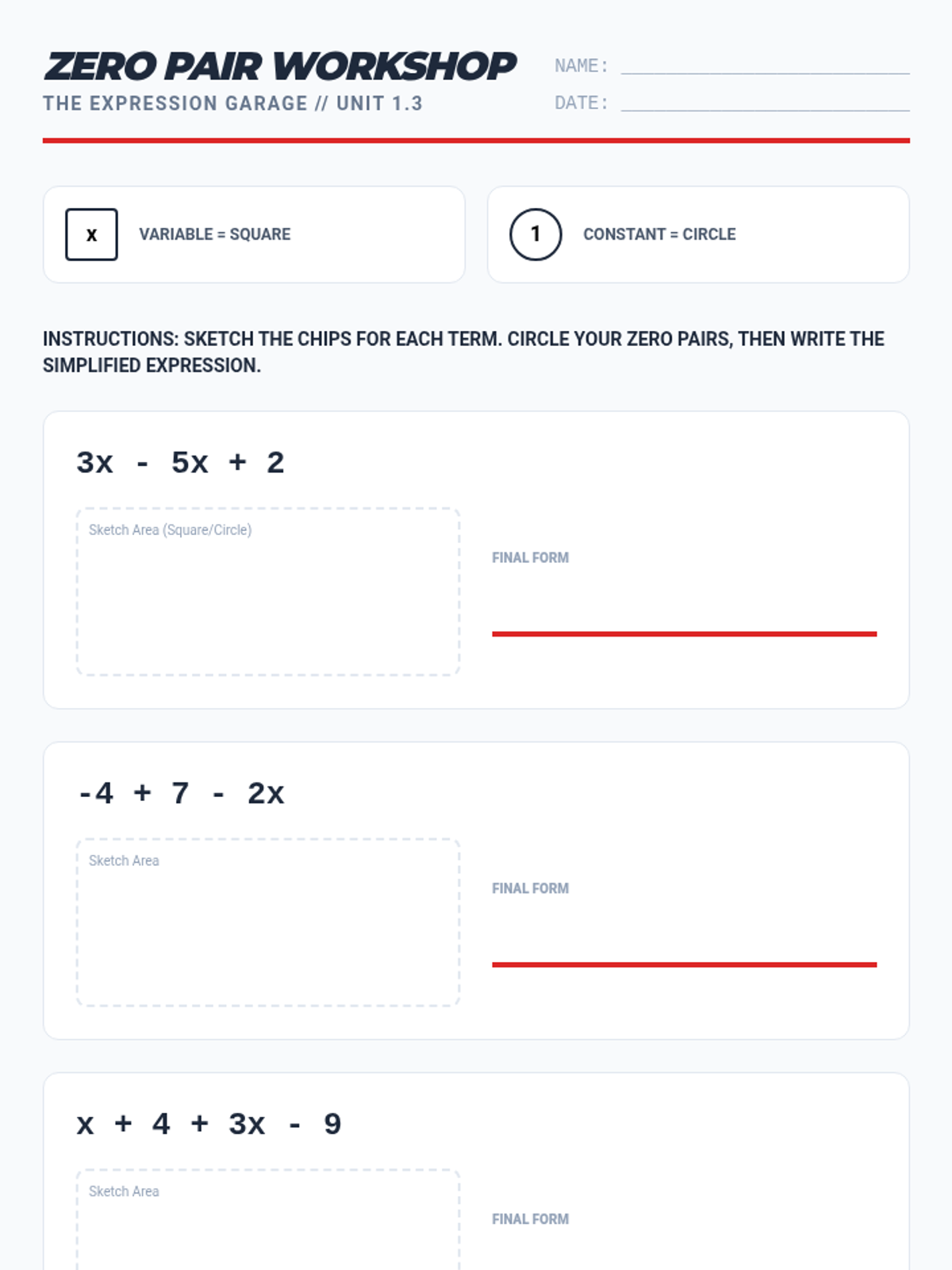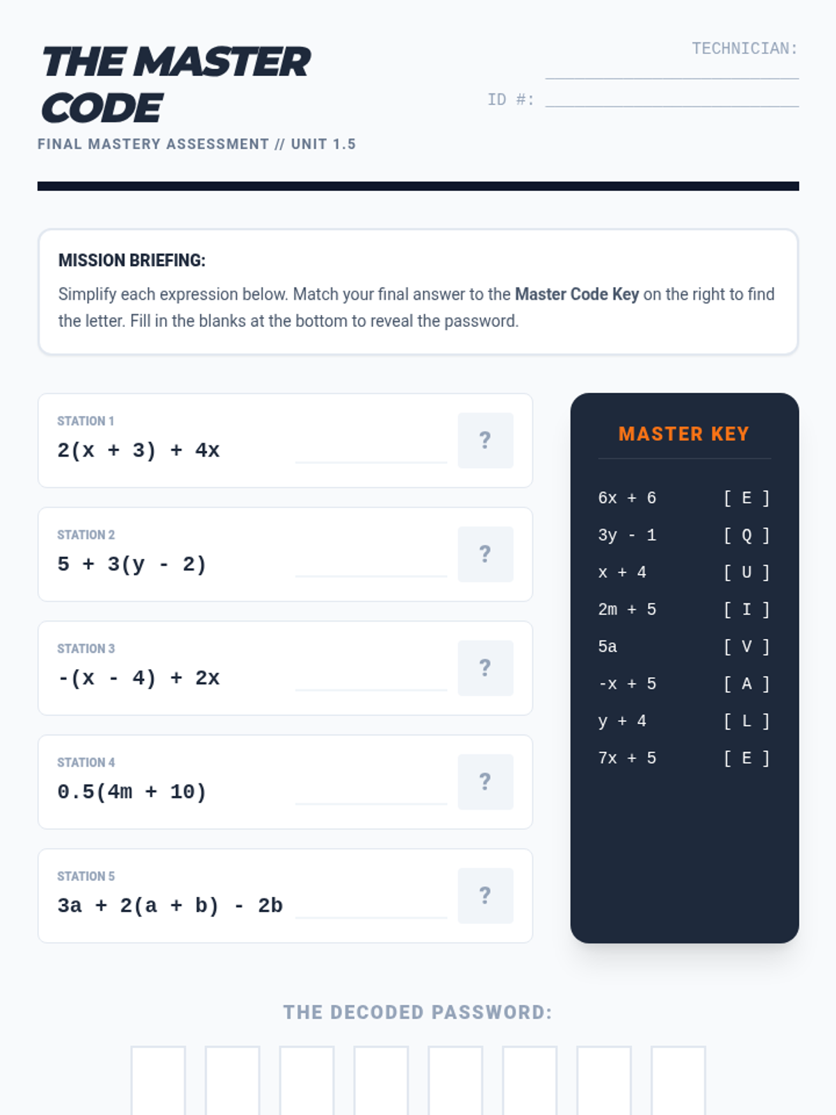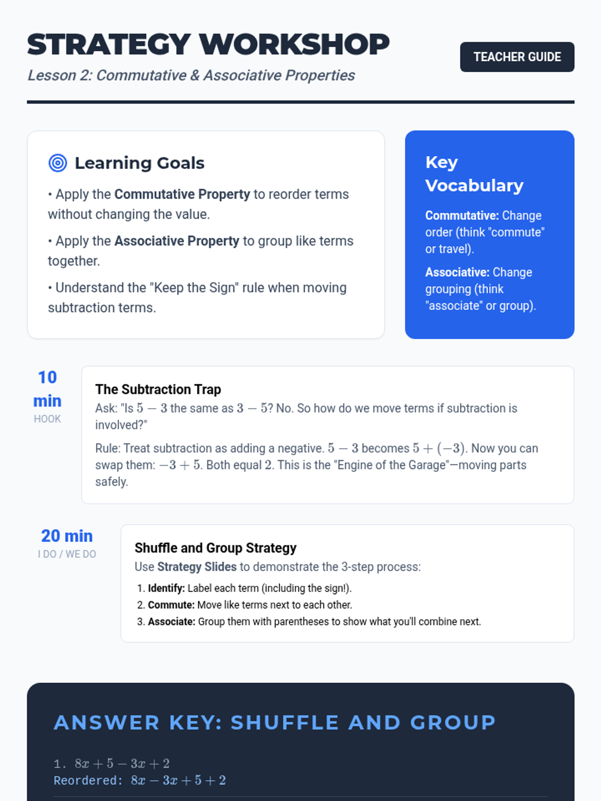 This 5-lesson sequence for 7th-grade students focuses on identifying, reordering, and combining like terms within algebraic expressions. Using a 'Math Garage' theme, students move from basic identification of terms to mastering complex simplification with rational numbers and parentheses through gamified and hands-on activities.