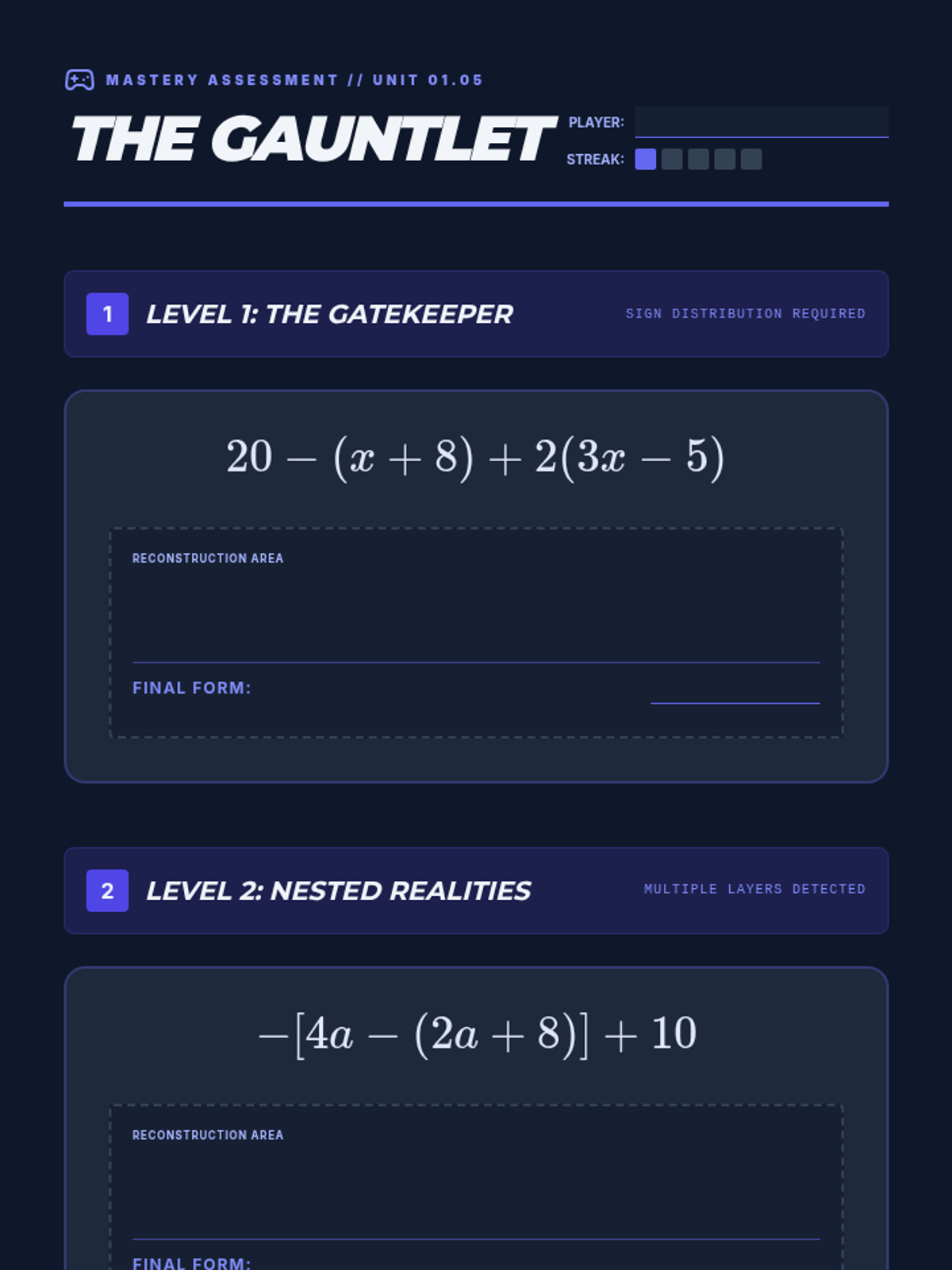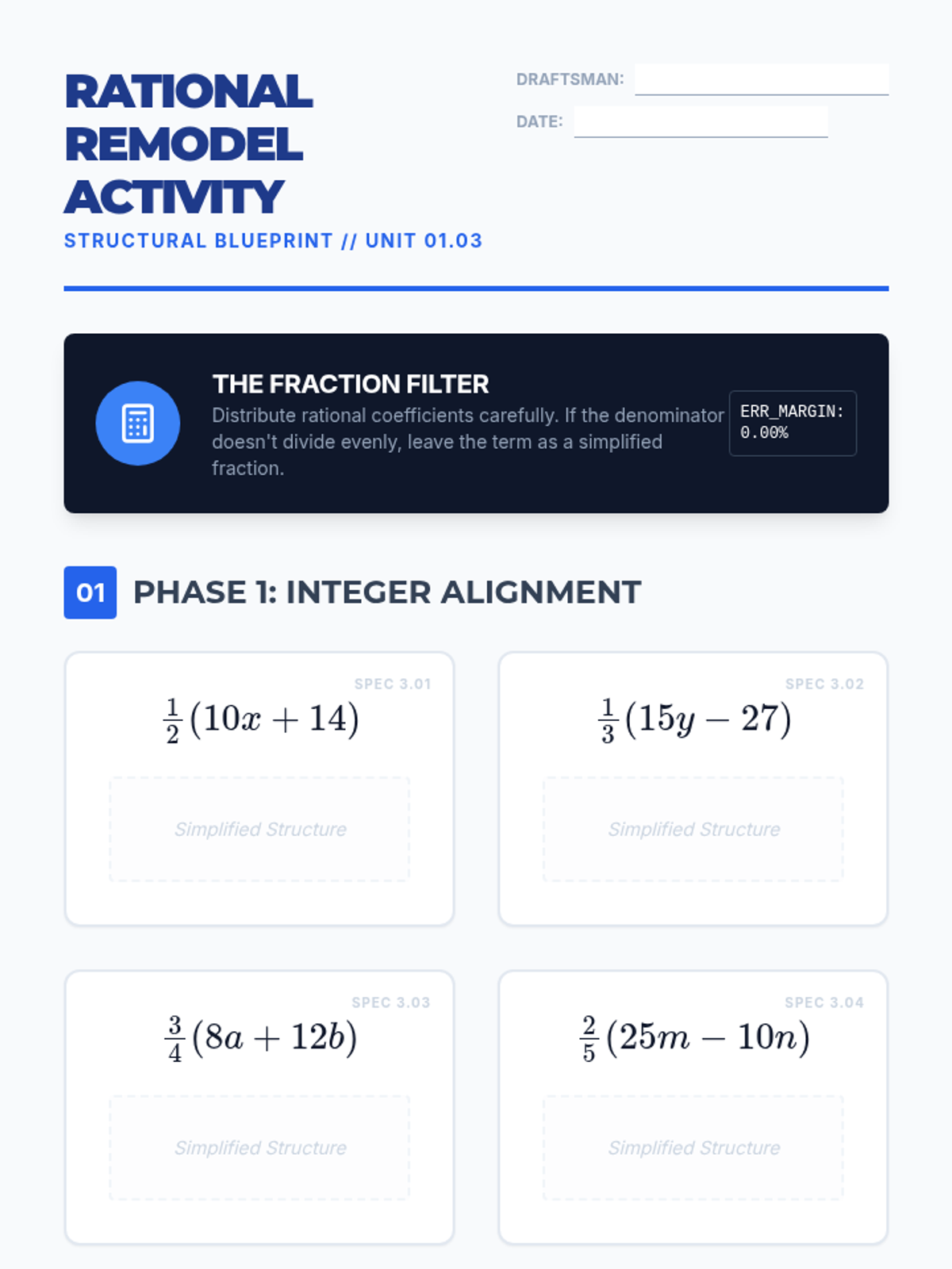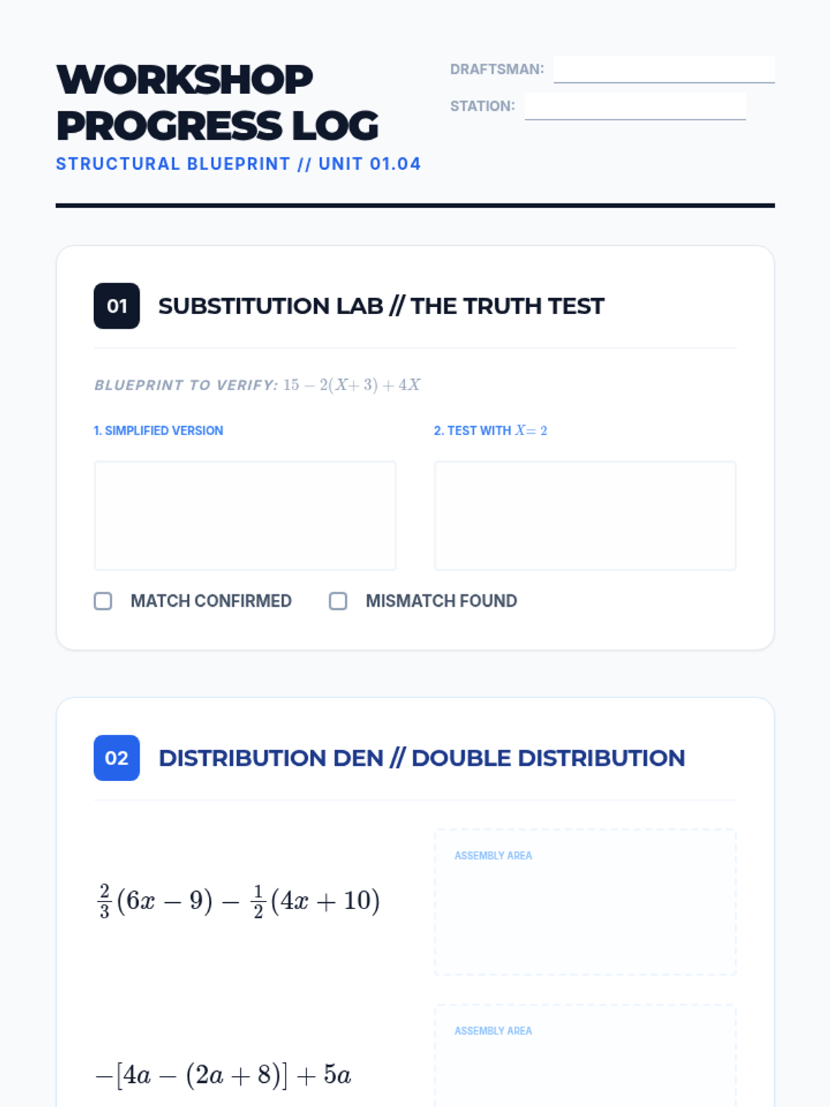 An 8th-grade algebra sequence focused on the precision of expression simplification, covering negative distribution, nested grouping symbols, and fractional coefficients through a technical blueprint theme.