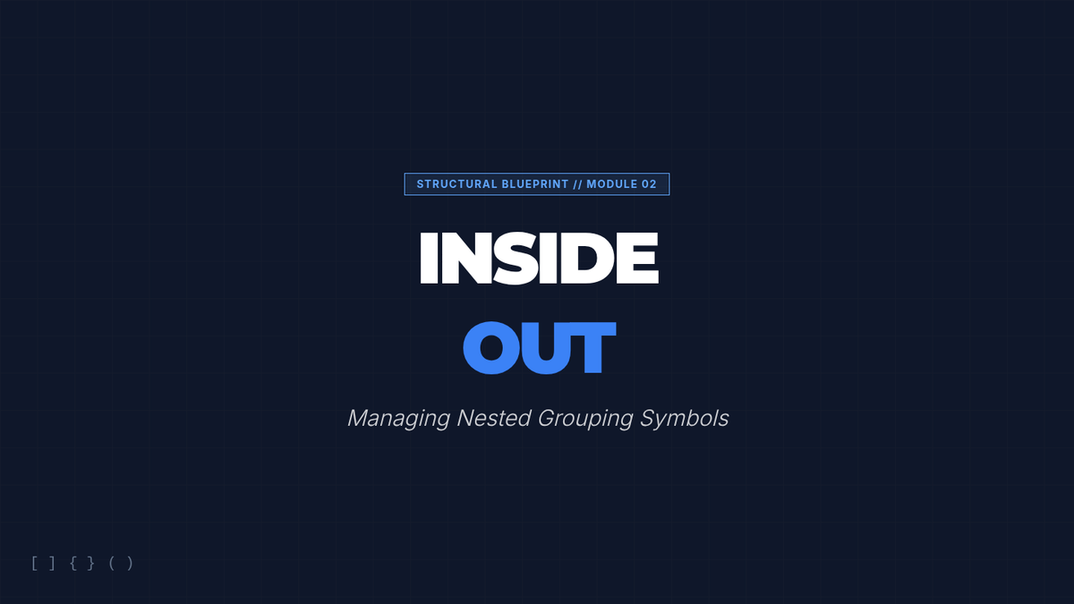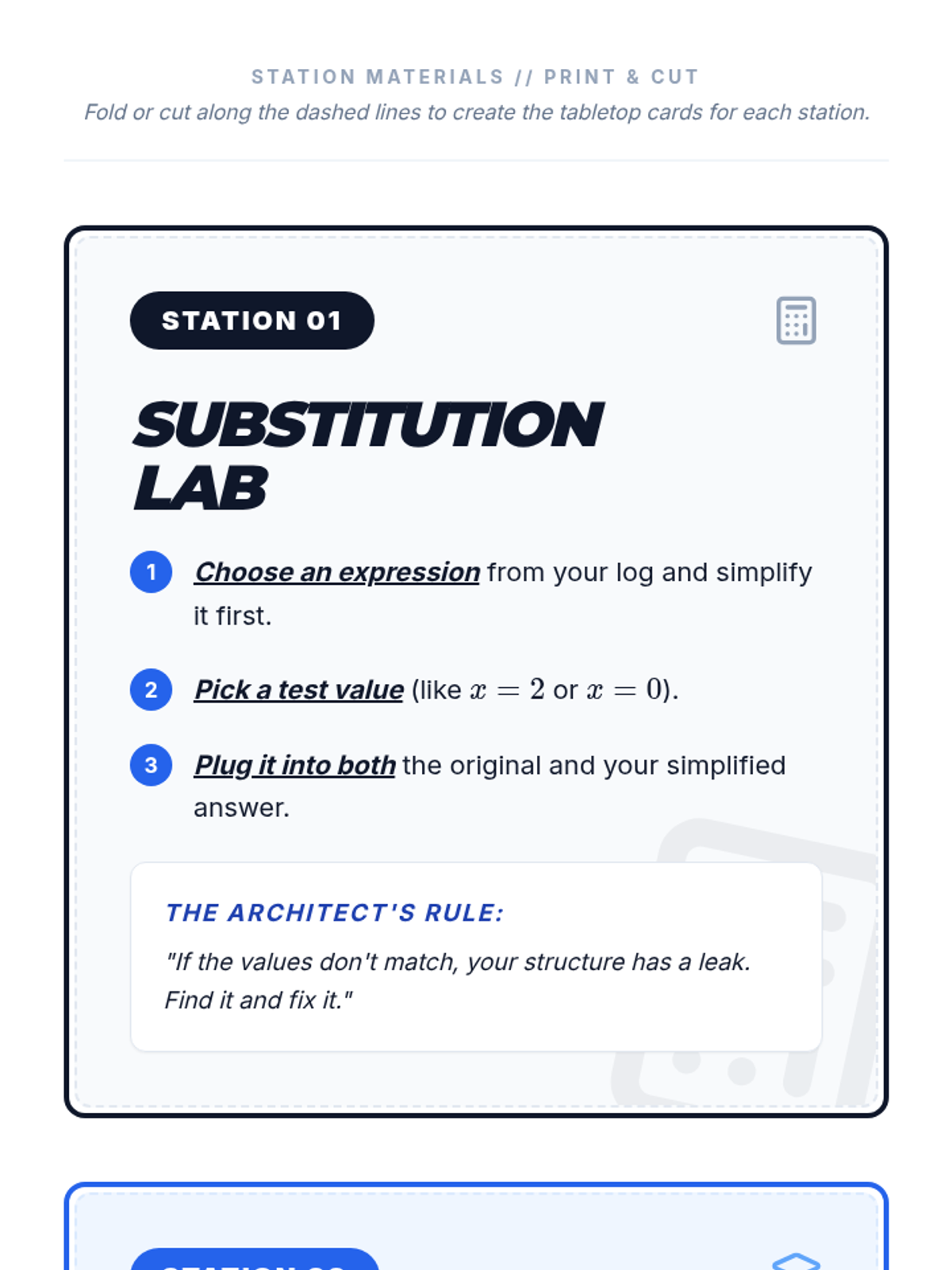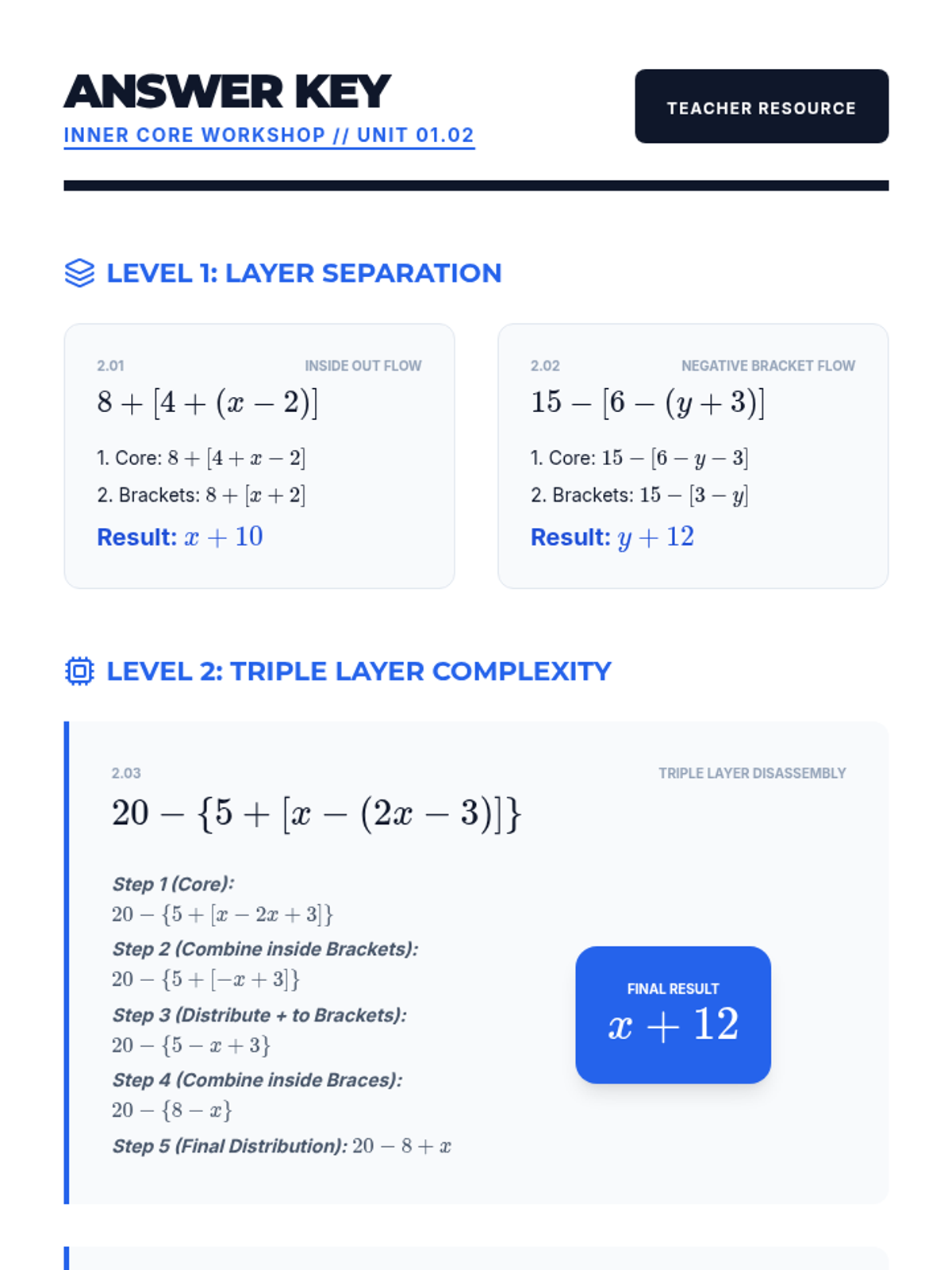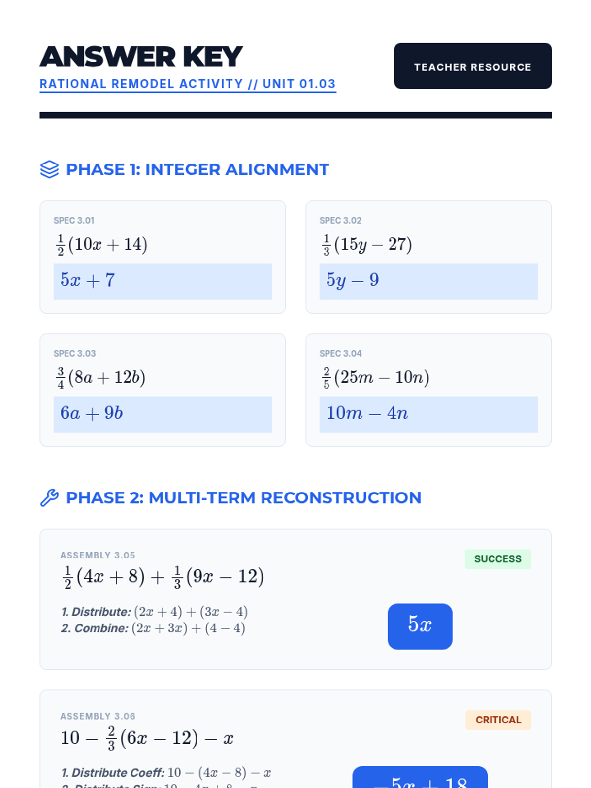 An 8th-grade algebra sequence focused on the precision of expression simplification, covering negative distribution, nested grouping symbols, and fractional coefficients through a technical blueprint theme.